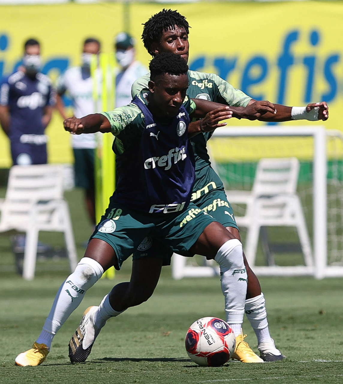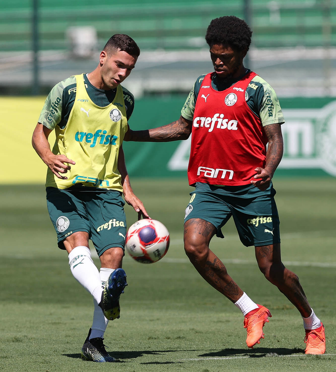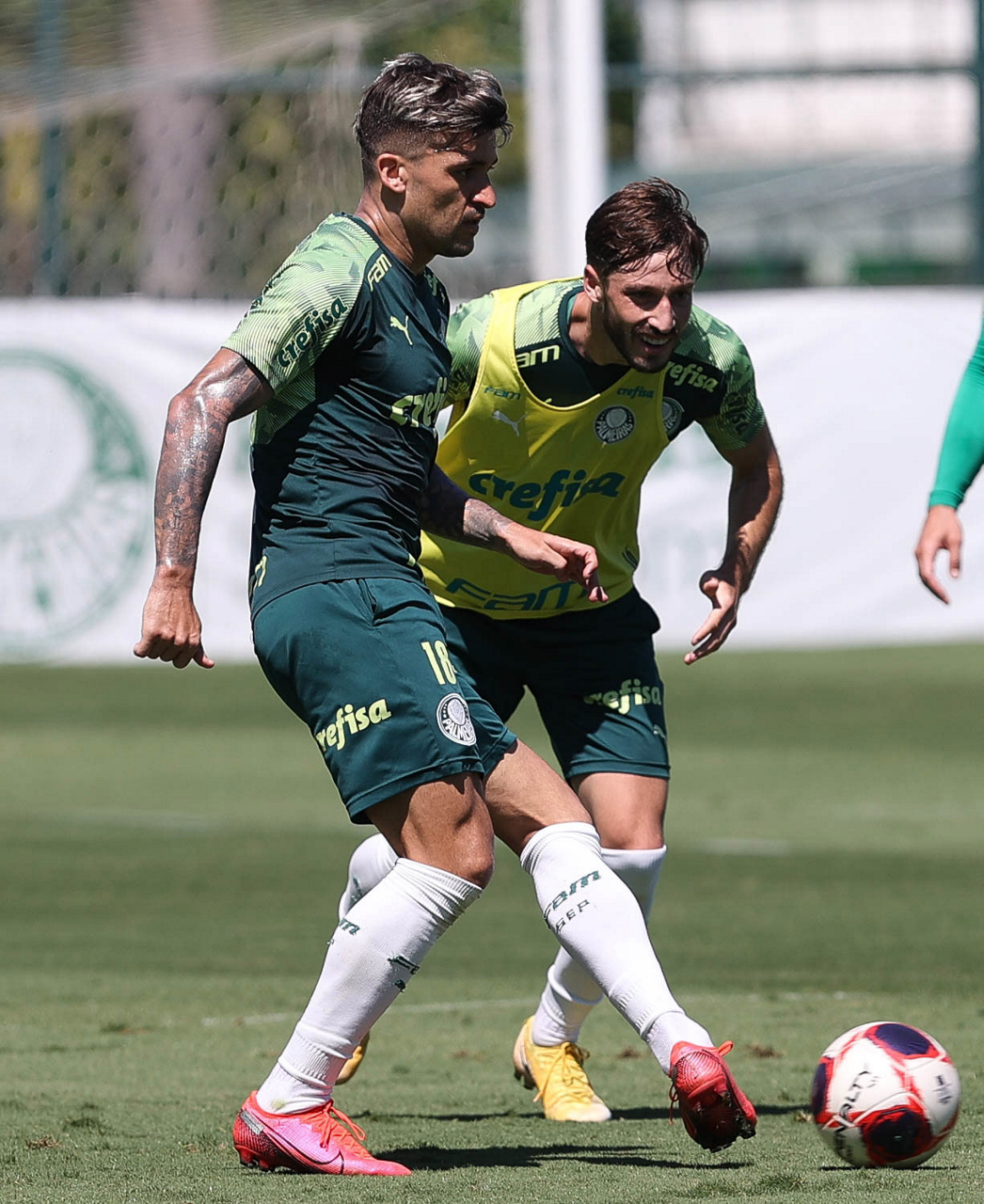 Os jogadores Victor Luis e Matías Viña (D), da SE Palmeiras, durante treinamento, na Academia de Futebol. (Foto: Cesar Greco)