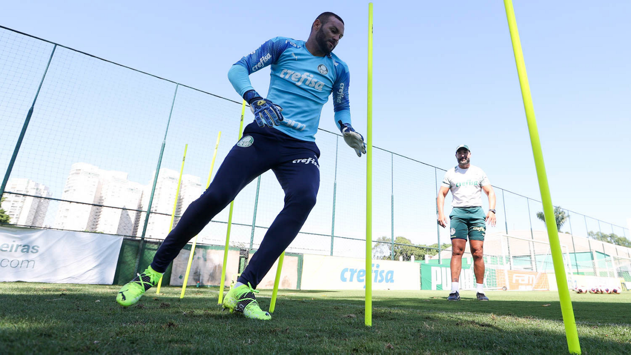 O goleiro Weverton e o preparador de goleiro Rogerio Godoy (D), da SE Palmeiras, durante treinamento, na Academia de Futebol. (Foto: Cesar Greco)