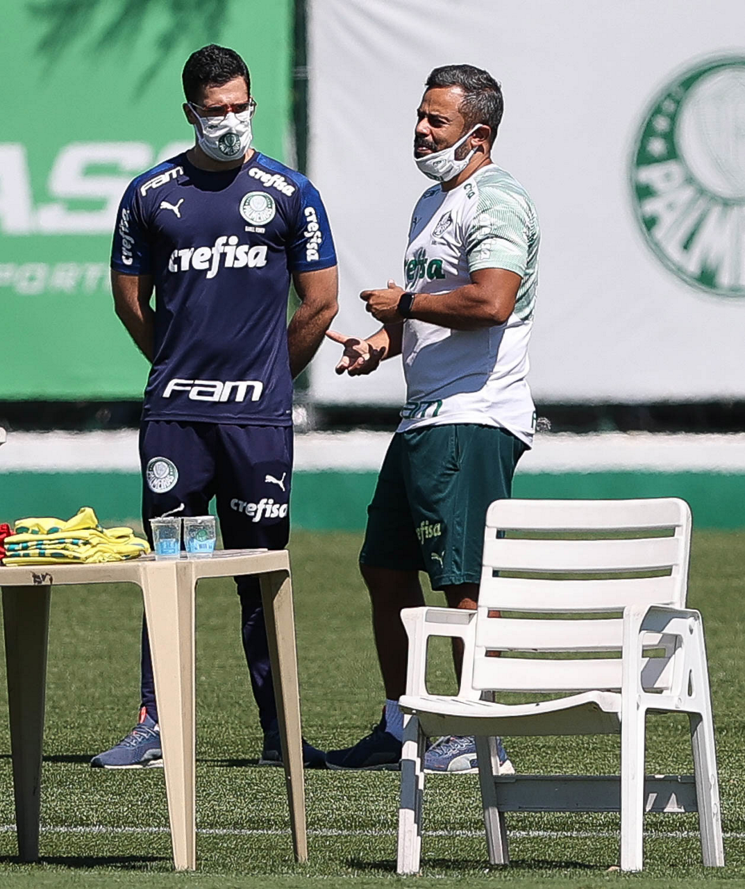 O assessor de imprensa Daniel Romeu e o coordenador científico Daniel Gonçalves (D), da SE Palmeiras, durante treinamento, na Academia de Futebol. (Foto: Cesar Greco)