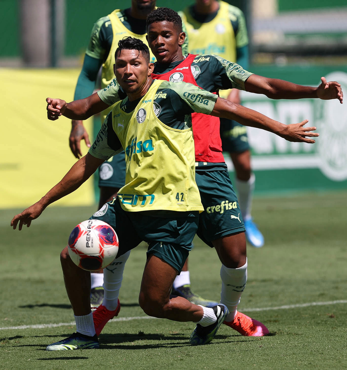 Os jogadores Garcia e Rony (D), da SE Palmeiras, durante treinamento, na Academia de Futebol. (Foto: Cesar Greco)