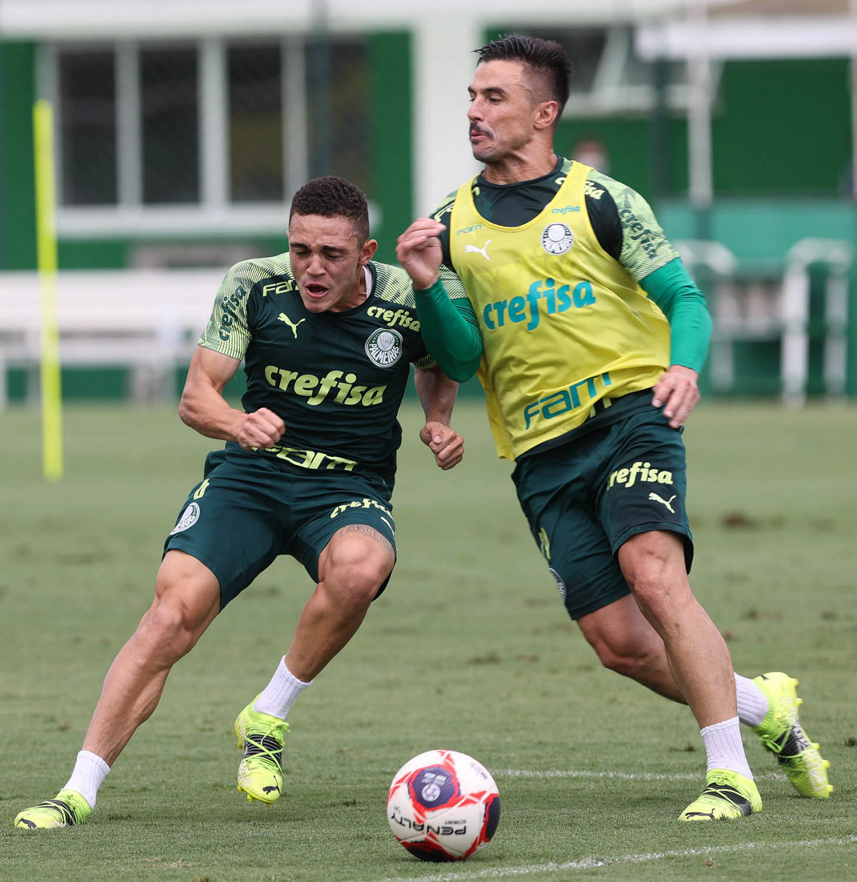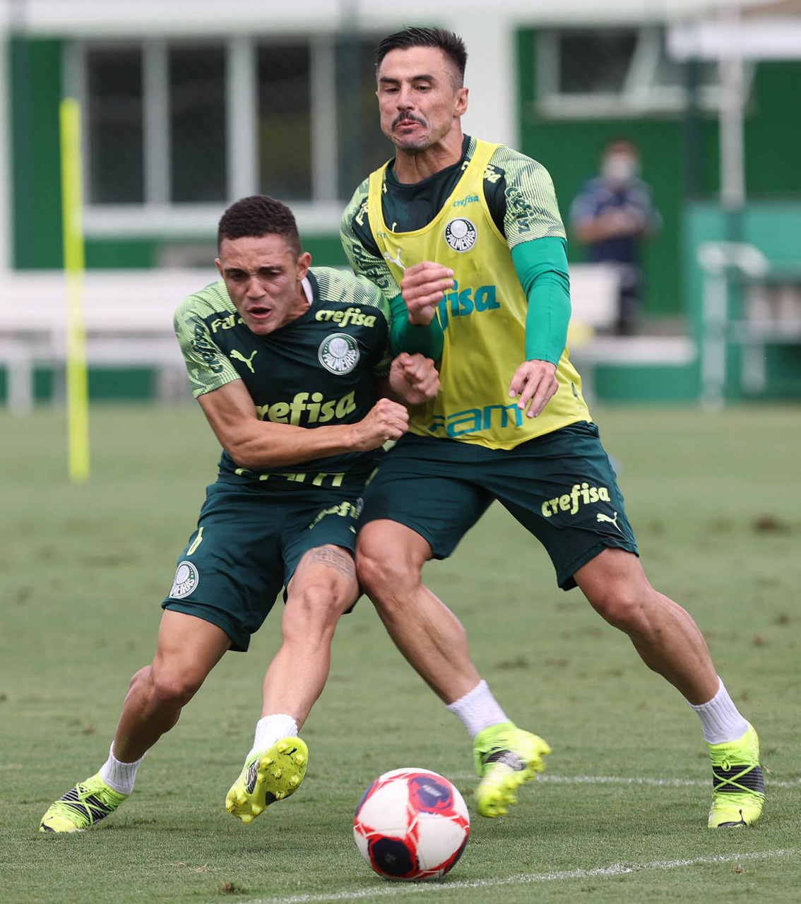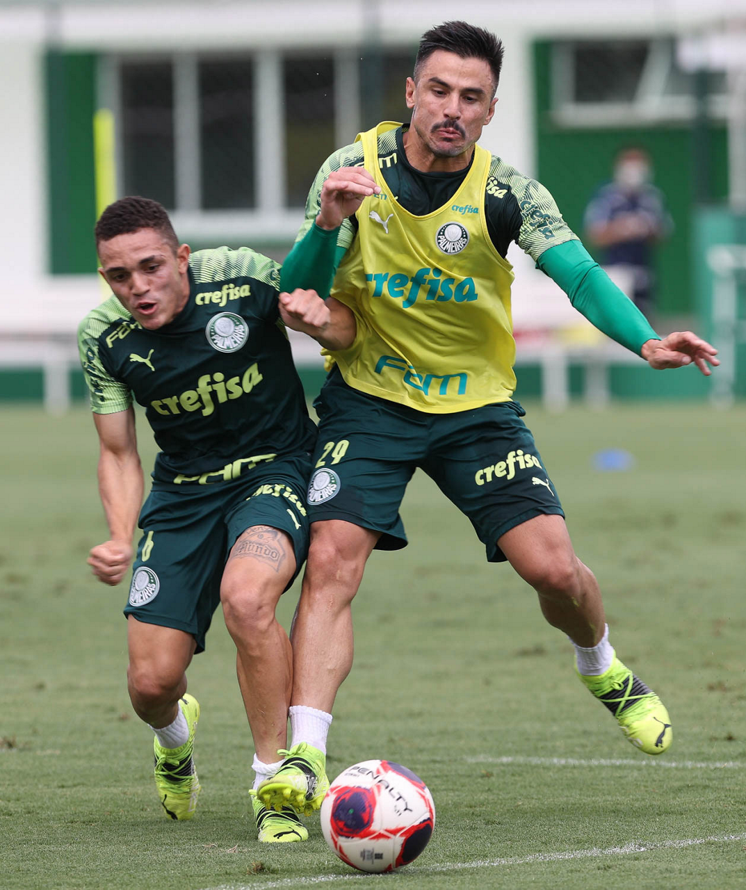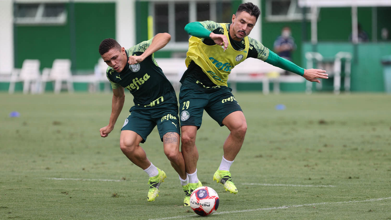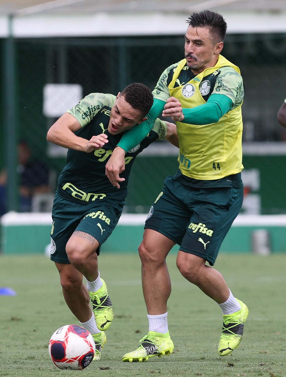 Os jogadores Angulo e Raphael Veiga (D), da SE Palmeiras, durante treinamento, na Academia de Futebol. (Foto: Cesar Greco)