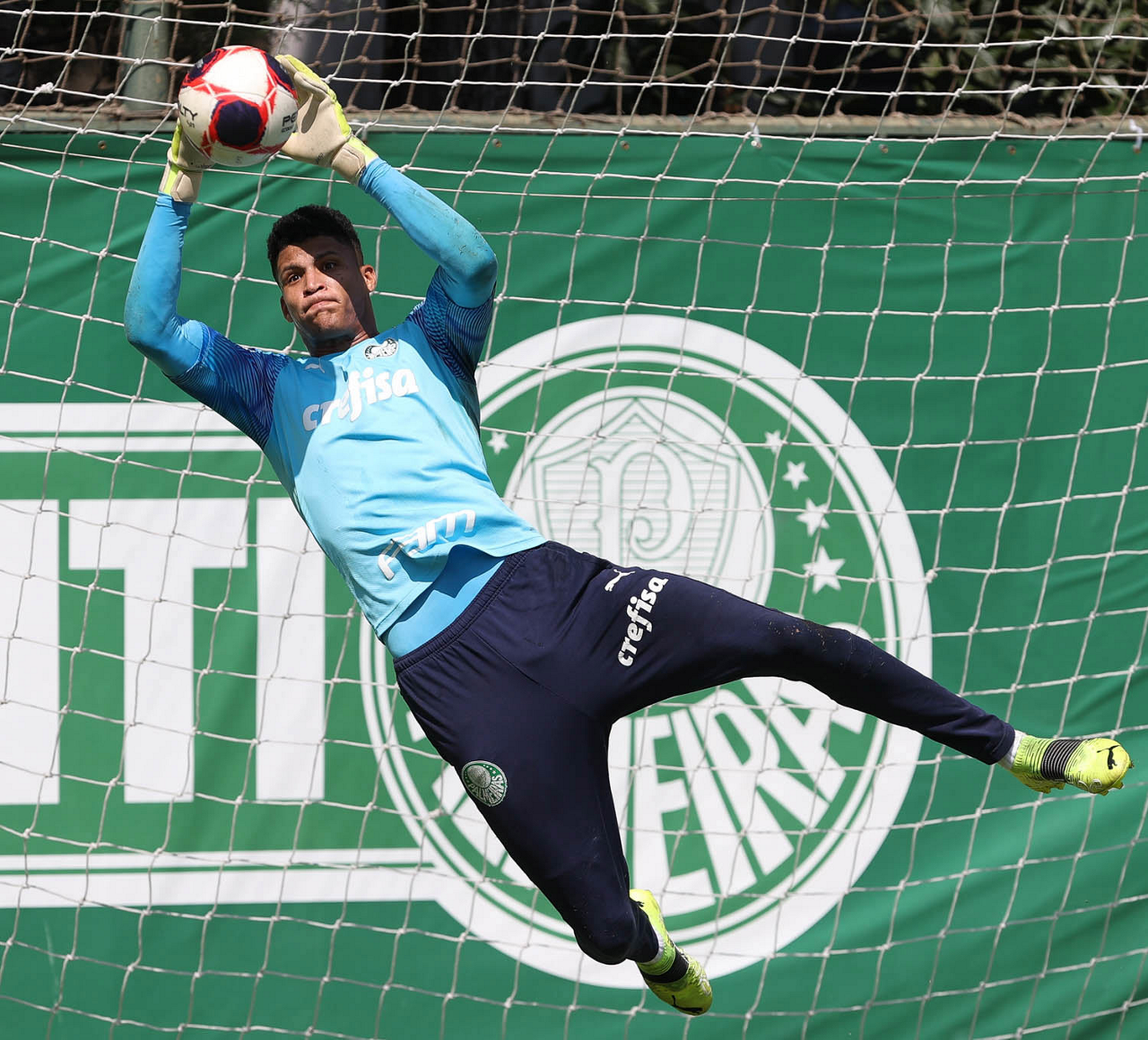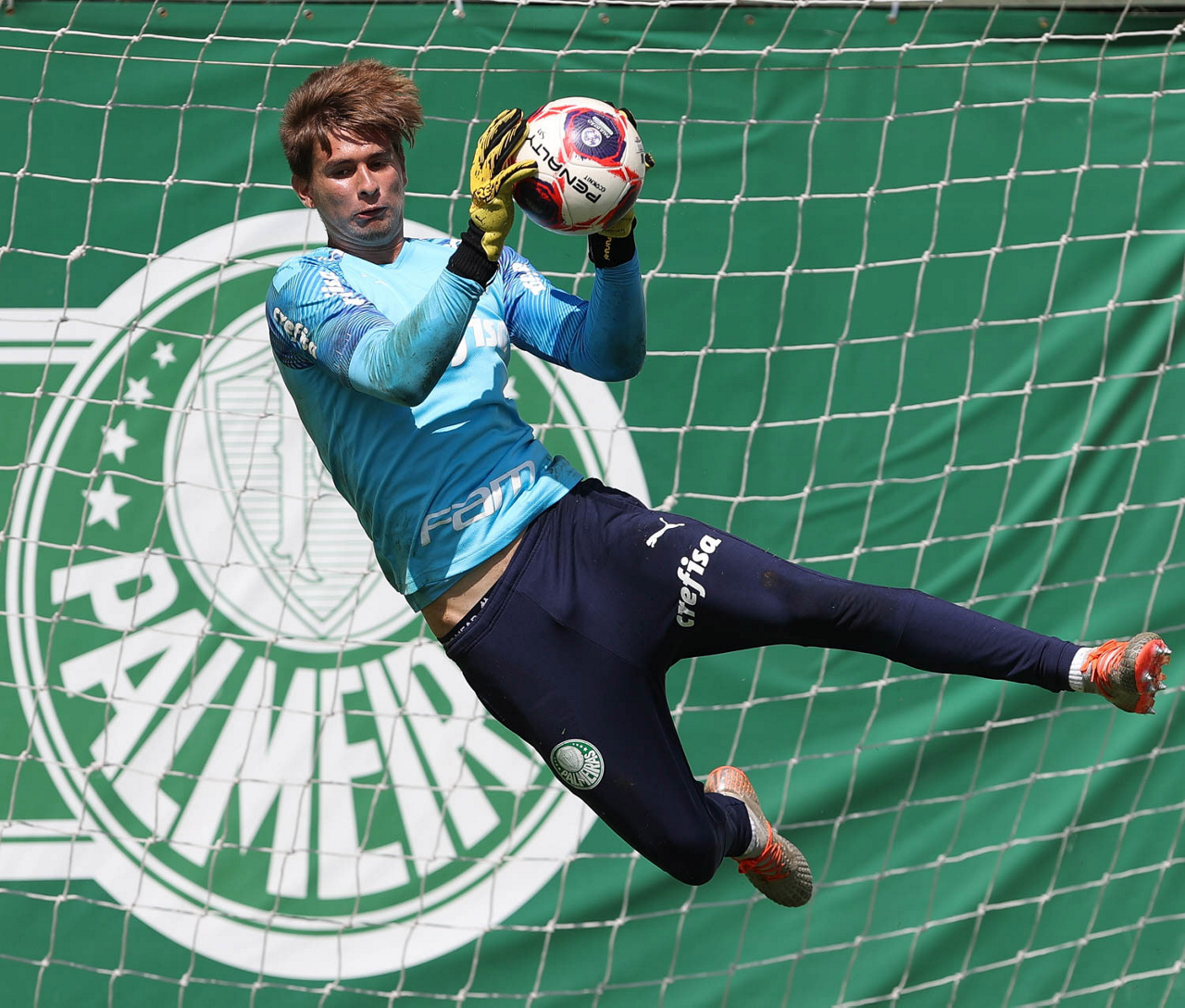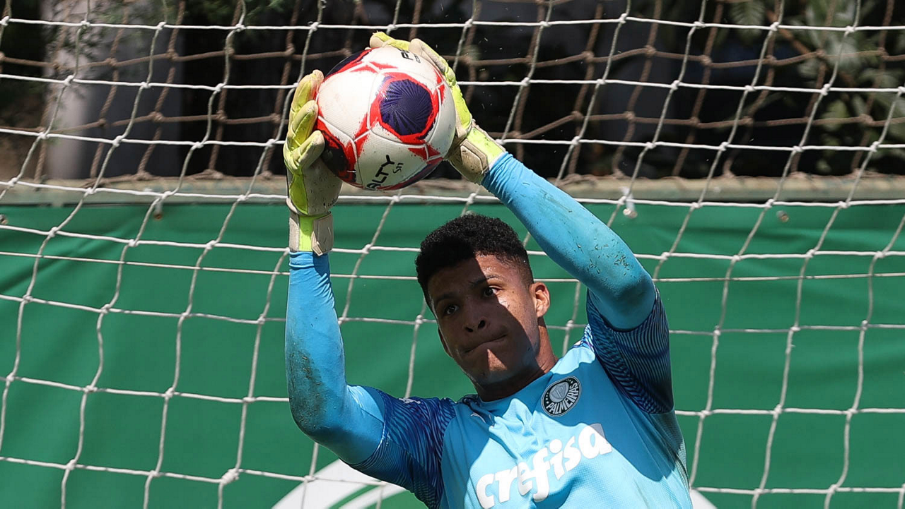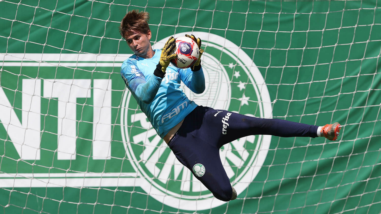 O goleiro Mateus, da SE Palmeiras, durante treinamento, na Academia de Futebol. (Foto: Cesar Greco)