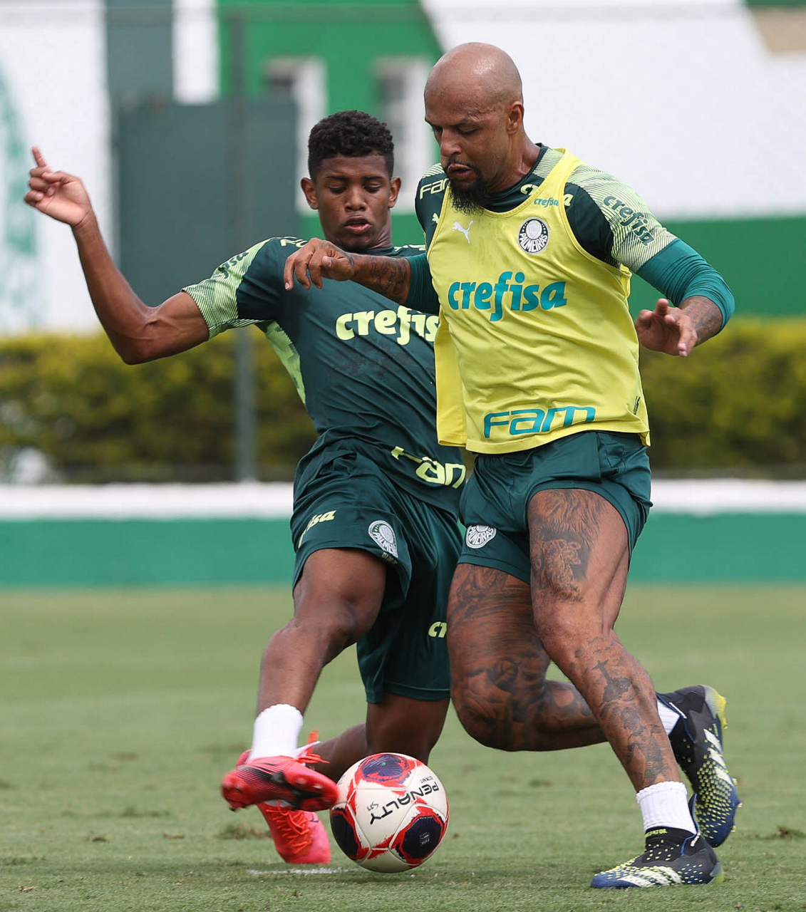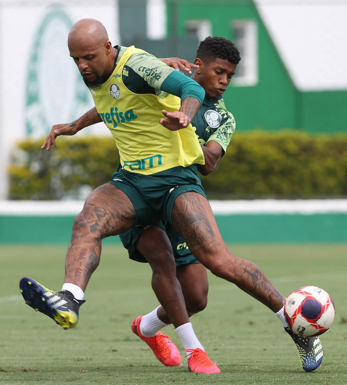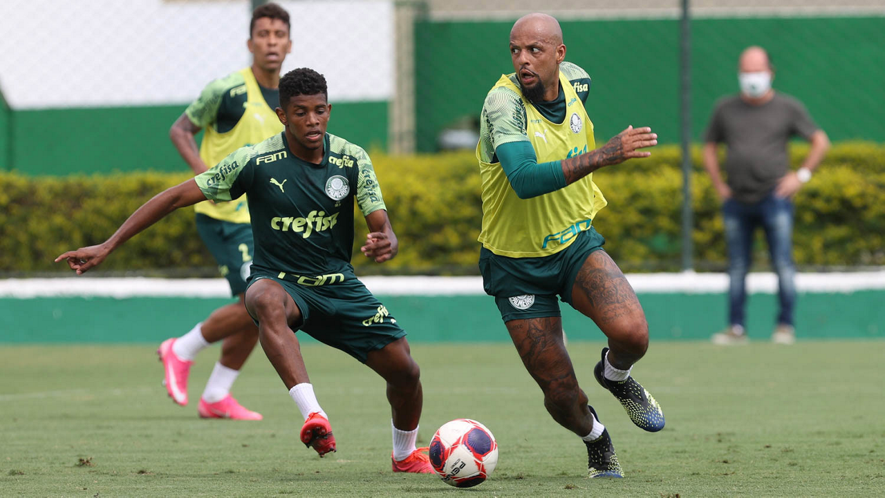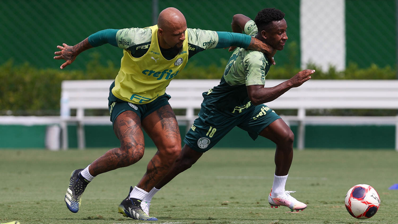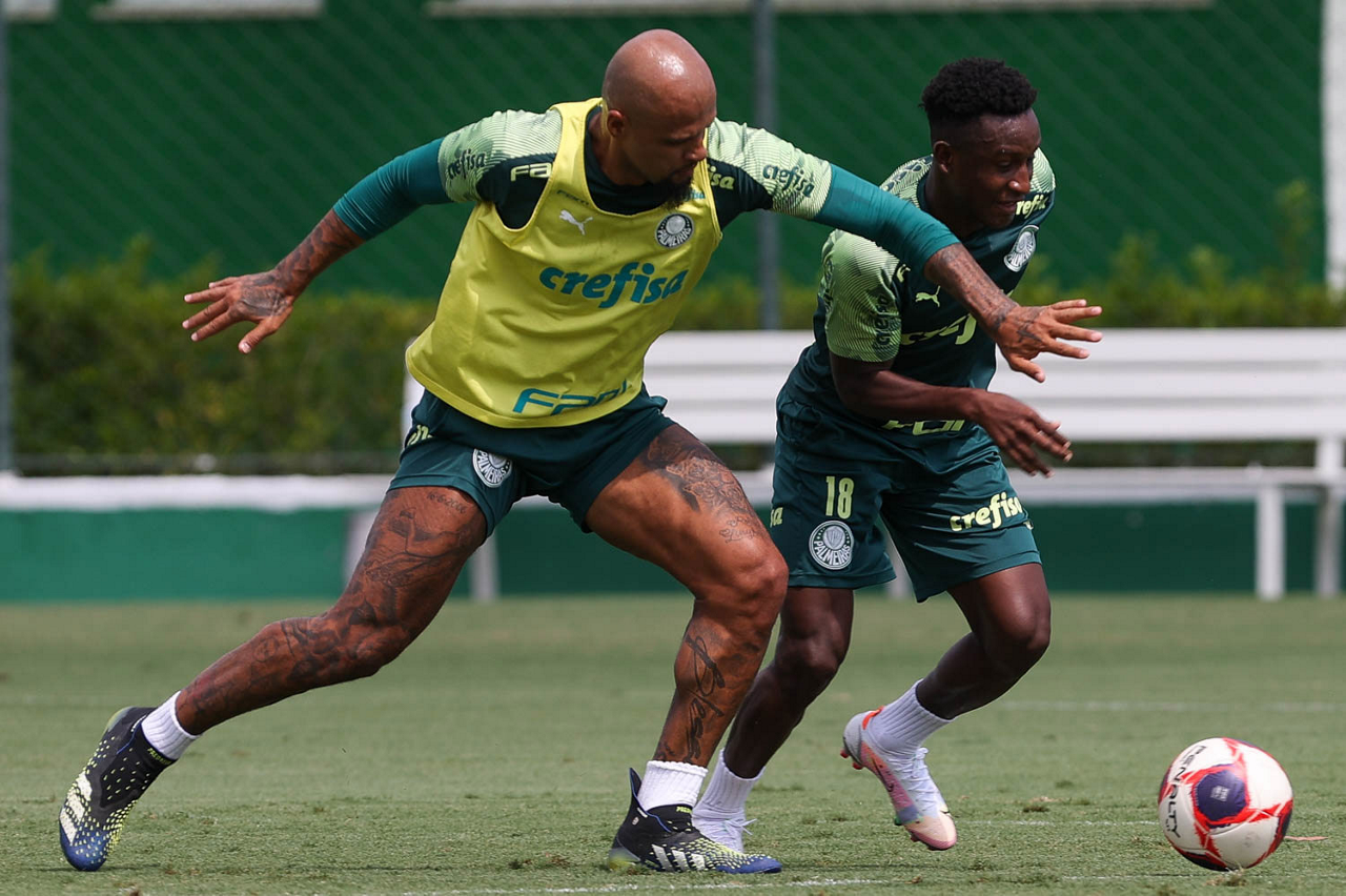 Os jogadores Felipe Melo e Angulo (D), da SE Palmeiras, durante treinamento, na Academia de Futebol. (Foto: Cesar Greco)