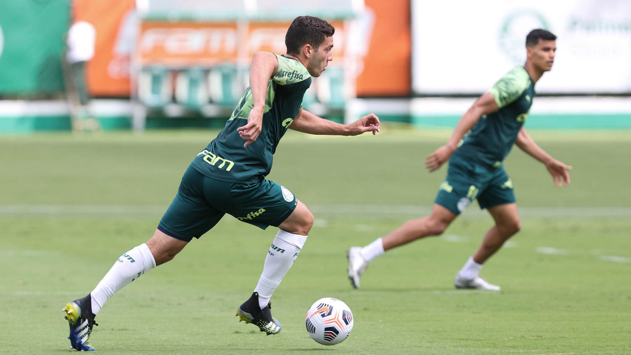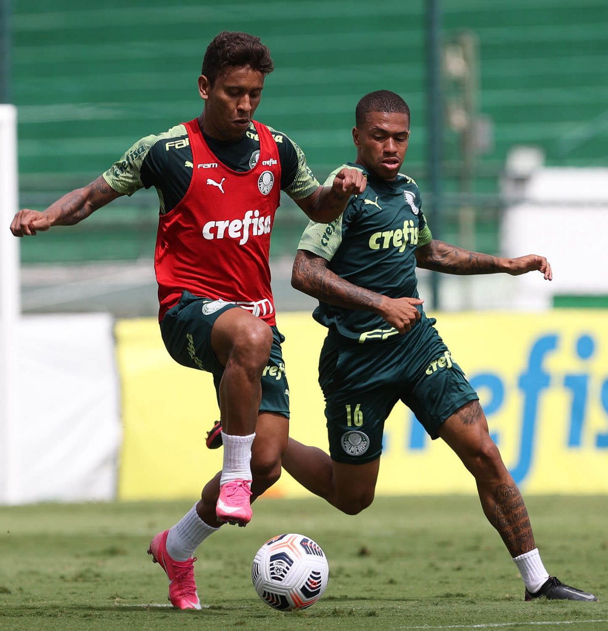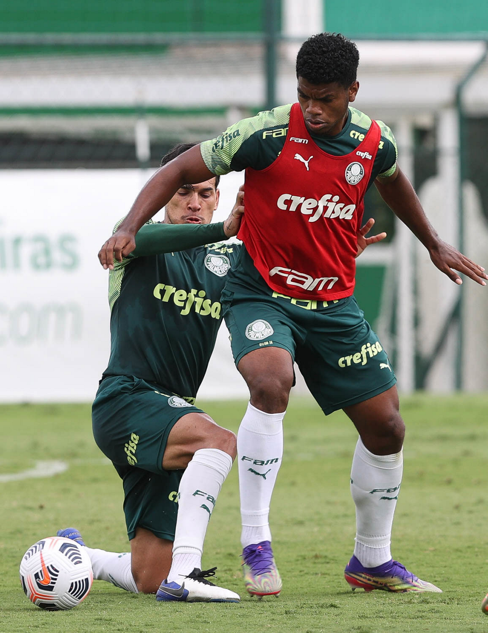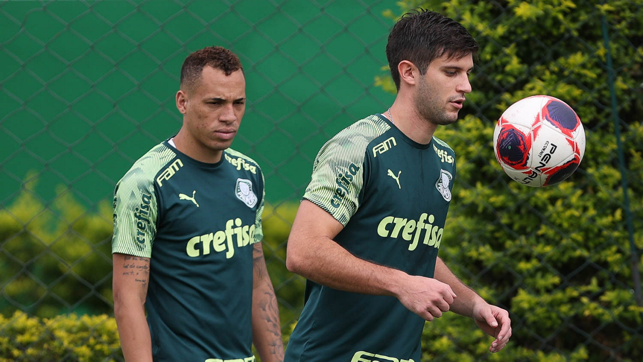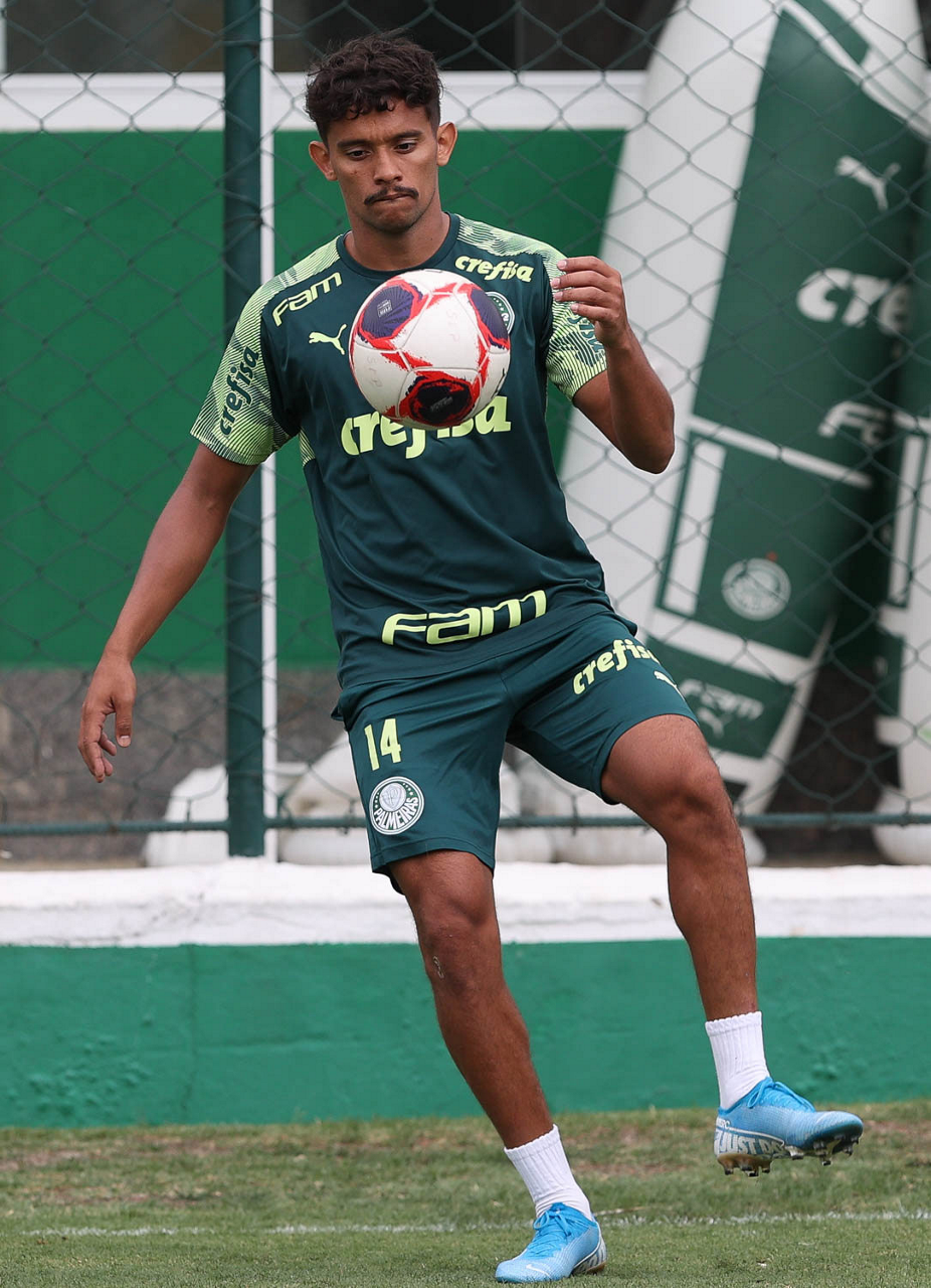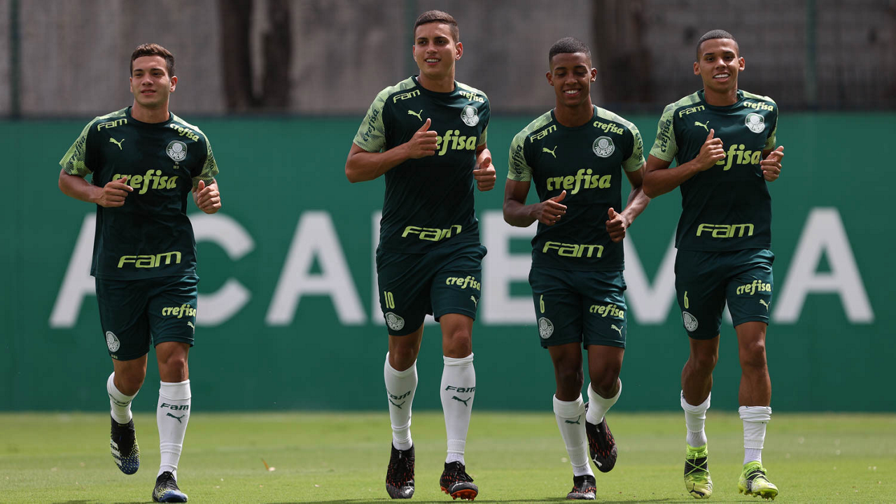 Os jogadores Raphael Veiga, Gabriel Silva, o goleiro Jailson, Gustavo Gómez, Wesley, Vanderlan, Danilo Barbosa, Fabinho e Luan (E/D em pé) e Rafael Elias, Danilo, Lucas Esteves, Garcia e Rony (E/D agachados), da SE Palmeiras, durante treinamento, na Academia de Futebol. (Foto: Cesar Greco)
