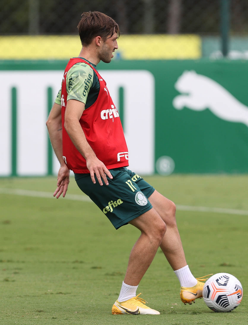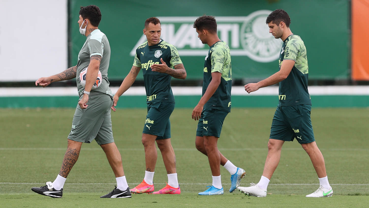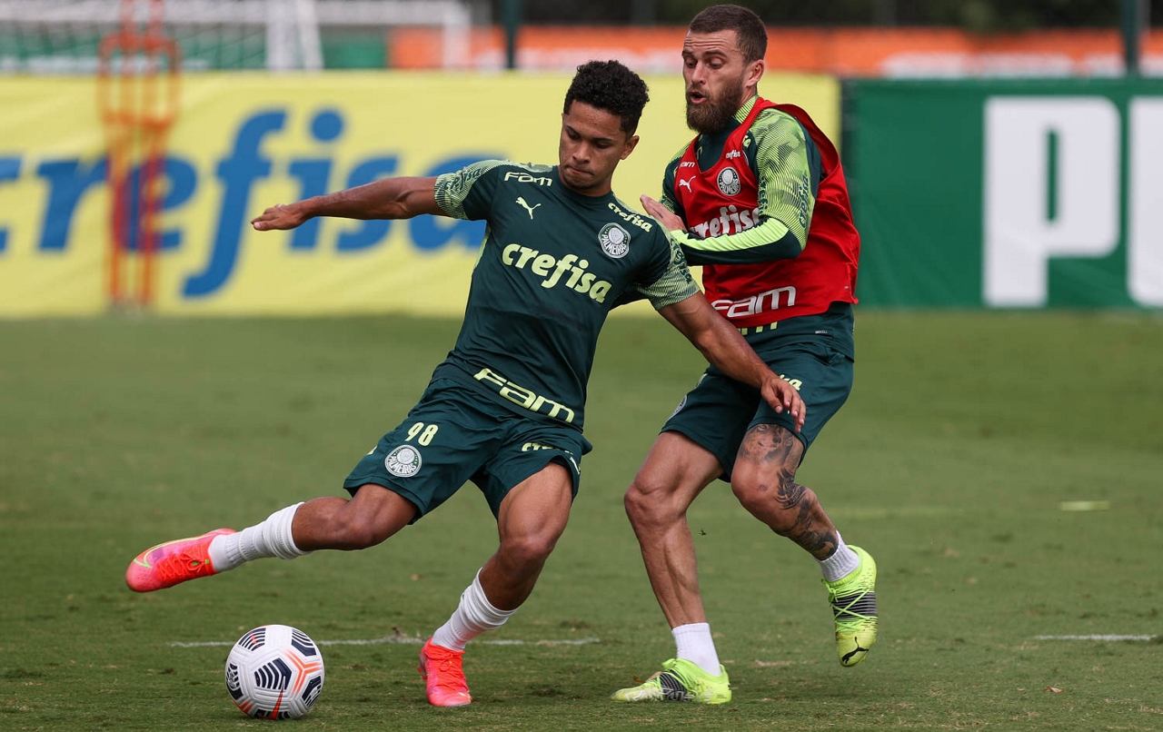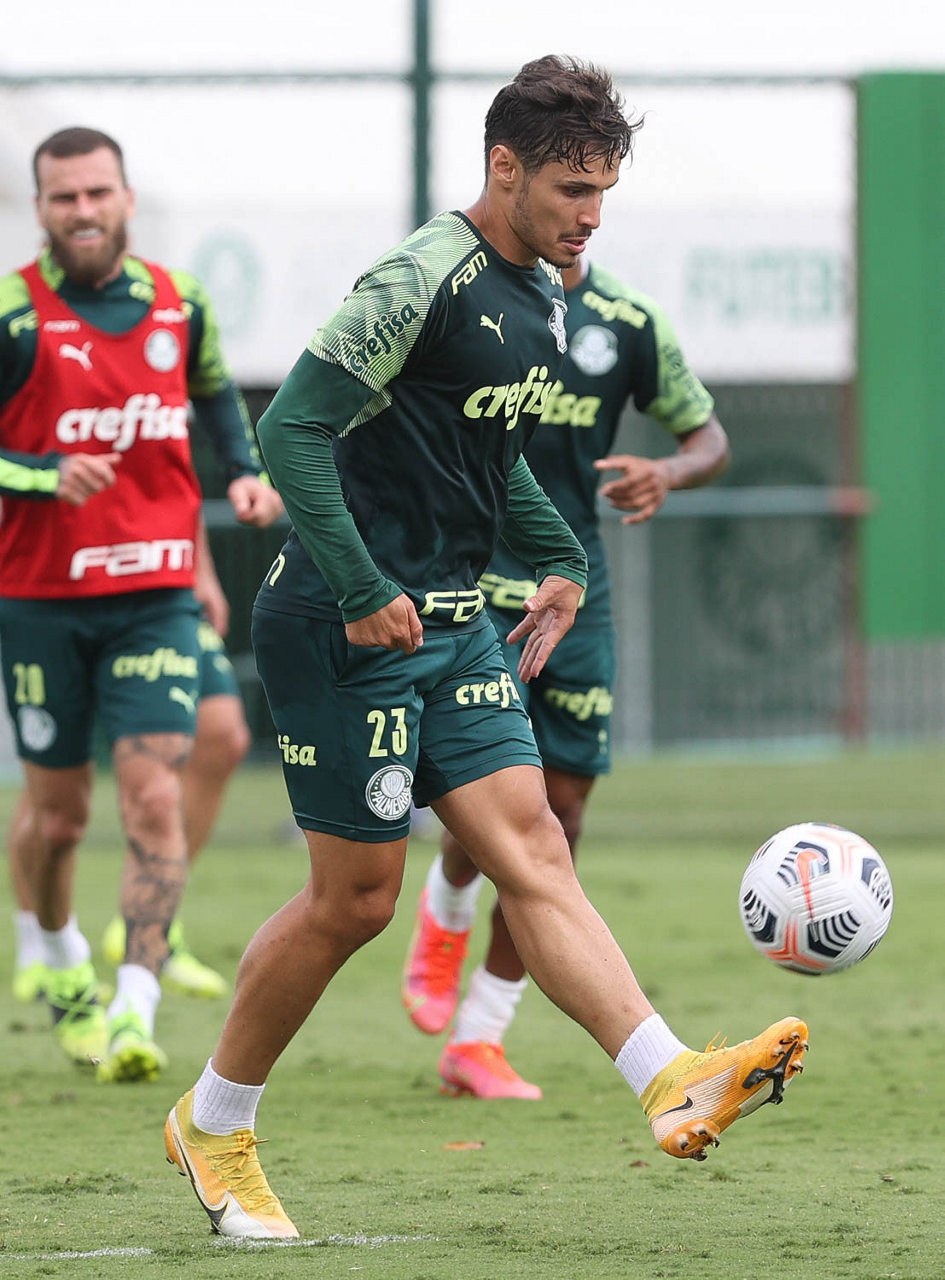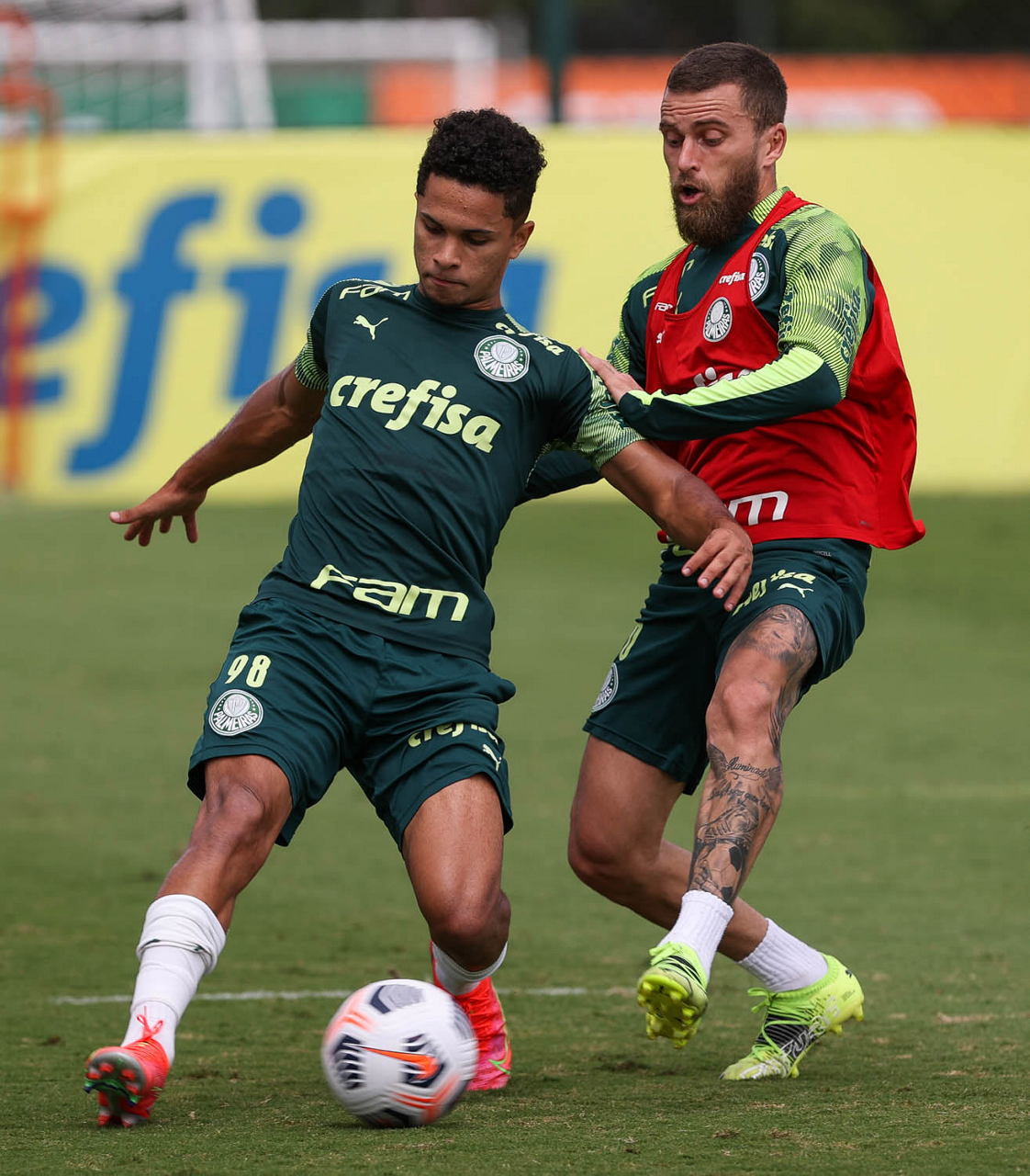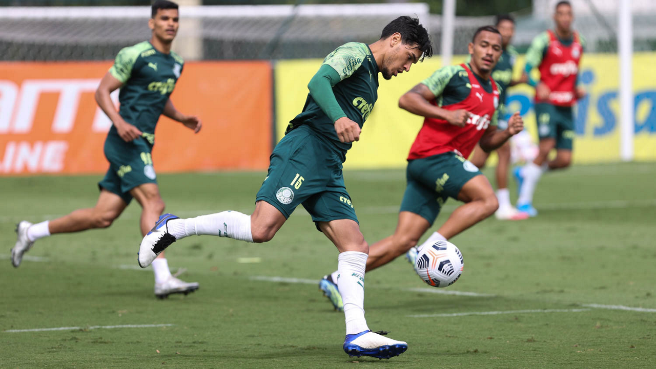 Os jogadores Raphael Veiga, Gabriel Silva, o goleiro Jailson, Gustavo Gómez, Wesley, Vanderlan, Danilo Barbosa, Fabinho e Luan (E/D em pé) e Rafael Elias, Danilo, Lucas Esteves, Garcia e Rony (E/D agachados), da SE Palmeiras, durante treinamento, na Academia de Futebol. (Foto: Cesar Greco)
