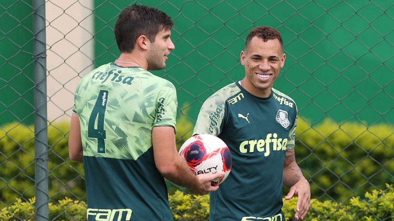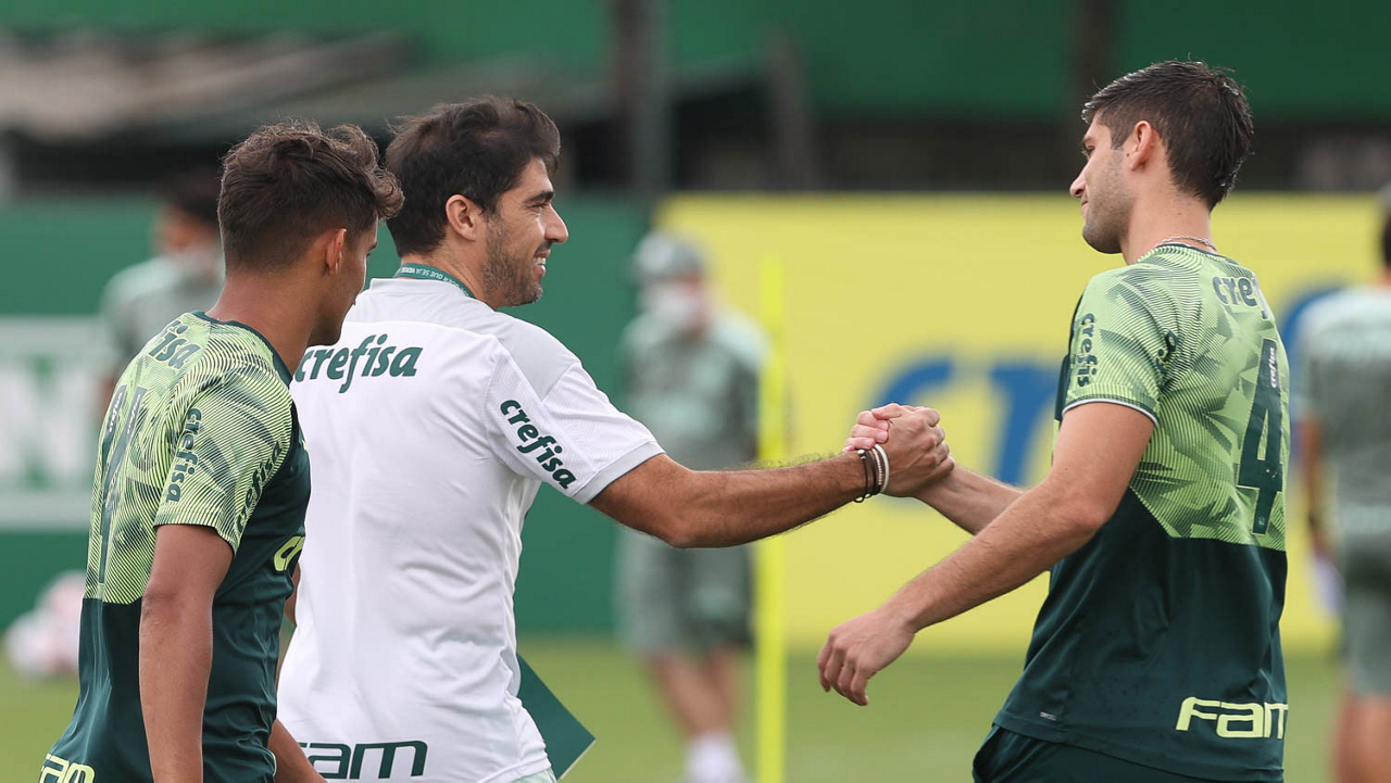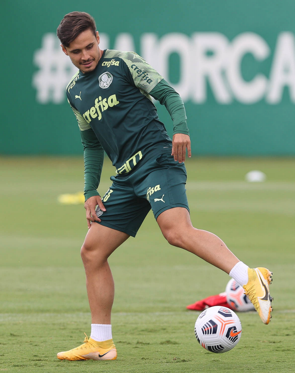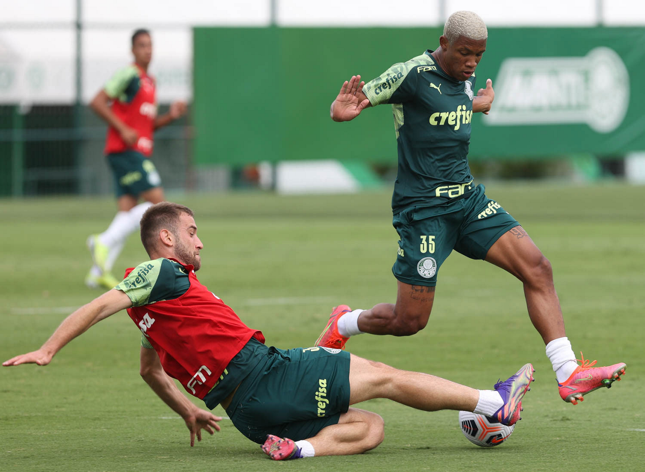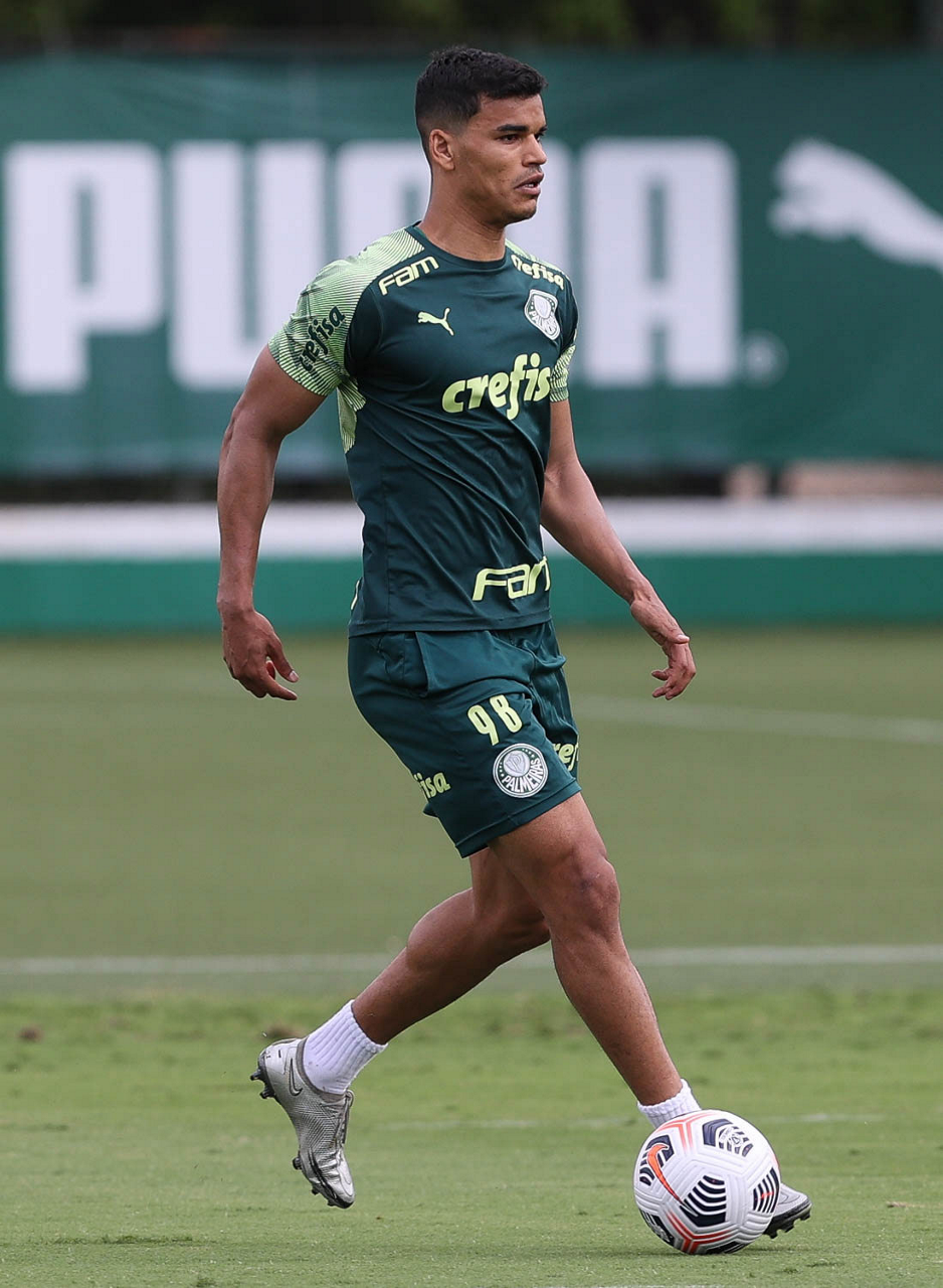 Os jogadores Raphael Veiga, Gabriel Silva, o goleiro Jailson, Gustavo Gómez, Wesley, Vanderlan, Danilo Barbosa, Fabinho e Luan (E/D em pé) e Rafael Elias, Danilo, Lucas Esteves, Garcia e Rony (E/D agachados), da SE Palmeiras, durante treinamento, na Academia de Futebol. (Foto: Cesar Greco)