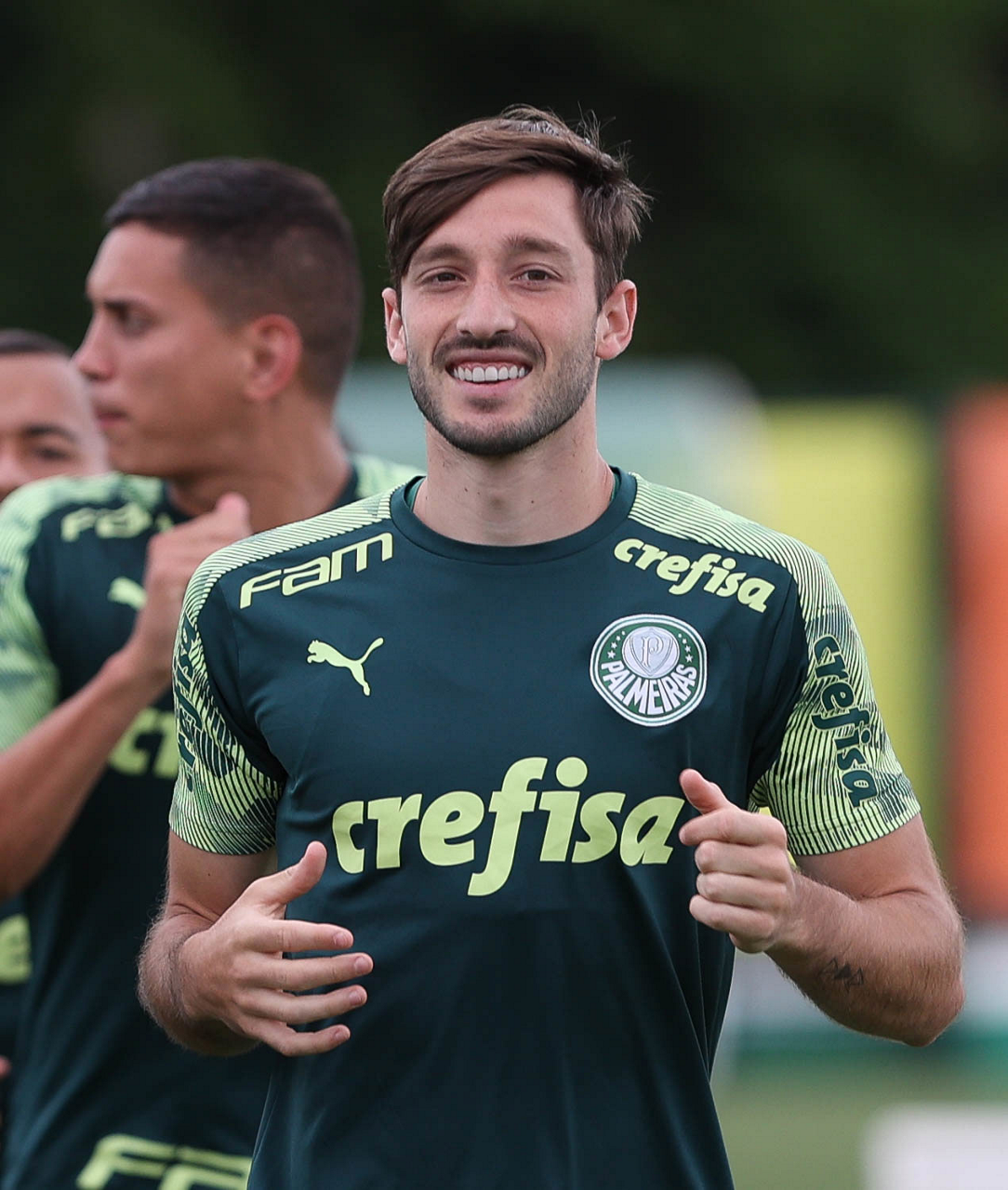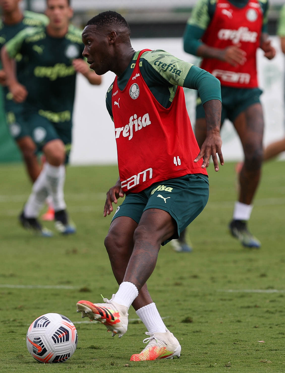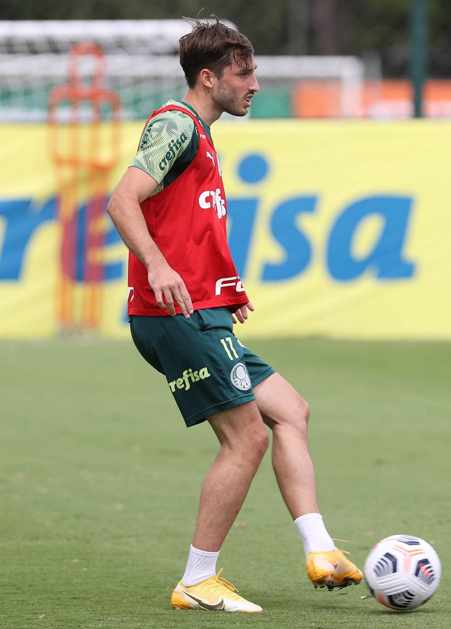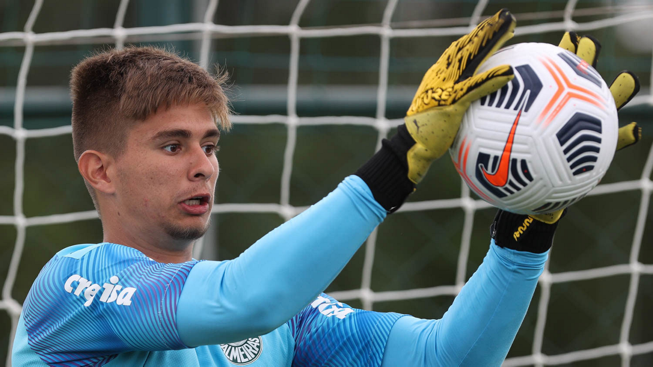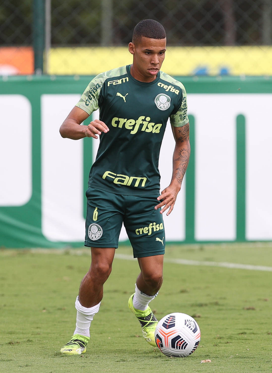 Os jogadores Raphael Veiga, Gabriel Silva, o goleiro Jailson, Gustavo Gómez, Wesley, Vanderlan, Danilo Barbosa, Fabinho e Luan (E/D em pé) e Rafael Elias, Danilo, Lucas Esteves, Garcia e Rony (E/D agachados), da SE Palmeiras, durante treinamento, na Academia de Futebol. (Foto: Cesar Greco)