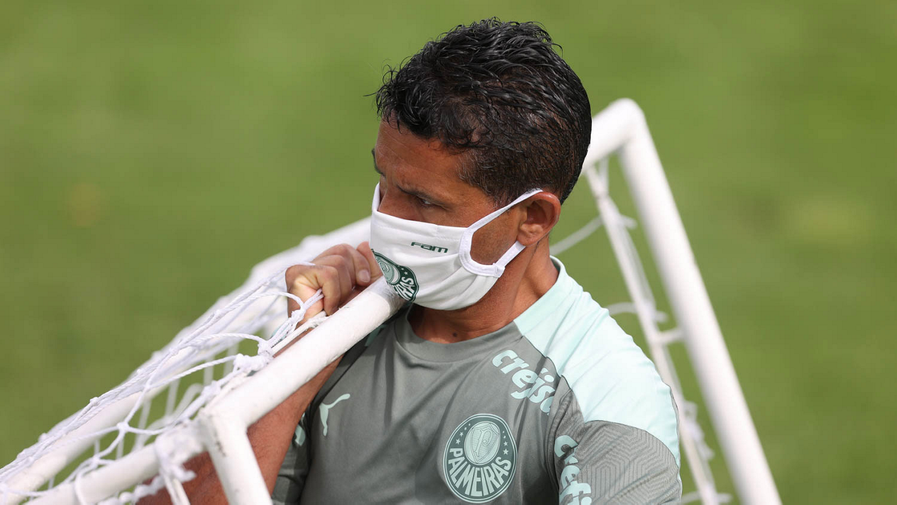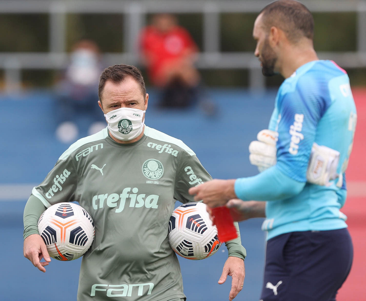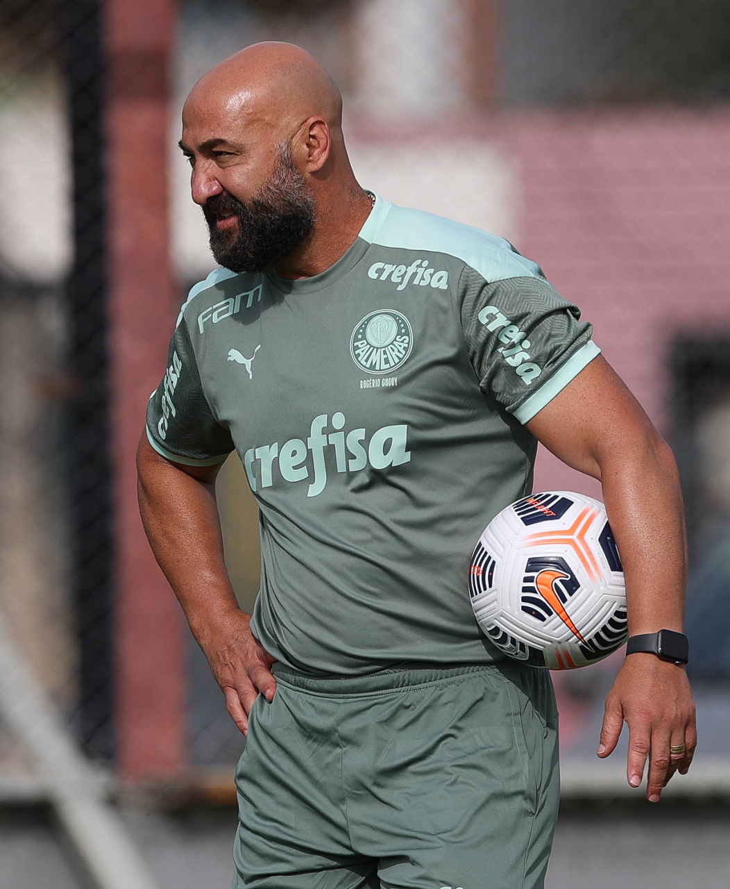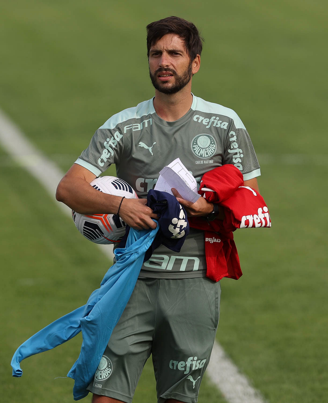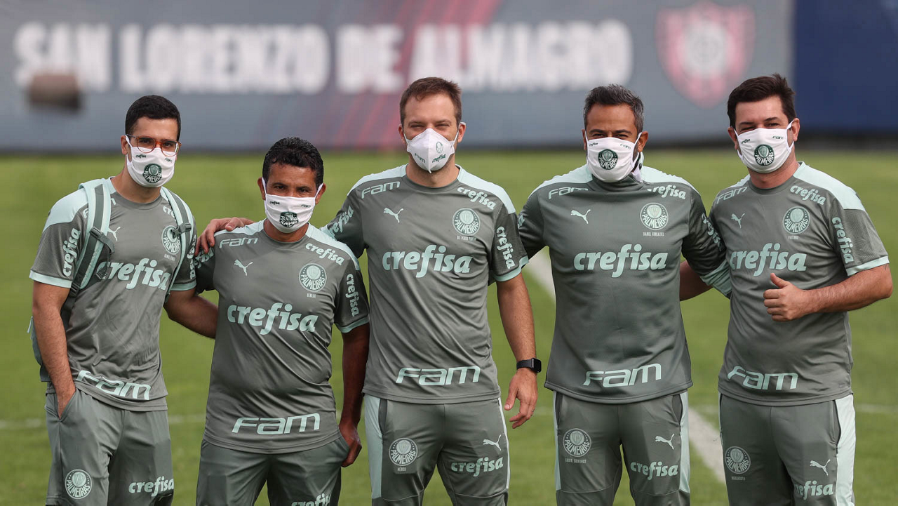 O assessor de imprensa Daniel Romeu, o roupeiro Benildo Meldrado, o médico Pedro Pontin, o coordenador científico Daniel Gonçalves e o massagista Paulinho E/D), da SE Palmeiras, durante treinamento, no CT do San Lorenzo, em Buenos Aires. (Foto: Cesar Greco)