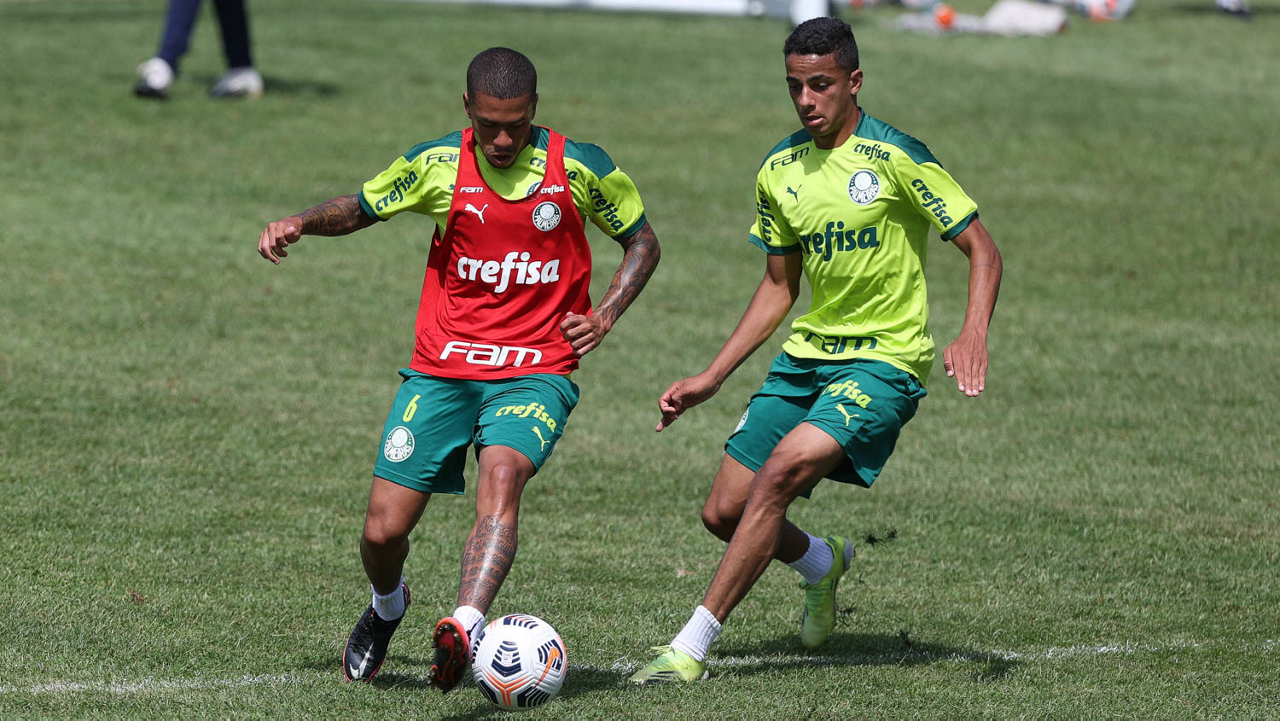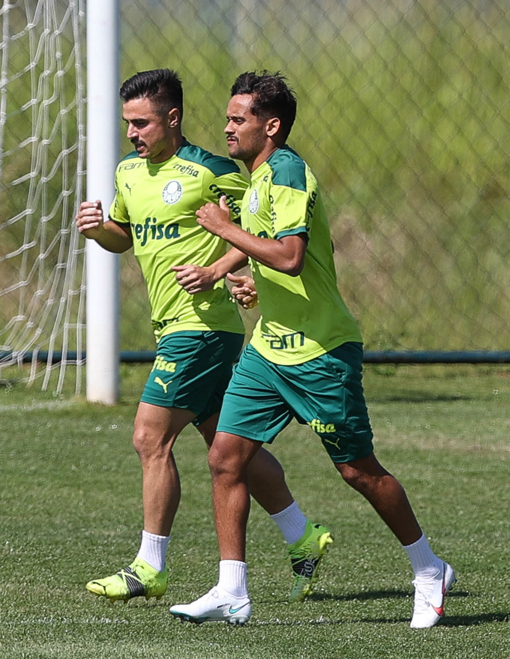 Os jogadores Alan Empereur e Victor Luis (D), da SE Palmeiras, durante treinamento, no CT do Brasiliense. (Foto: Cesar Greco)