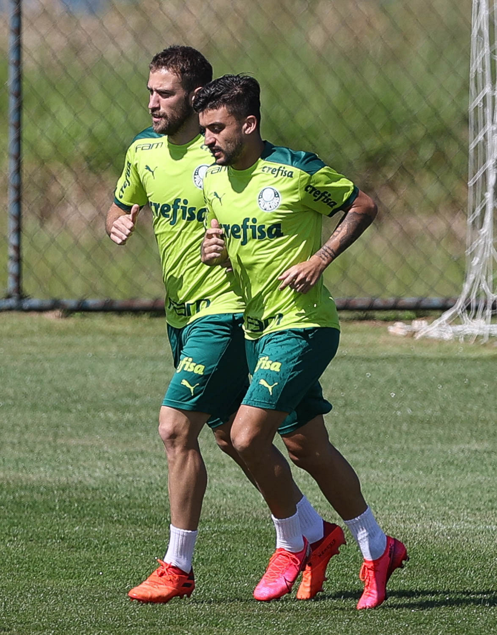Os jogadores Willian e Gustavo Scarpa (D), da SE Palmeiras, durante treinamento, no CT do Brasiliense. (Foto: Cesar Greco)