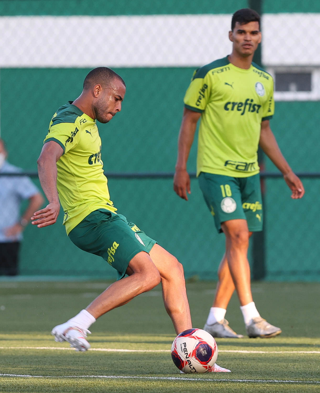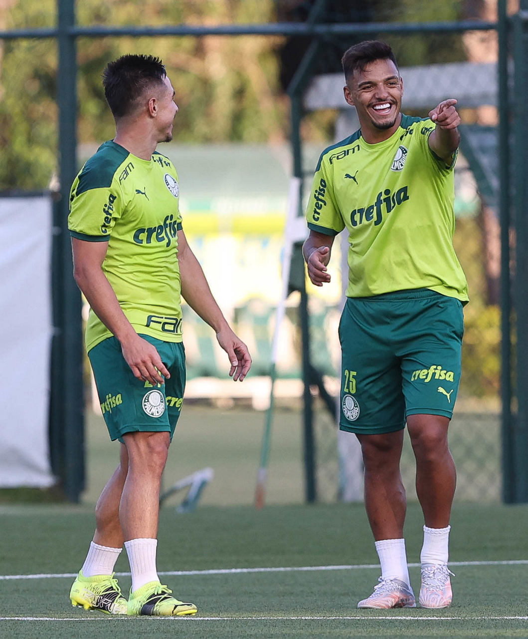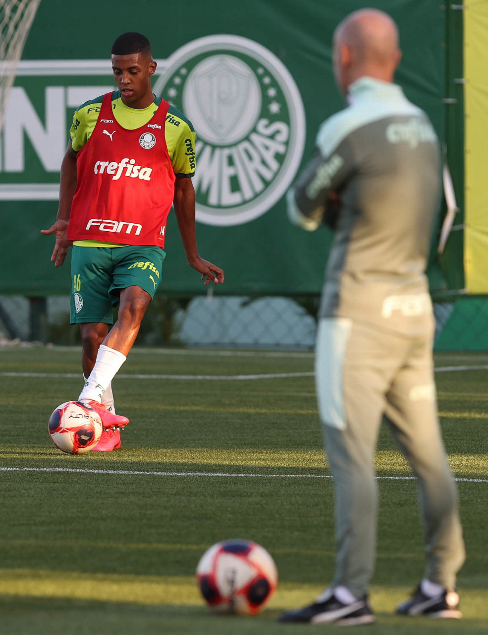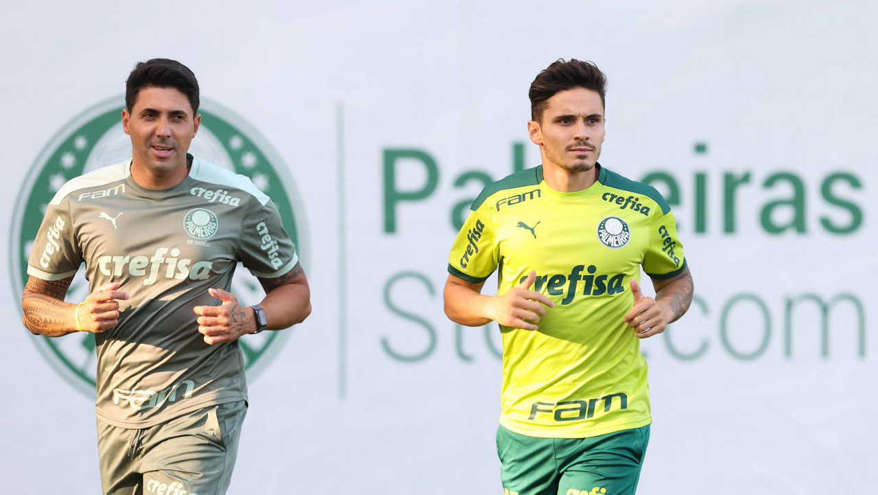 O fisiologista Rudy Pracidelli e o jogador Raphael Veiga (D), da SE Palmeiras, durante treinamento, na Academia de Futebol. (Foto: Cesar Greco)