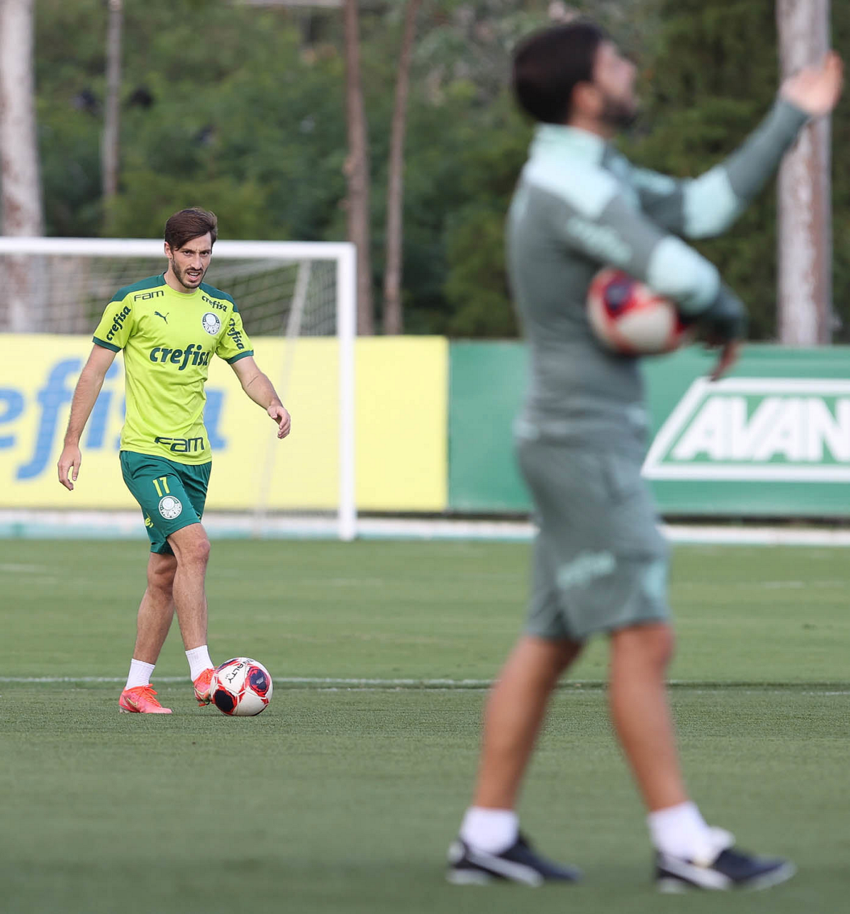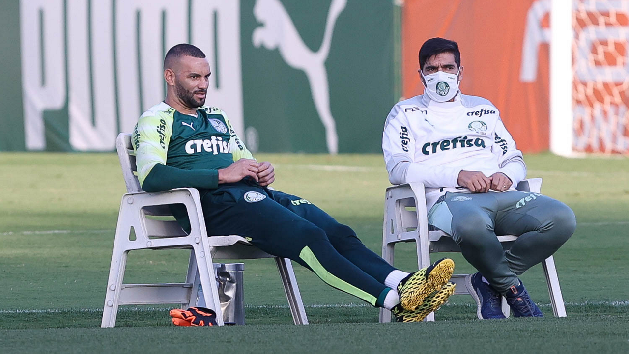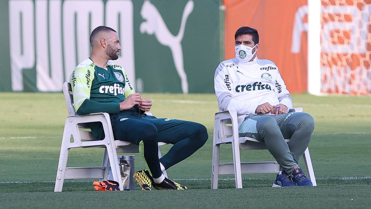 O técnico Abel Ferreira e o goleiro Weverton (E), da SE Palmeiras, durante treinamento, na Academia de Futebol. (Foto: Cesar Greco)