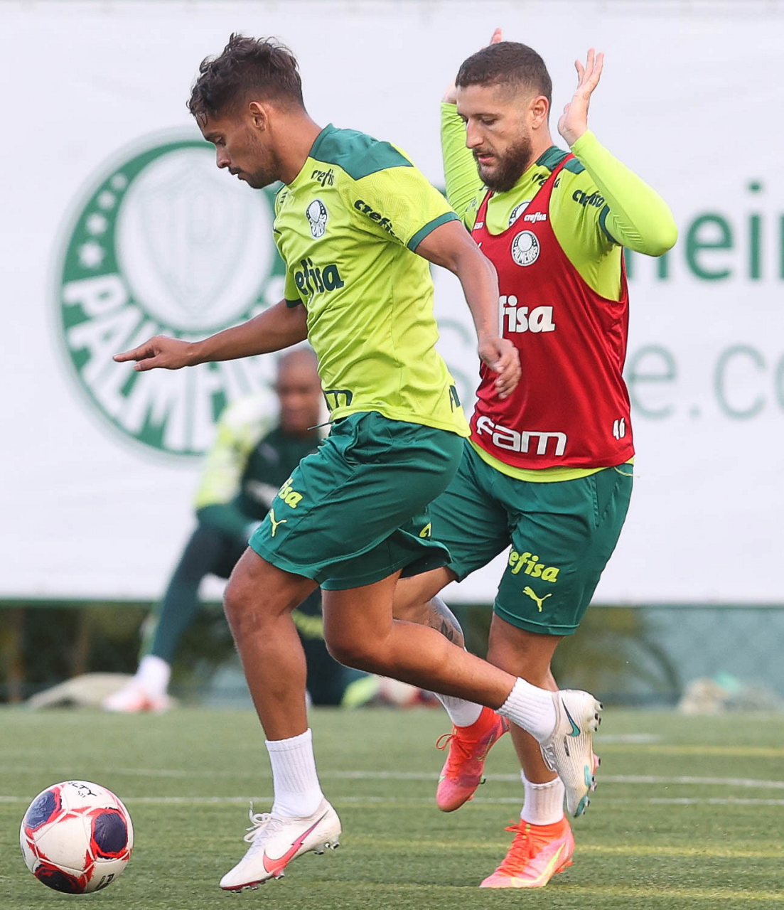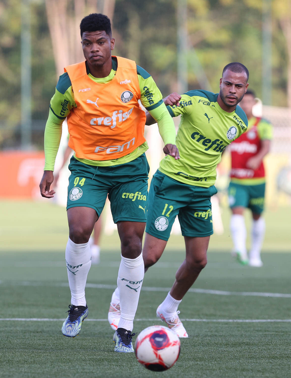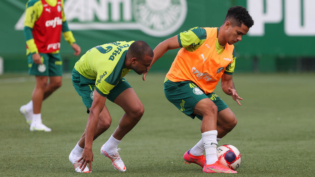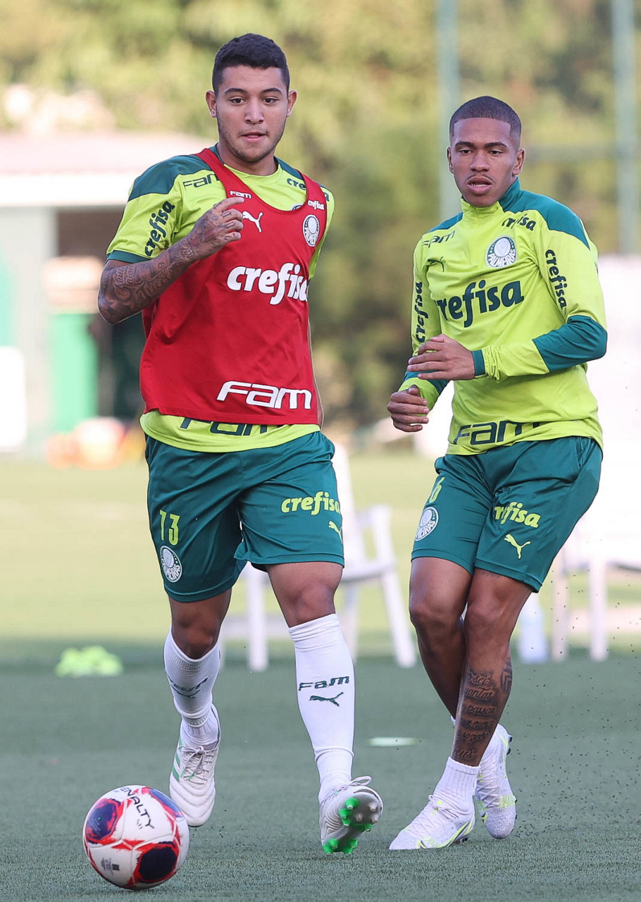 Os jogadores Willian e Gabriel Menino (D), da SE Palmeiras, durante treinamento, na Academia de Futebol. (Foto: Cesar Greco)