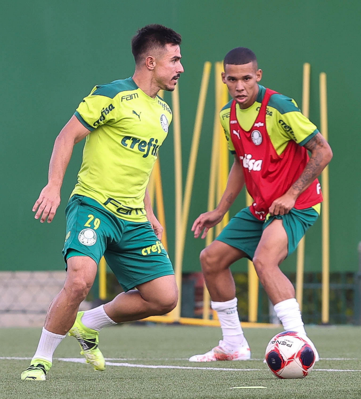 Os jogadores Gustavo Scarpa e Zé Rafael (D), da SE Palmeiras, durante treinamento, na Academia de Futebol. (Foto: Cesar Greco)