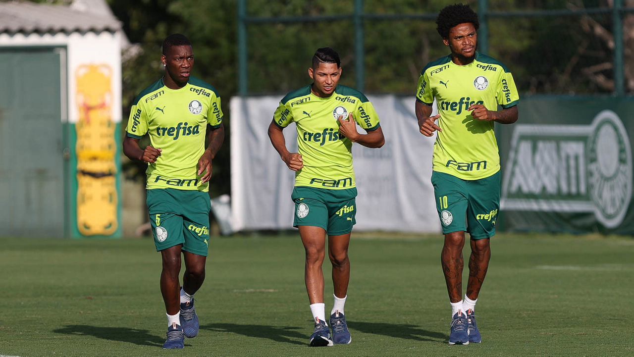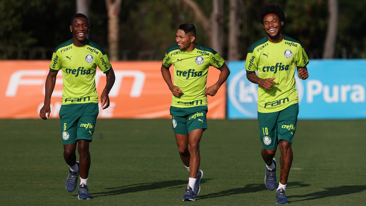 Os jogadores Patrick de Paula, Rony e Luiz Adriano (E/D), da SE Palmeiras, durante treinamento, na Academia de Futebol. (Foto: Cesar Greco)