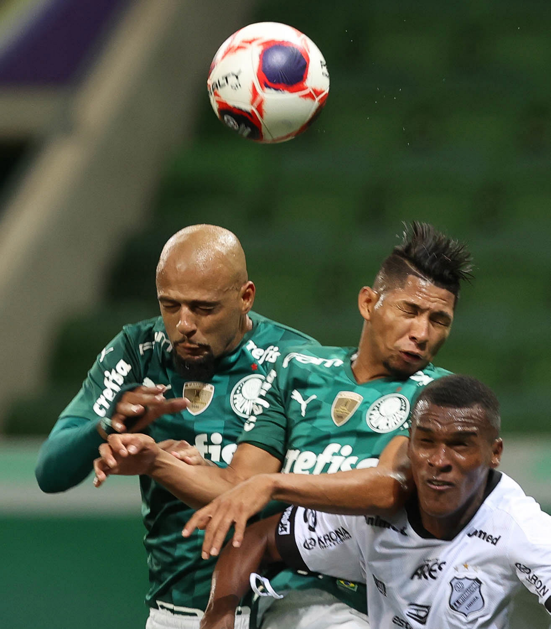Os jogadores Felipe Melo e Rony (D), da SE Palmeiras, disputam bola com o jogador, da AA Internacional de Limeira, durante partida válida pela nona rodada, do Campeonato Paulista, Série A1, na arena Allianz Parque. (Foto: Cesar Greco)