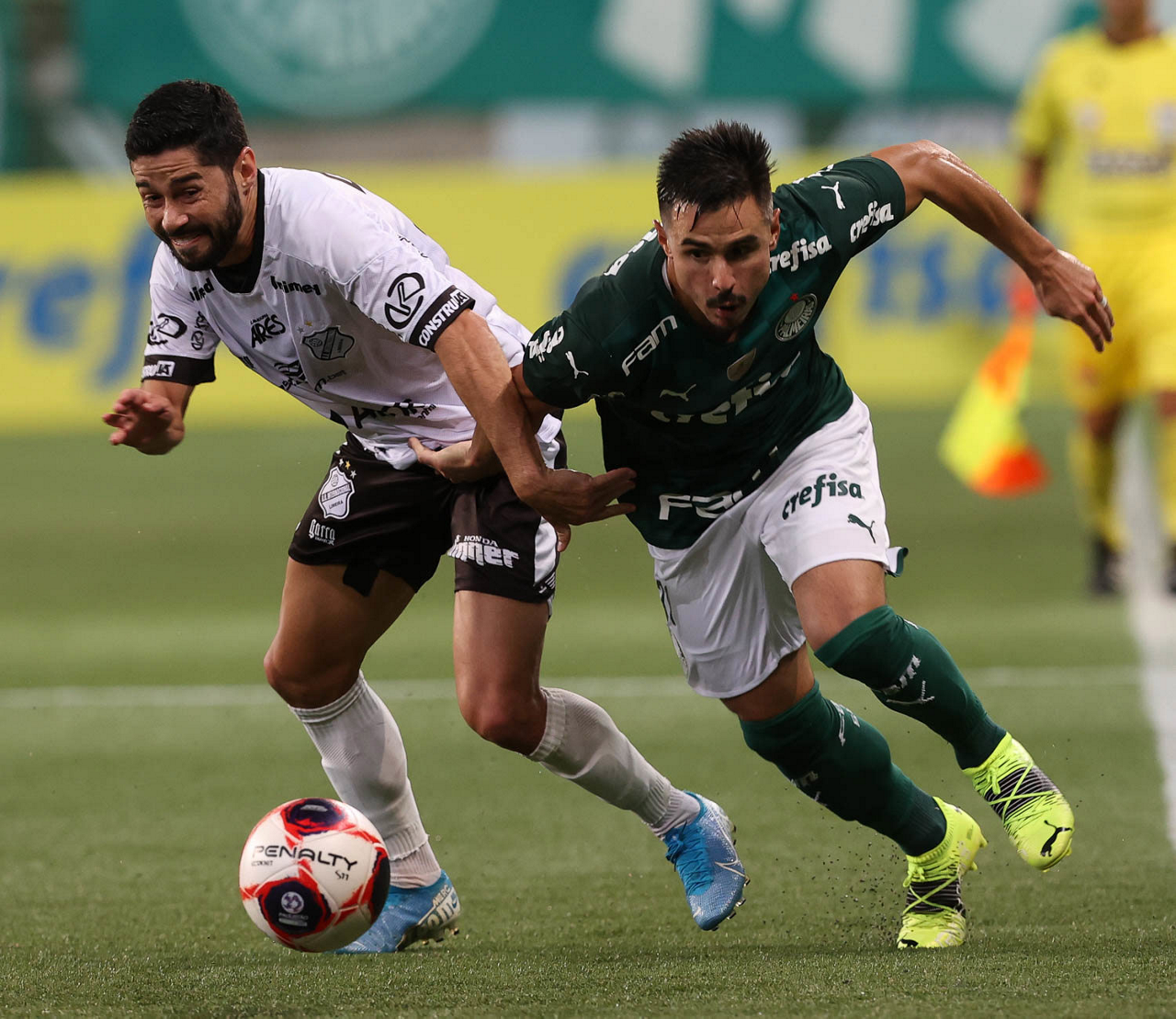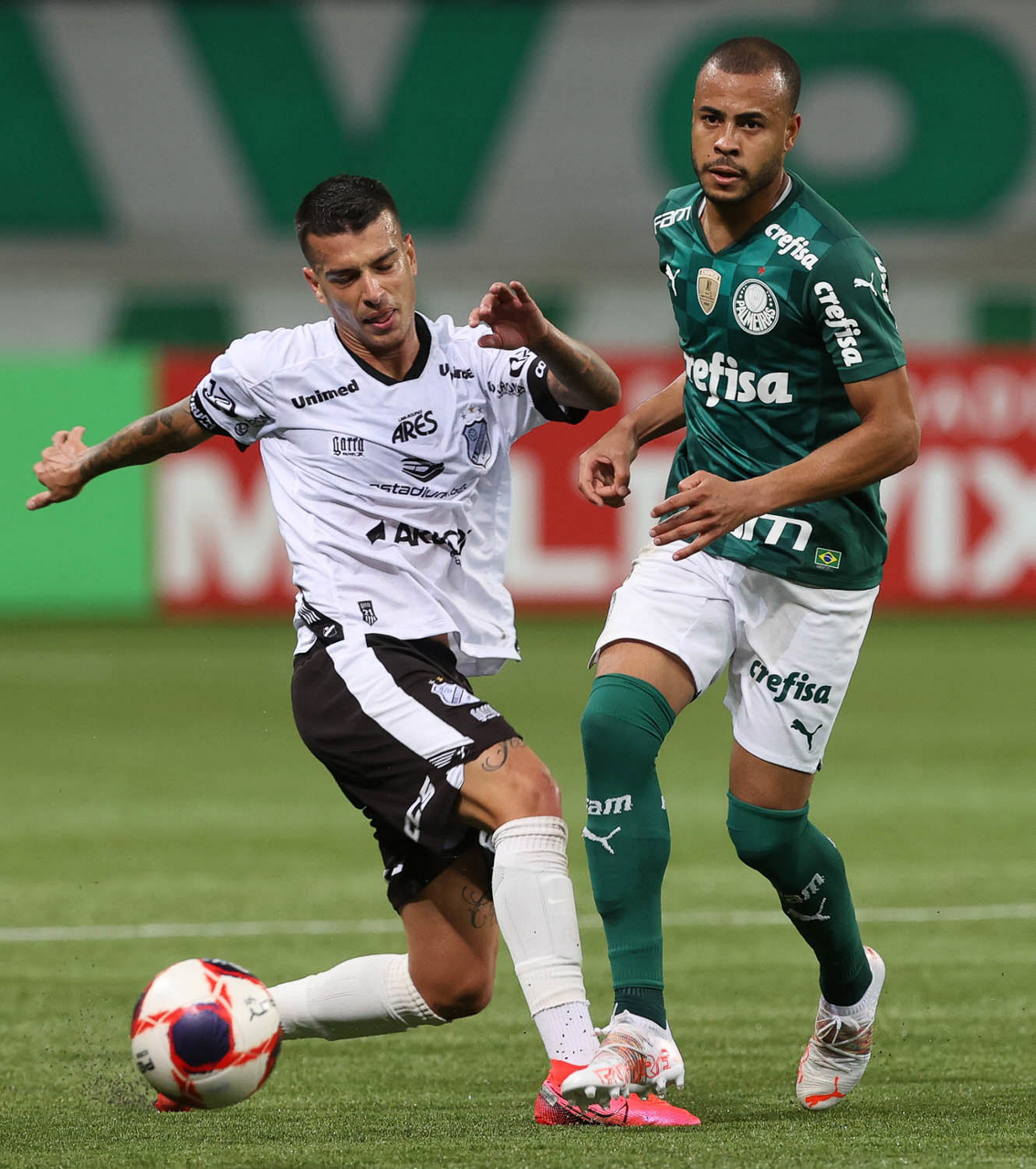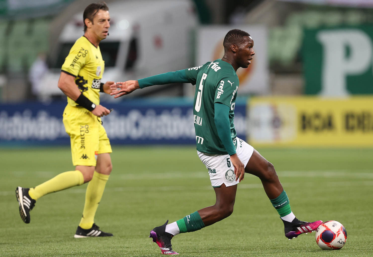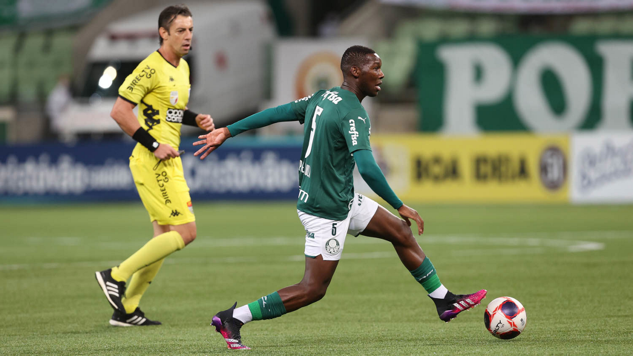 O jogador Matías Viña, da SE Palmeiras, disputa bola com o jogador Thalisson, da AA Internacional de Limeira, durante partida válida pela nona rodada, do Campeonato Paulista, Série A1, na arena Allianz Parque. (Foto: Cesar Greco)
