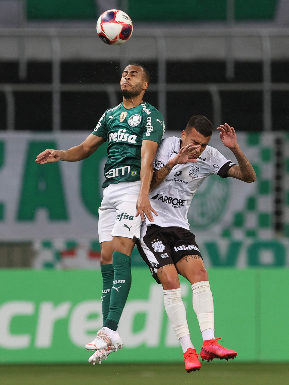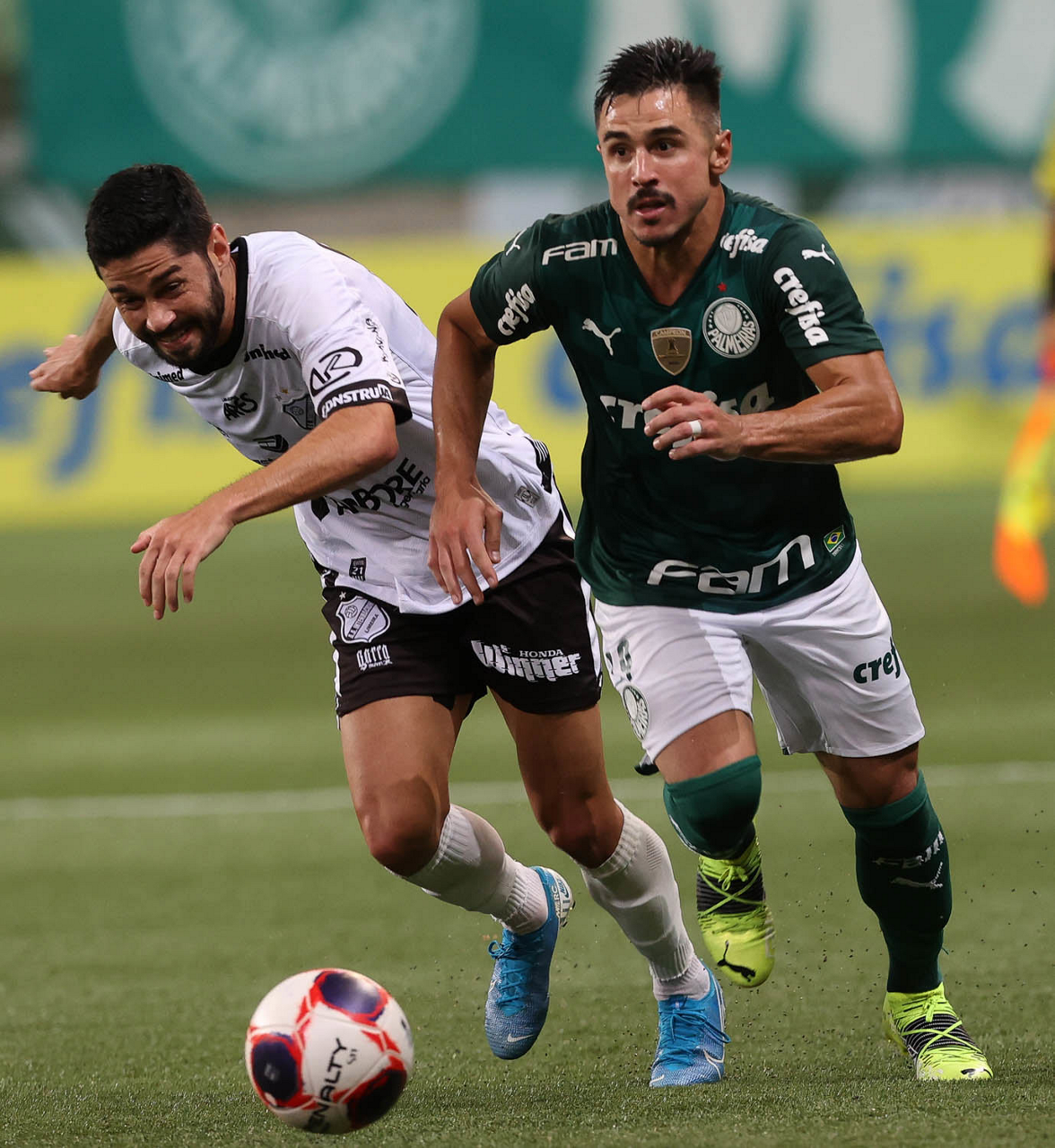 O jogador Mayke, da SE Palmeiras, disputa bola com o jogador, da AA Internacional de Limeira, durante partida válida pela nona rodada, do Campeonato Paulista, Série A1, na arena Allianz Parque. (Foto: Cesar Greco)