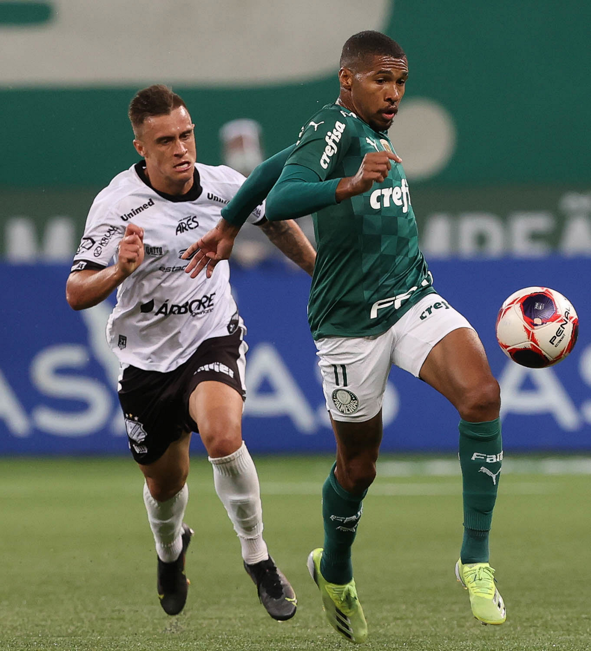 O jogador Wesley, da SE Palmeiras, disputa bola com o jogador Felipe Saraiva, da AA Internacional de Limeira, durante partida válida pela nona rodada, do Campeonato Paulista, Série A1, na arena Allianz Parque. (Foto: Cesar Greco)