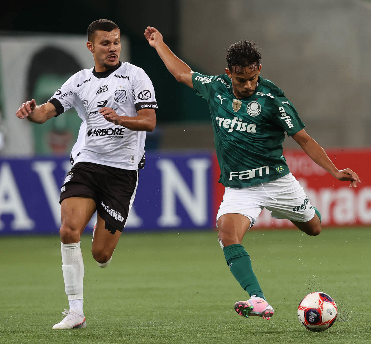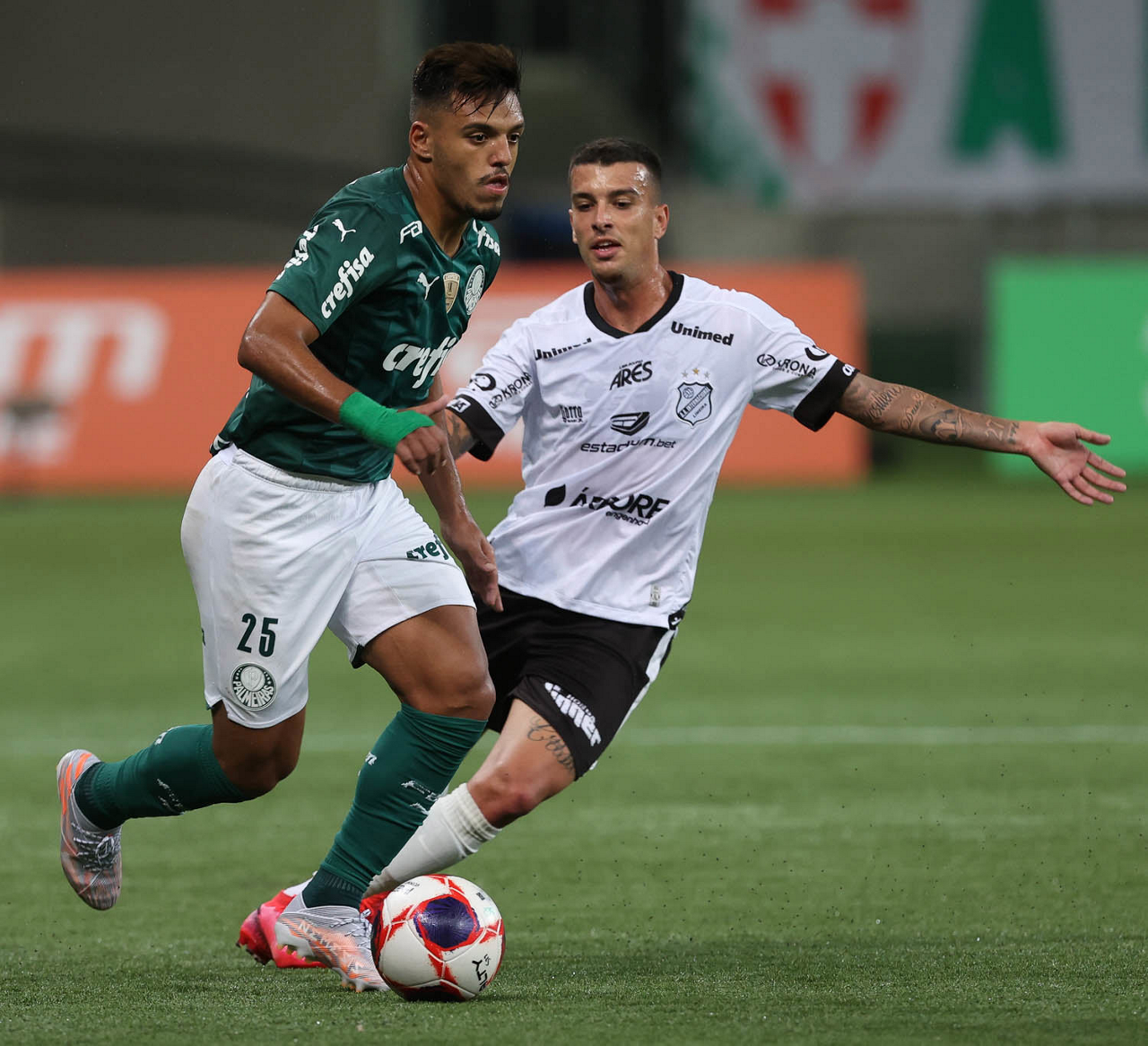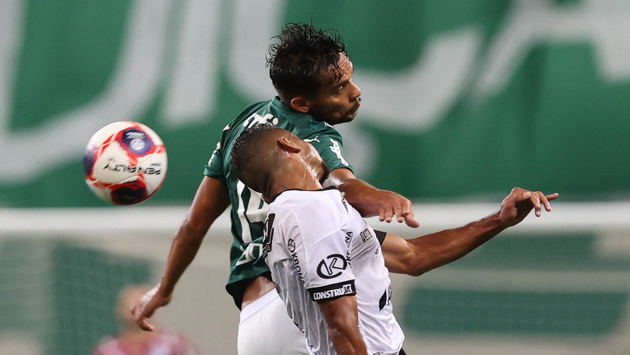 O jogador Gabriel Menino, da SE Palmeiras, disputa bola com o jogador, da AA Internacional de Limeira, durante partida válida pela nona rodada, do Campeonato Paulista, Série A1, na arena Allianz Parque. (Foto: Cesar Greco)