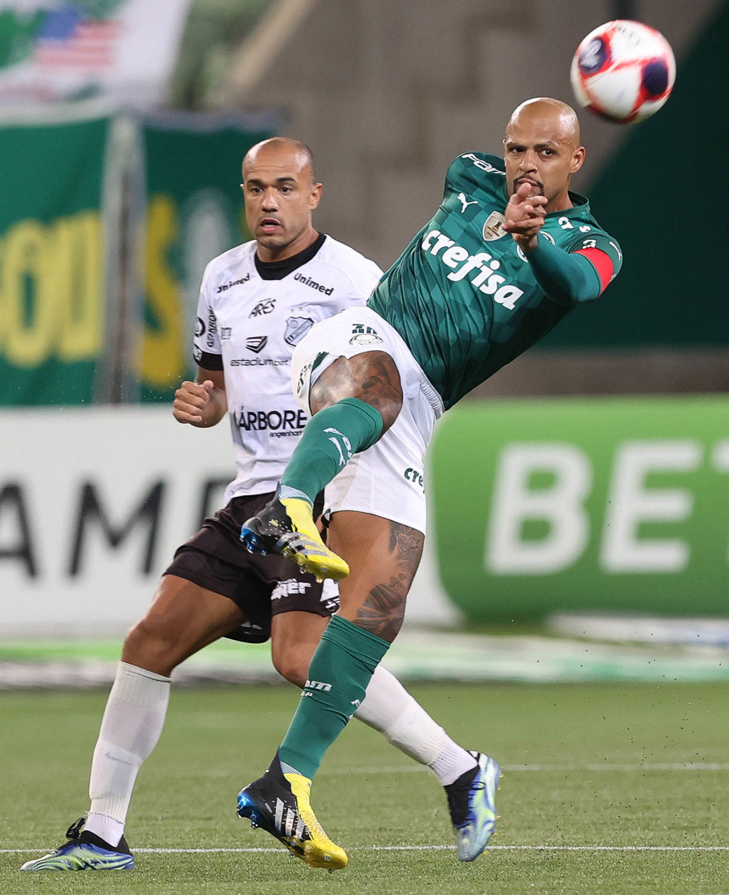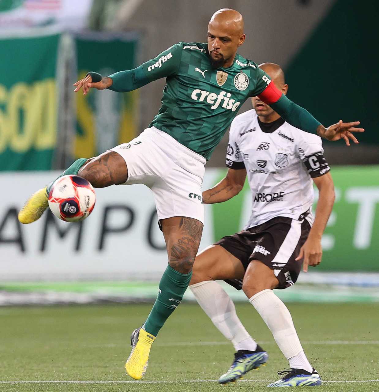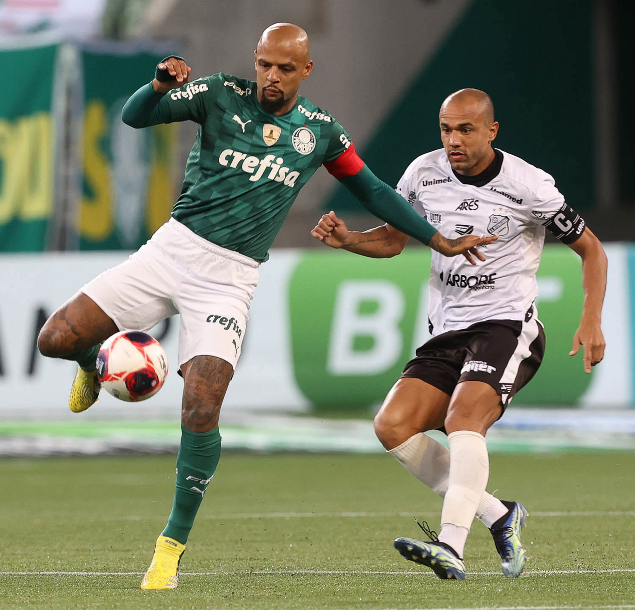 O jogador Felipe Melo, da SE Palmeiras, disputa bola com o jogador Roger, da AA Internacional de Limeira, durante partida válida pela nona rodada, do Campeonato Paulista, Série A1, na arena Allianz Parque. (Foto: Cesar Greco)