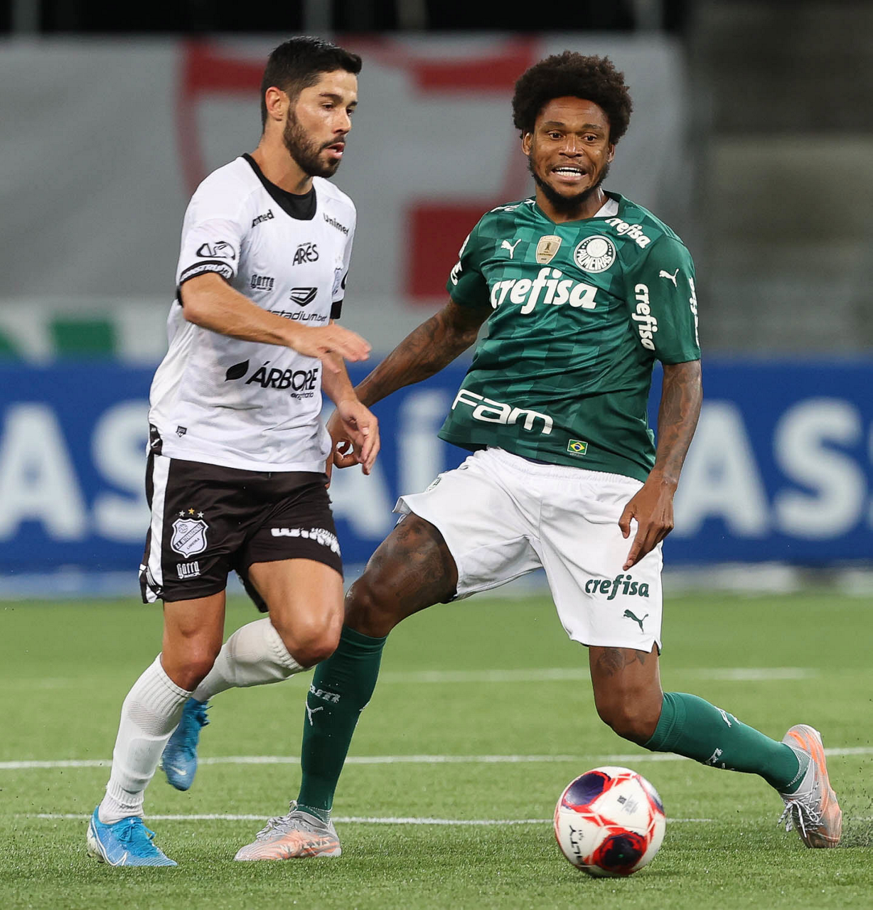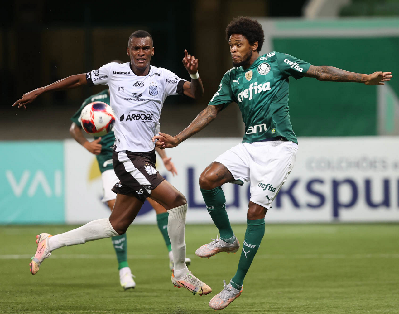 O jogador Luiz Adriano, da SE Palmeiras, disputa bola com o jogador, da AA Internacional de Limeira, durante partida válida pela nona rodada, do Campeonato Paulista, Série A1, na arena Allianz Parque. (Foto: Cesar Greco)