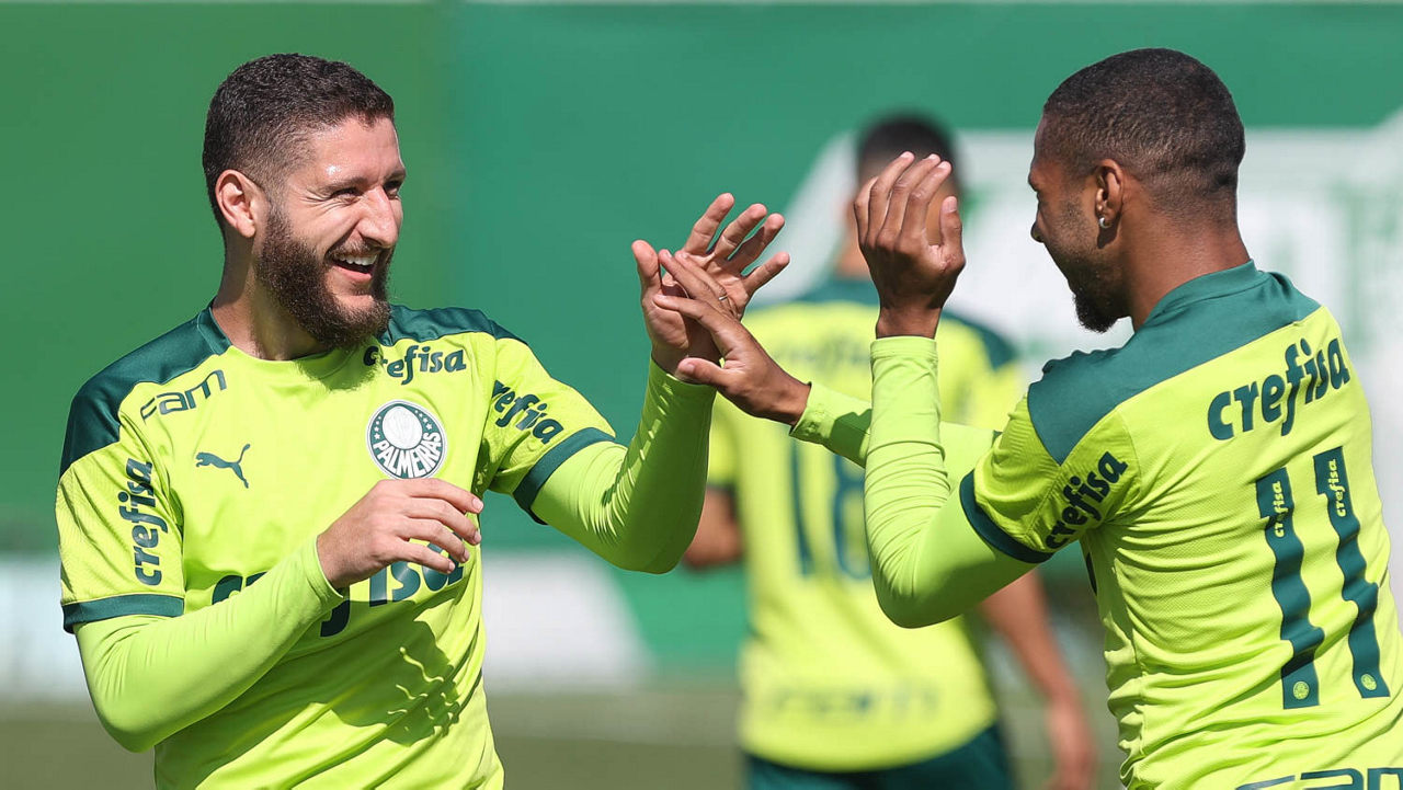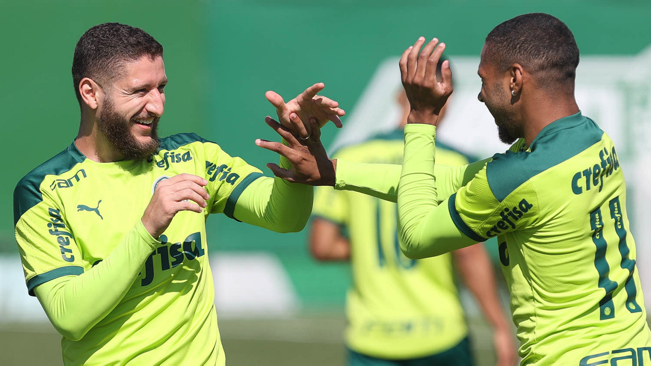 Os jogadores Gustavo Gómez e Danilo (D), da SE Palmeiras, durante treinamento, na Academia de Futebol. (Foto: Cesar Greco)