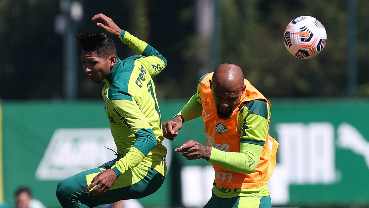 Os jogadores Rony e Felipe Melo (D), da SE Palmeiras, durante treinamento, na Academia de Futebol. (Foto: Cesar Greco)