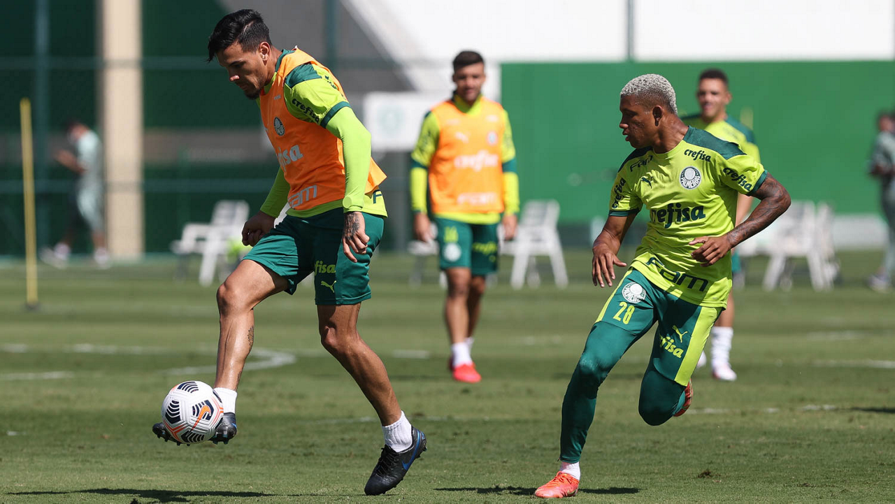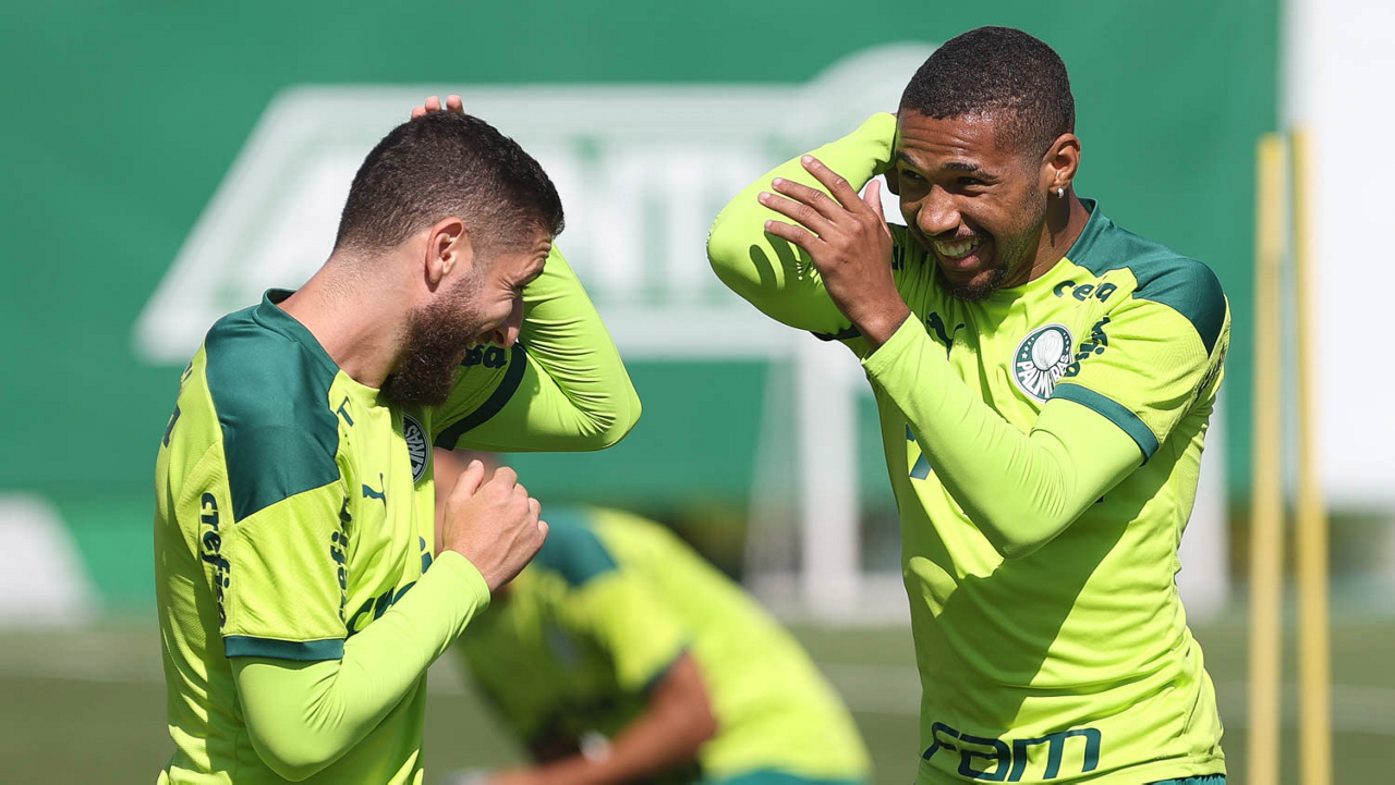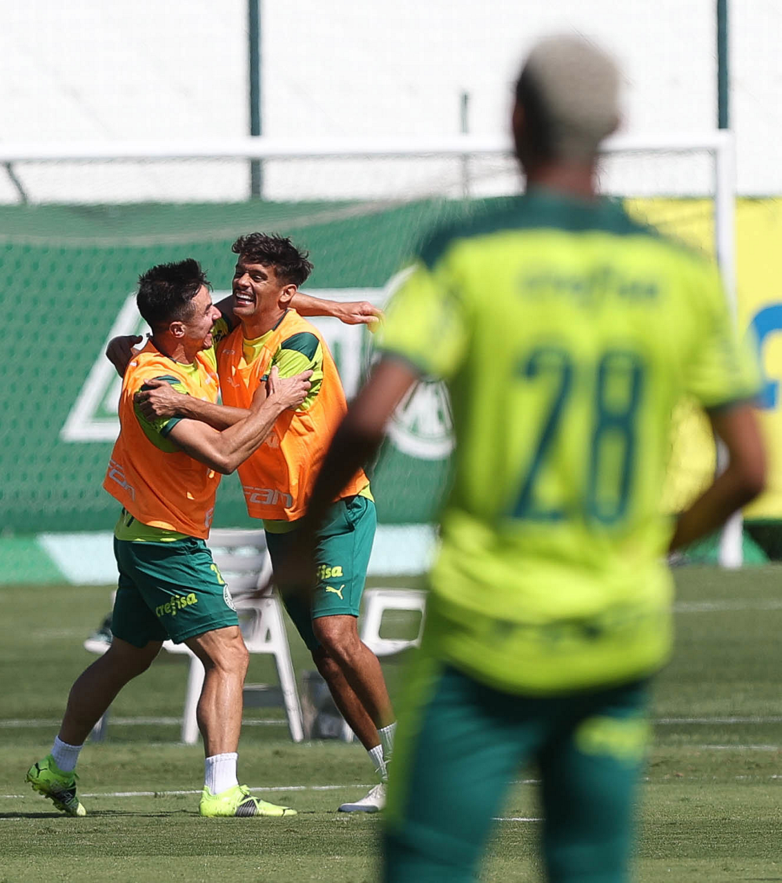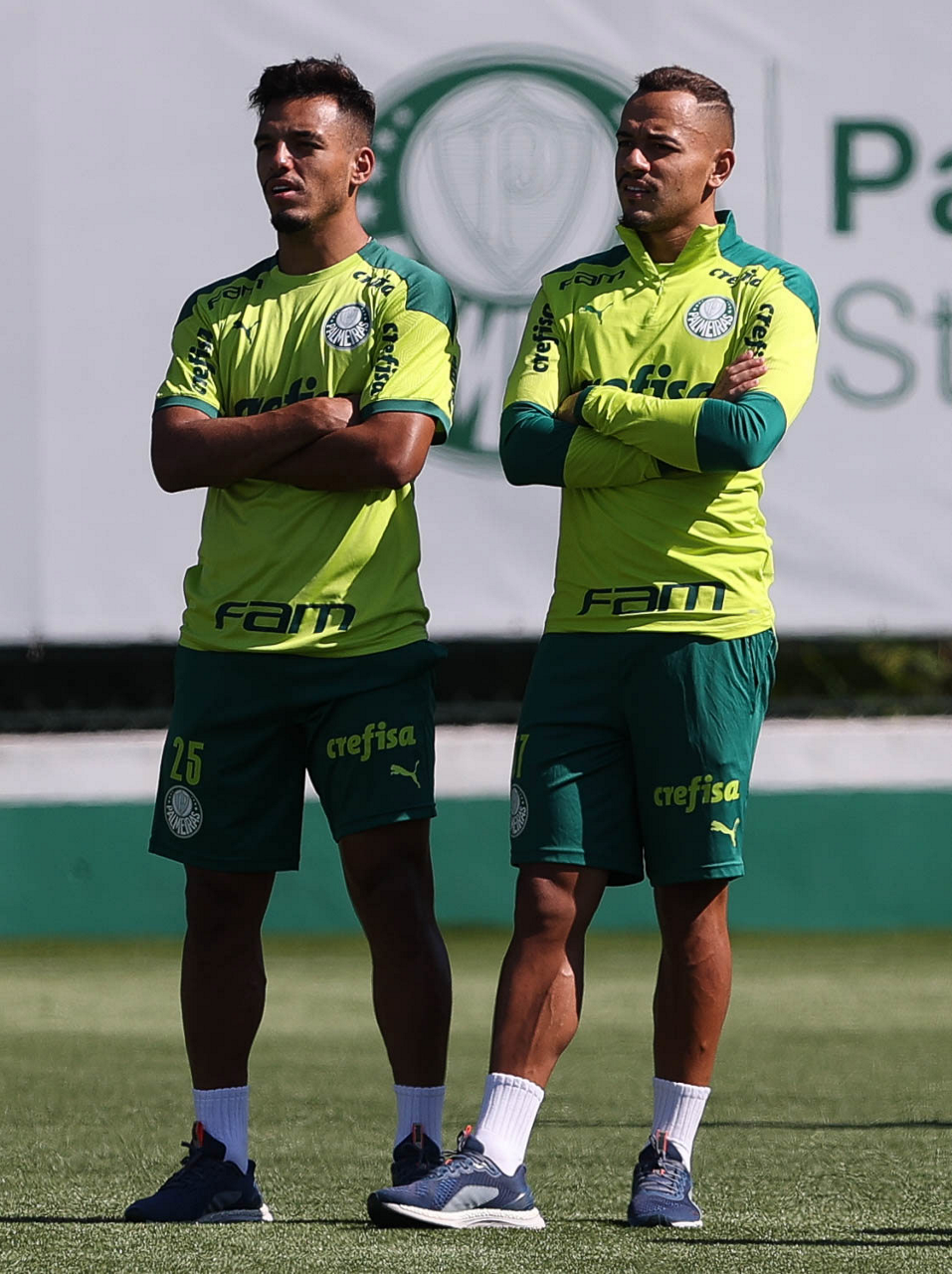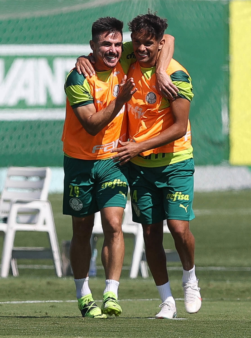 Os jogadores Gabriel Menino e Rafael Elias (D), da SE Palmeiras, durante treinamento, na Academia de Futebol. (Foto: Cesar Greco)