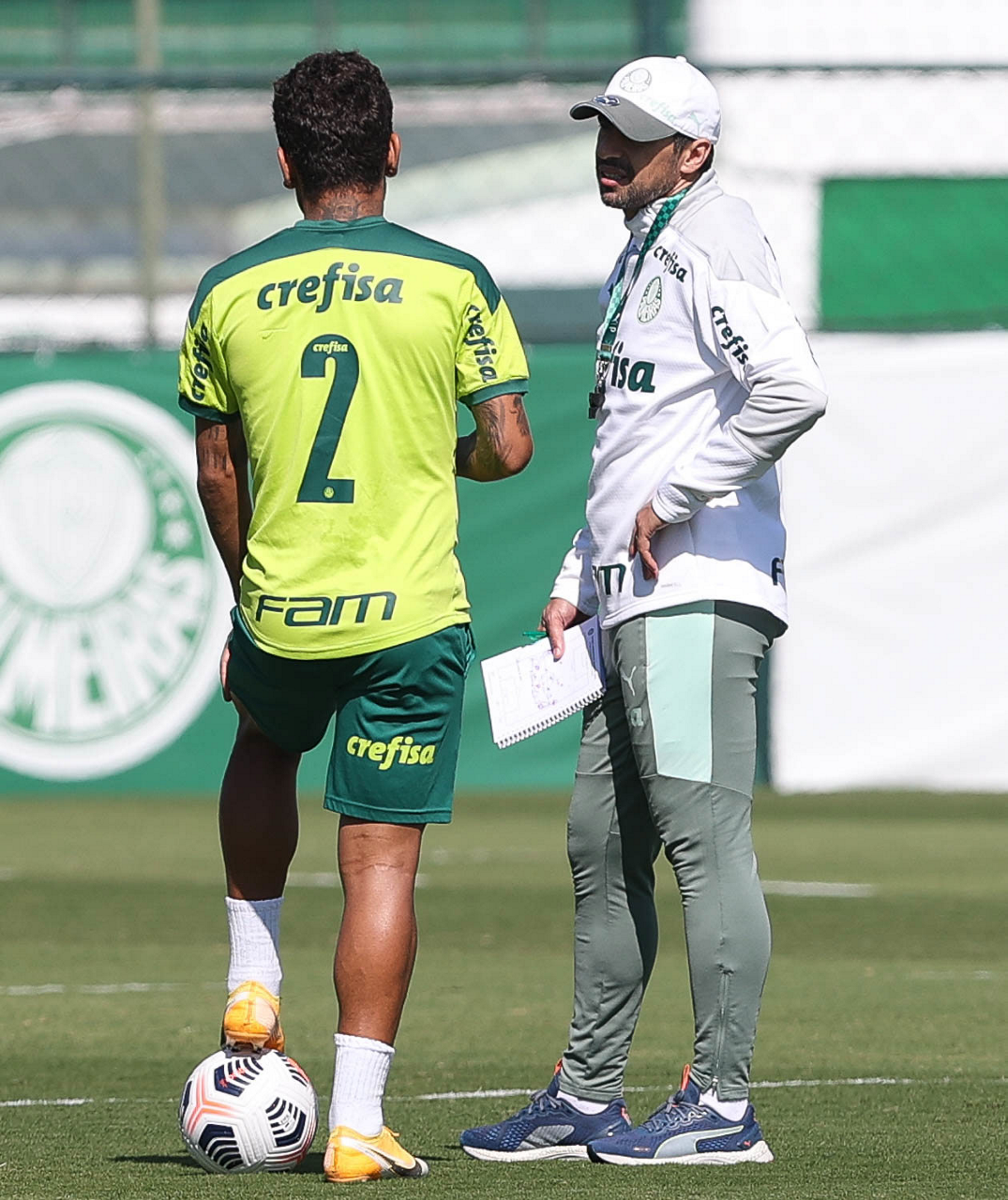 O técnico Abel Ferreira e o jogador Marcos Rocha (E), da SE Palmeiras, durante treinamento, na Academia de Futebol. (Foto: Cesar Greco)