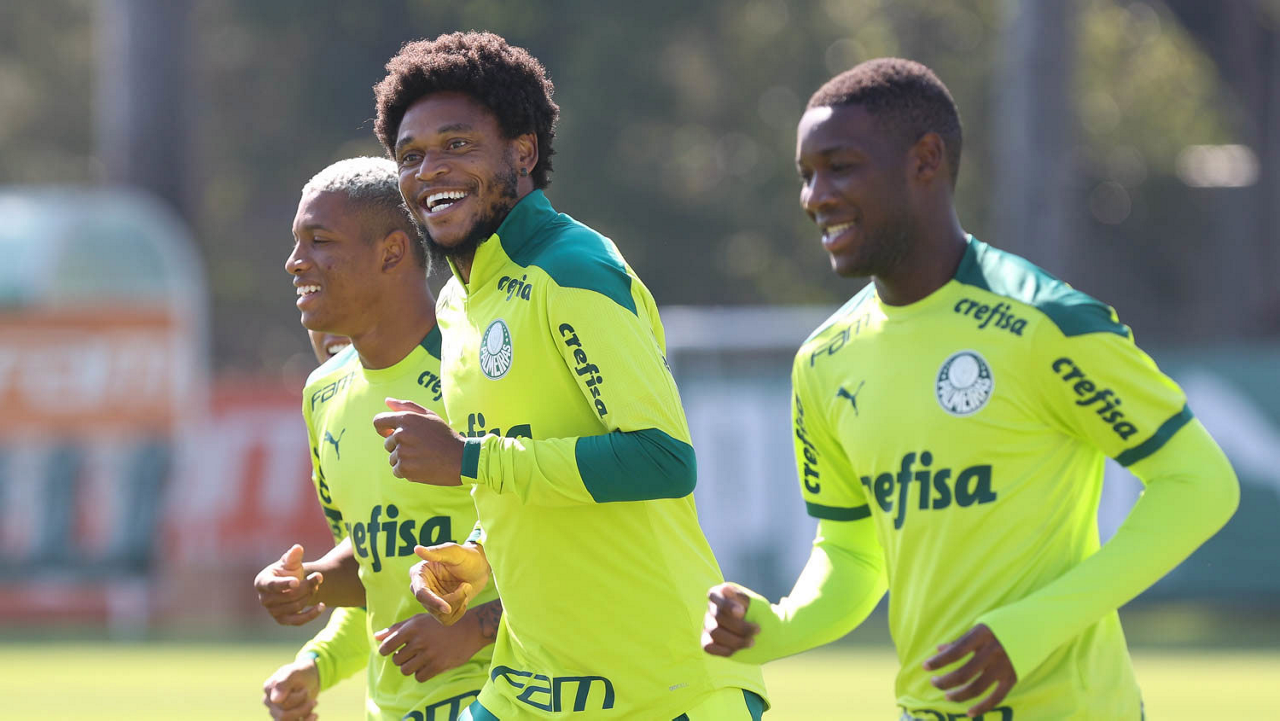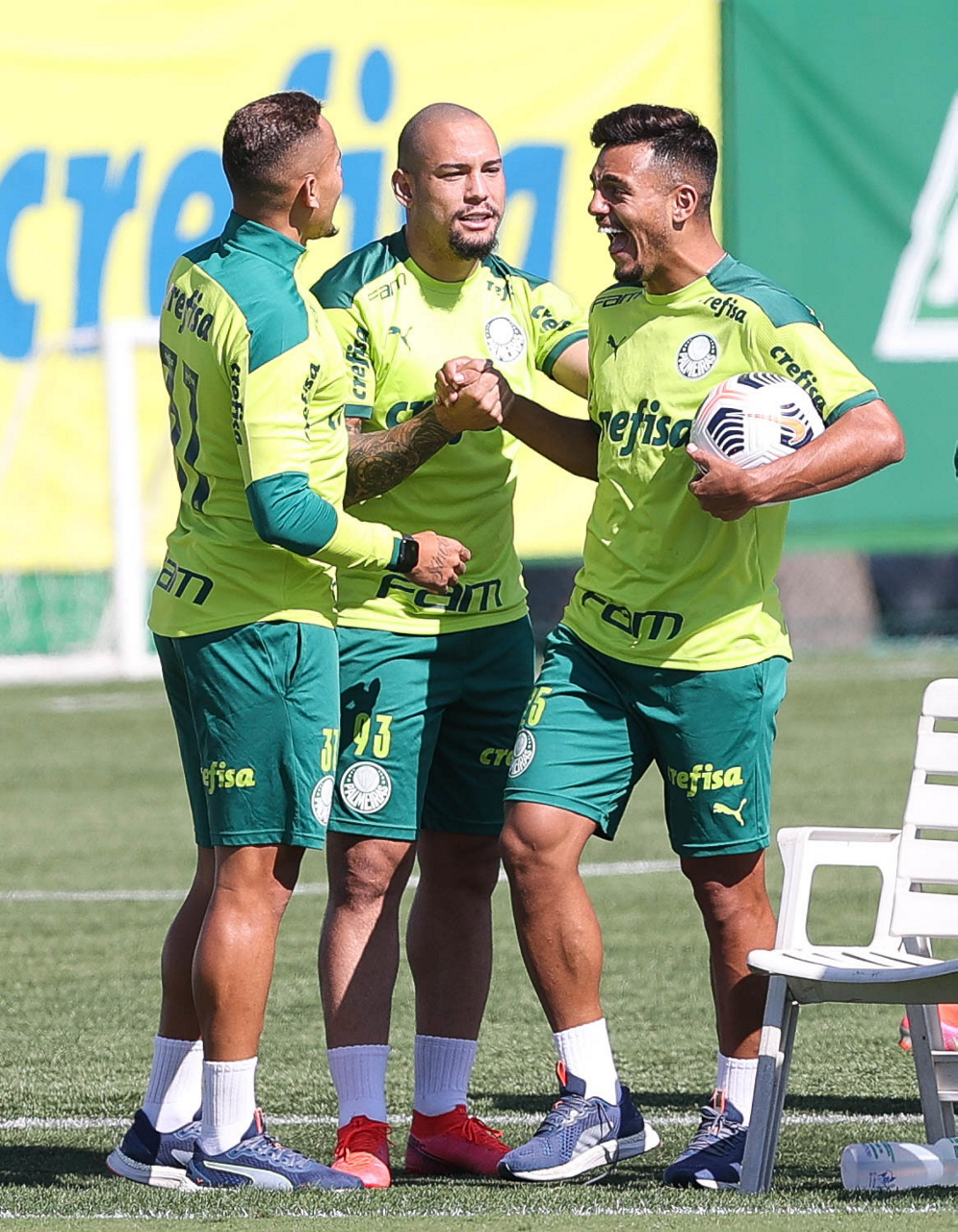 Os jogadores Danilo Barbosa, Luan e Raphael Veiga (E/D), da SE Palmeiras, durante treinamento, na Academia de Futebol. (Foto: Cesar Greco)