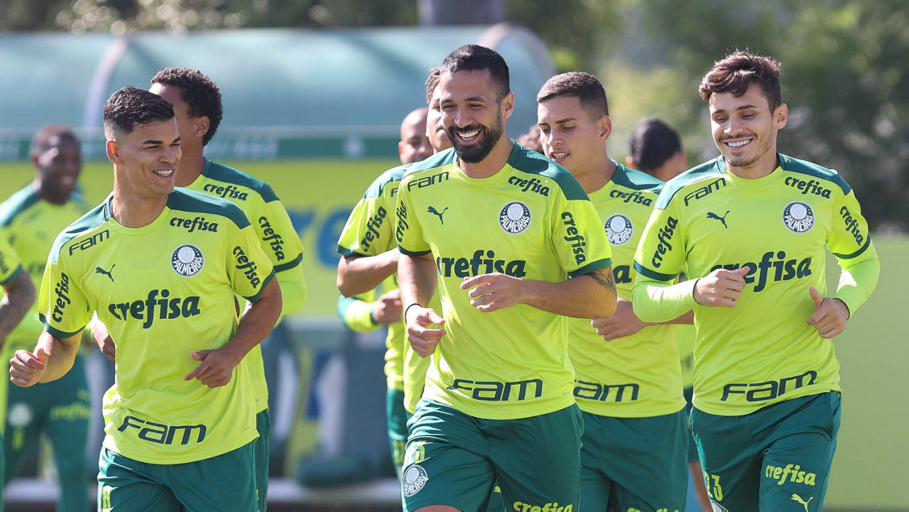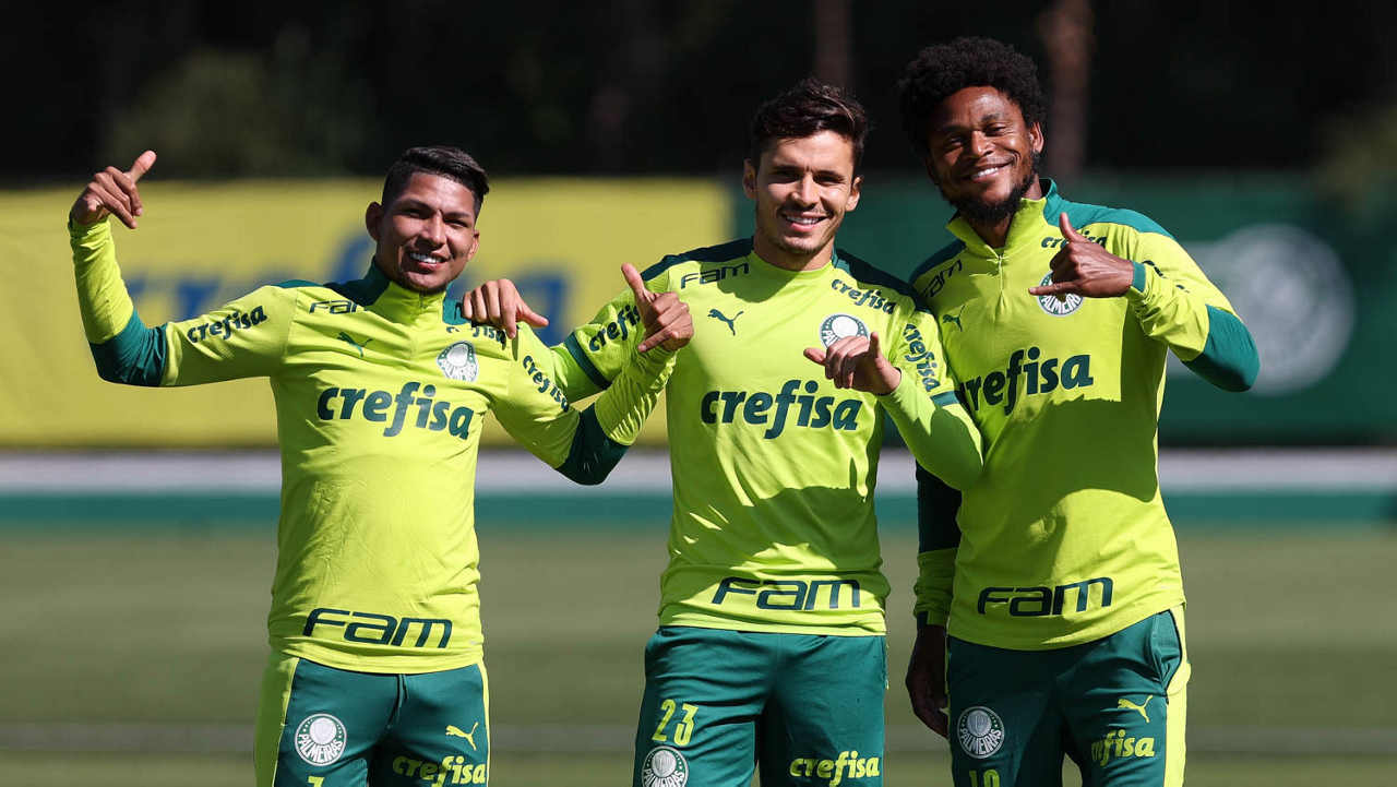 Os jogadores Rony, Raphael Veiga e Luiz Adriano (E/D), da SE Palmeiras, durante treinamento, na Academia de Futebol. (Foto: Cesar Greco)