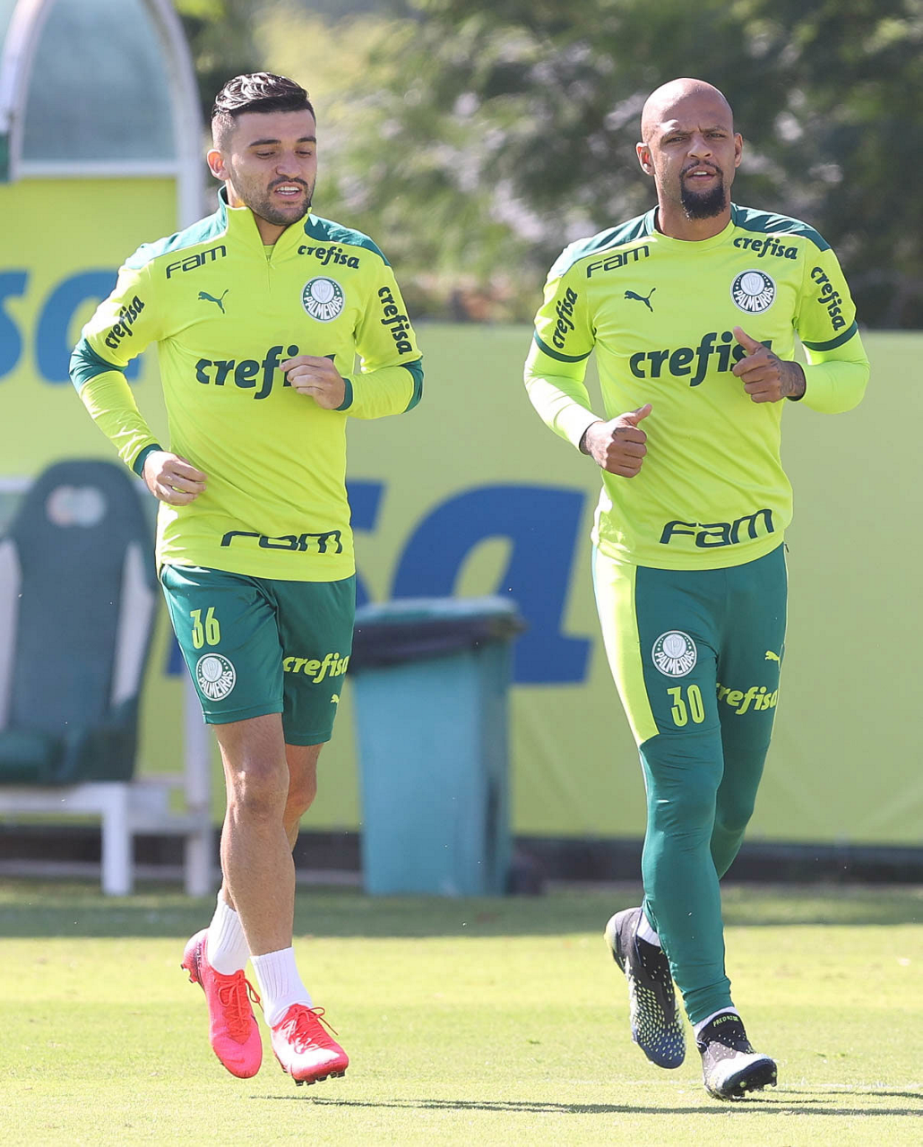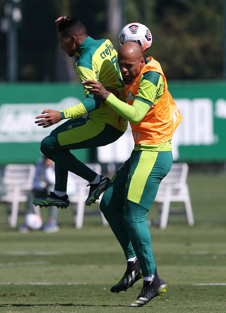 Os jogadores Victor Luis e Felipe Melo (D), da SE Palmeiras, durante treinamento, na Academia de Futebol. (Foto: Cesar Greco)