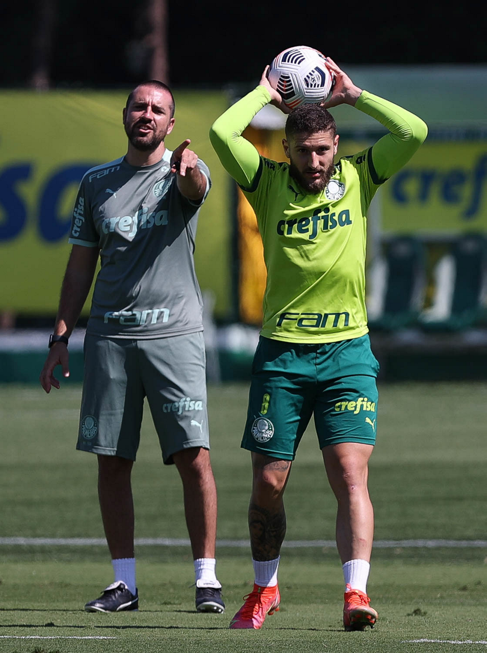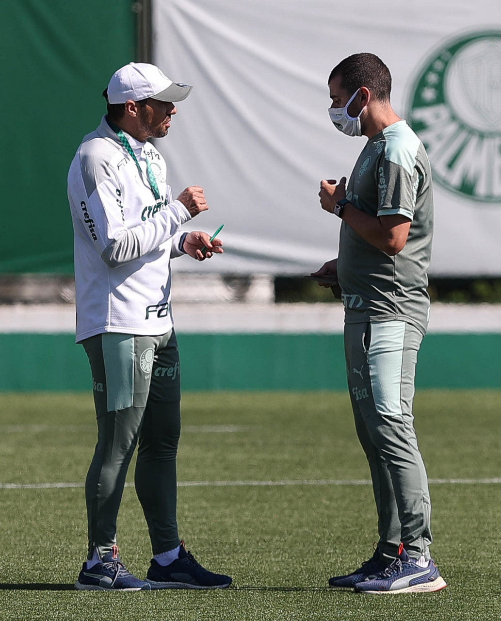 O técnico Abel Ferreira e o fisiologista Vinicius Ponzio (D), da SE Palmeiras, durante treinamento, na Academia de Futebol. (Foto: Cesar Greco)