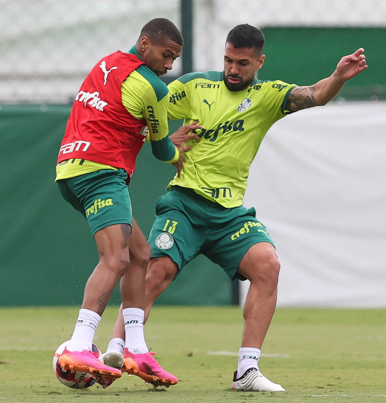 Os jogadores Gustavo Scarpa e Raphael Veiga (D), da SE Palmeiras, durante treinamento, na Academia de Futebol. (Foto: Cesar Greco)