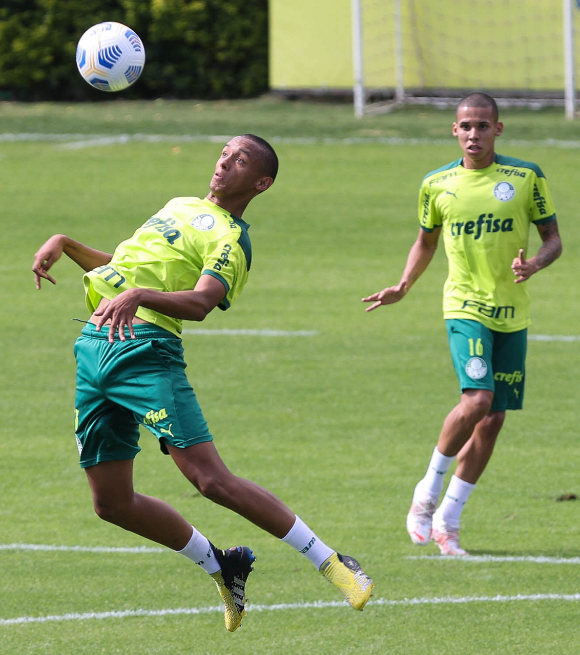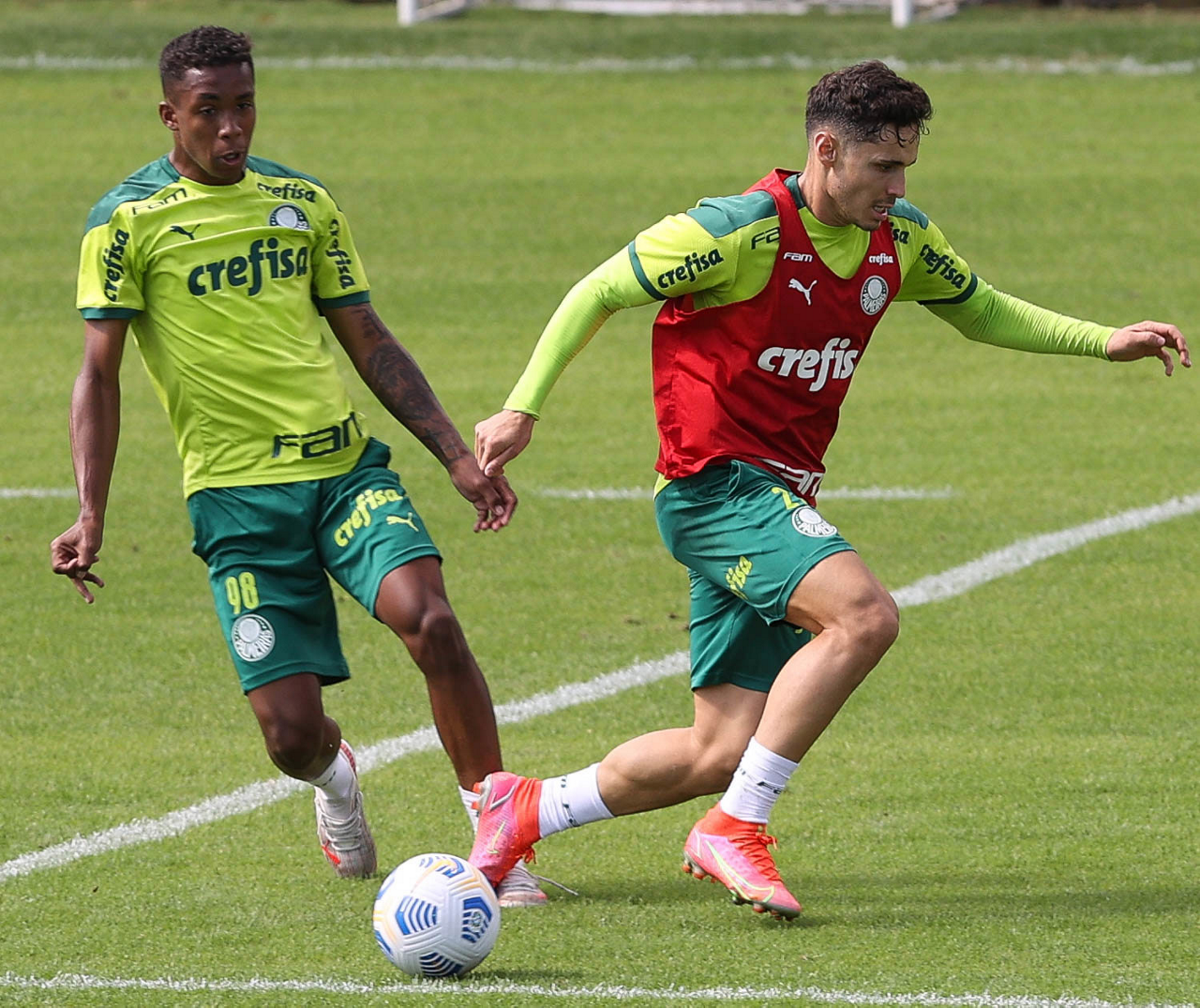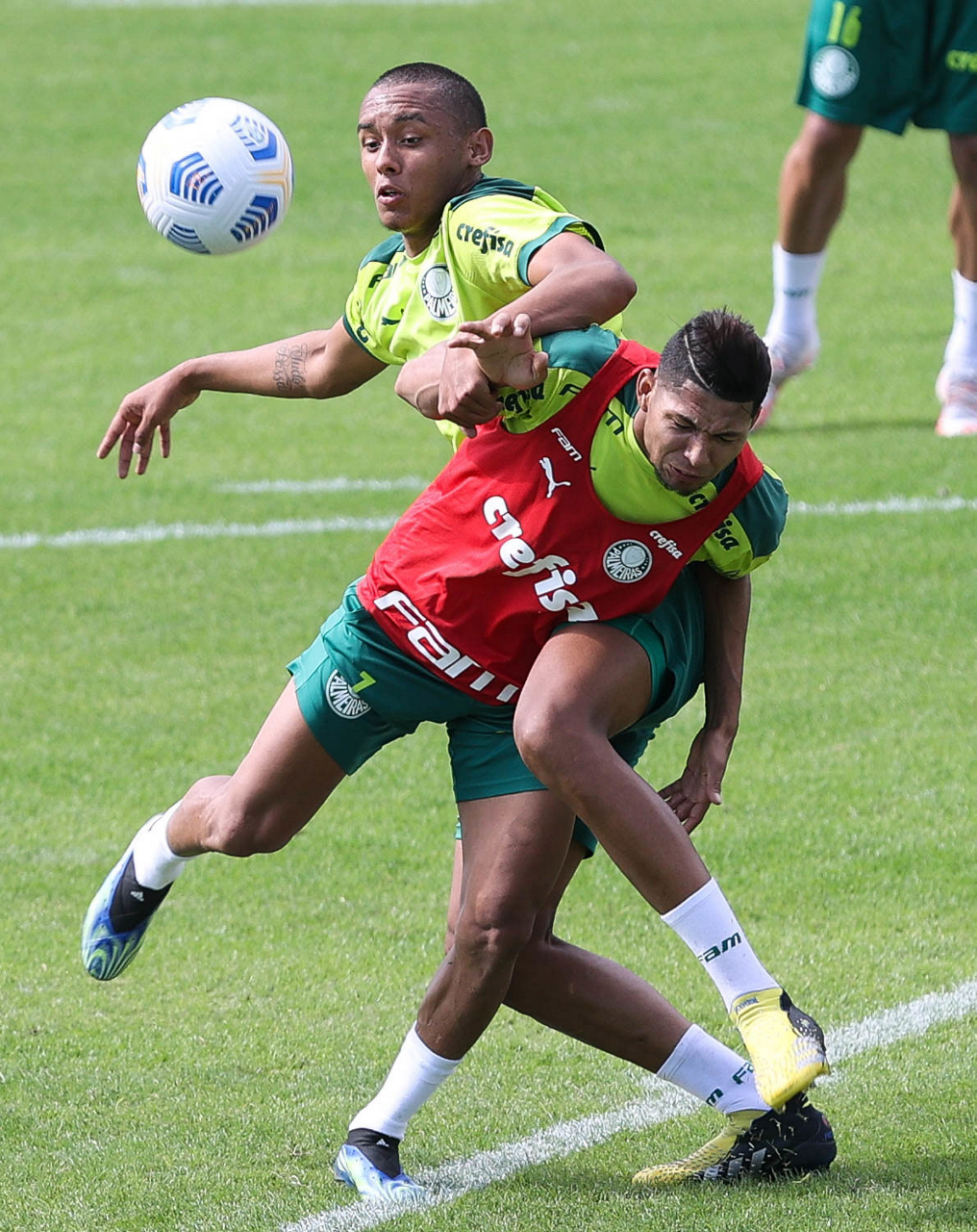 Os jogadores Lucas Esteves e Raphael Veiga (D), da SE Palmeiras, durante treinamento, na Academia de Futebol. (Foto: Cesar Greco)