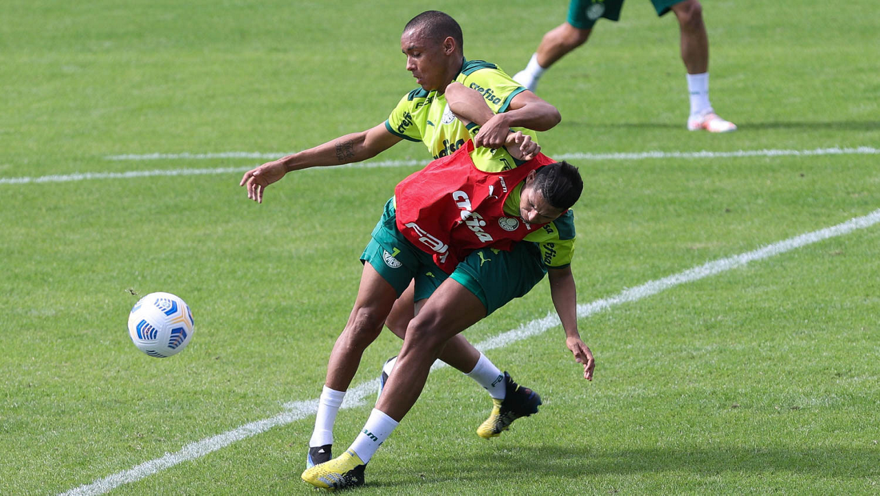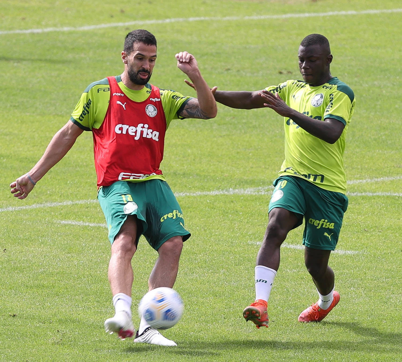 Os jogadores Robinho e Raphael Veiga (D), da SE Palmeiras, durante treinamento, na Academia de Futebol. (Foto: Cesar Greco)