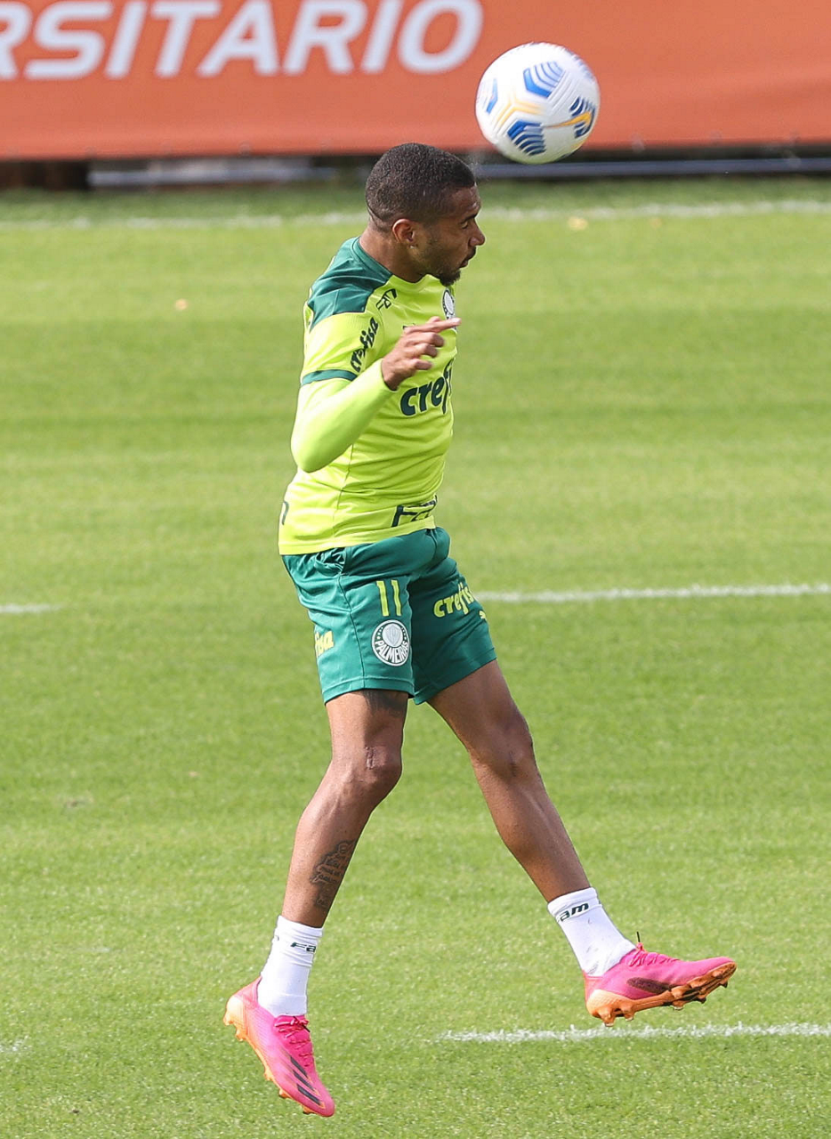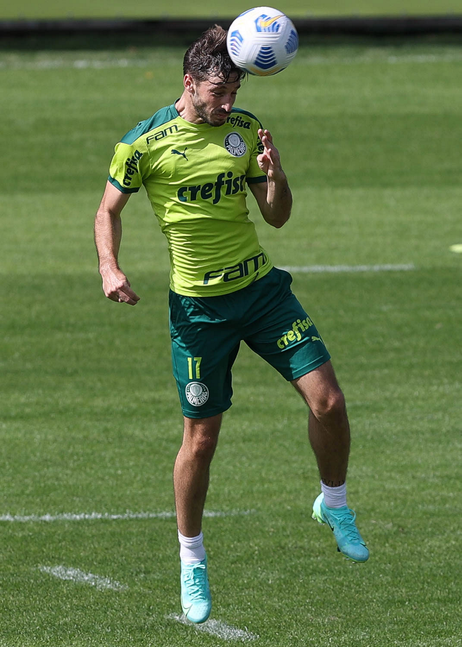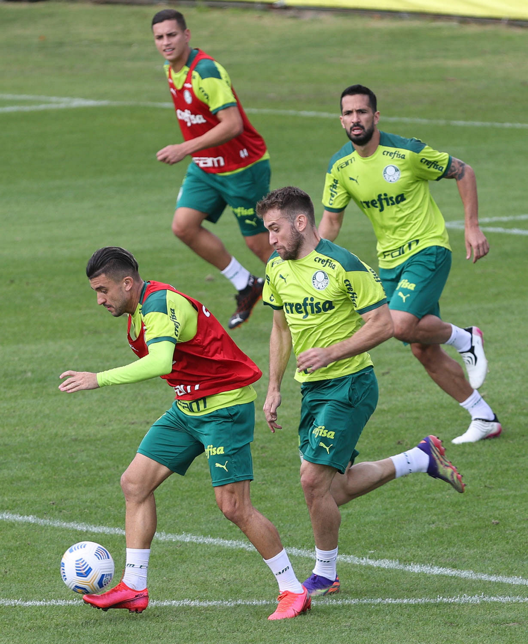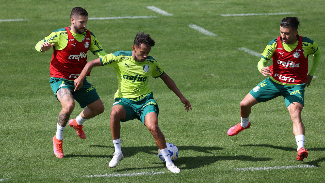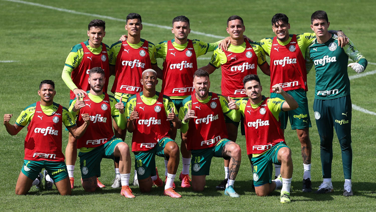 Os jogadores Raphael Veiga, Danilo Barbosa, Victor Luis, Renan, Gustavo Gómez e o goleiro Vinicius (E/D em pé) e Rony, Zé Rafael, Danilo, Lucas Lima e Willian (E/D agachados), da SE Palmeiras, durante treinamento, na Academia de Futebol. (Foto: Cesar Greco)