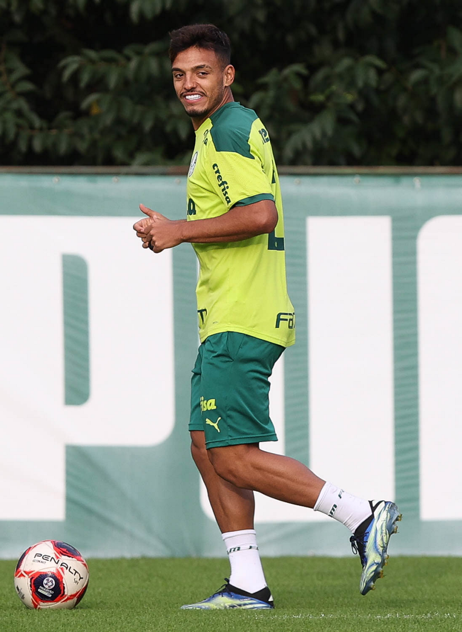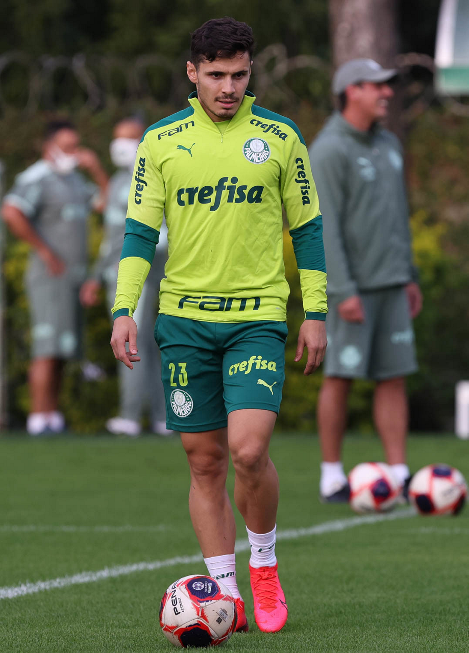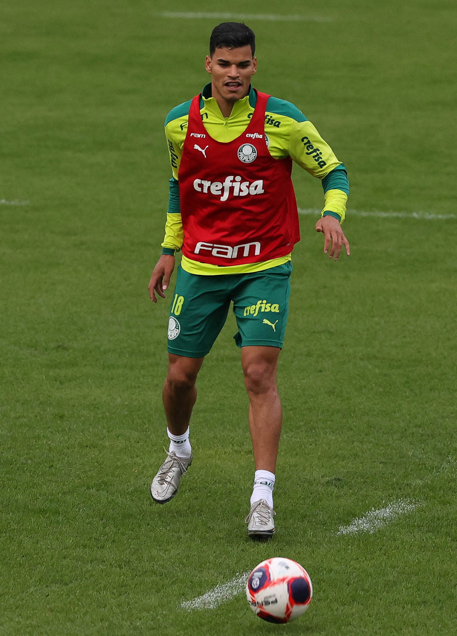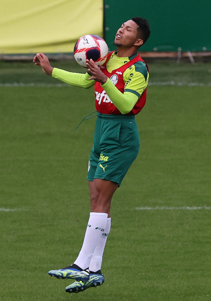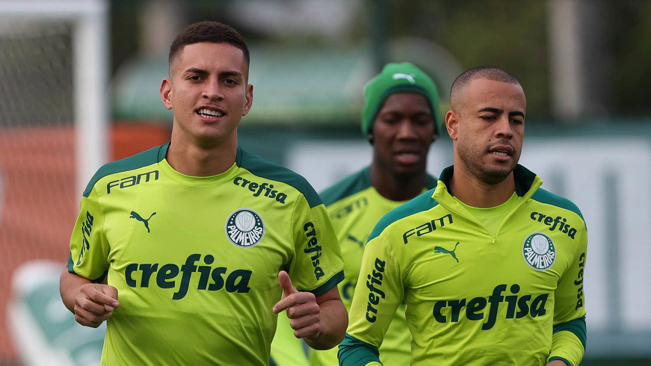 Os jogadores Raphael Veiga, Luan, Danilo Barbosa, Michel, Luiz Adriano e Mayke e o goleiro Weverton (E/D em pé) e Lucas Esteves, Danilo, Gabriel Menino, Lucas Lima e Rony (E/D agachados), da SE Palmeiras, durante treinamento, na Academia de Futebol. (Foto: Cesar Greco)