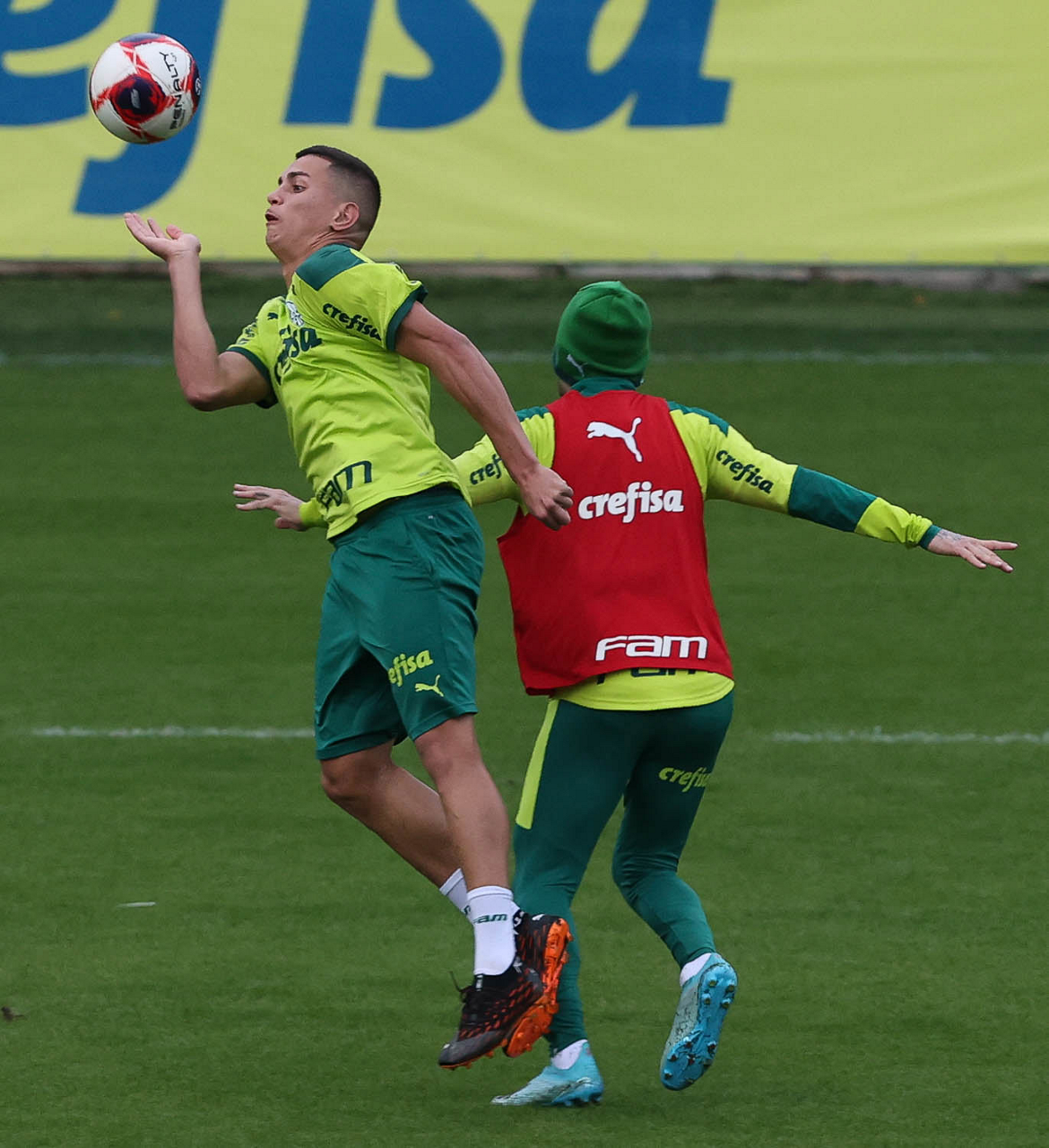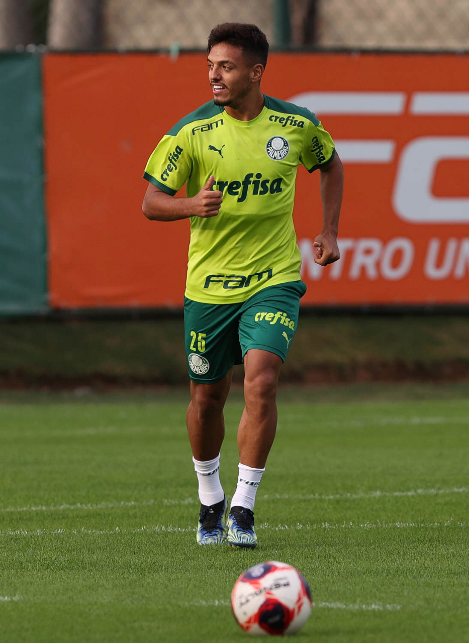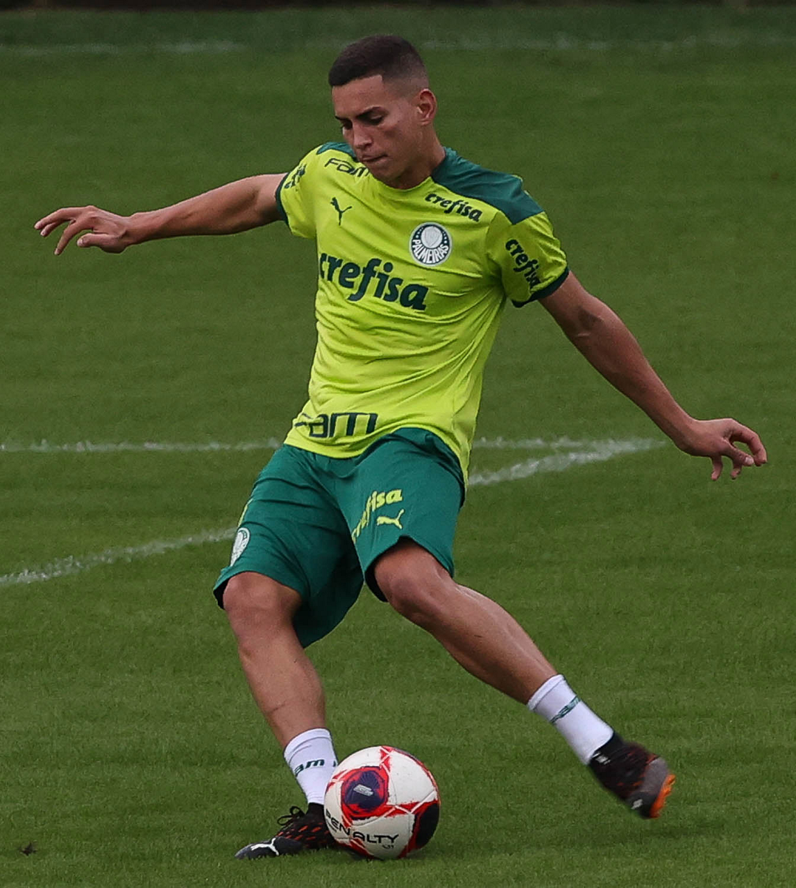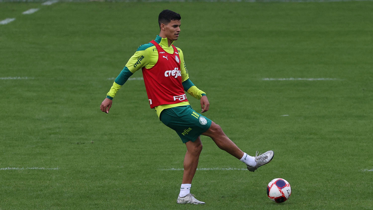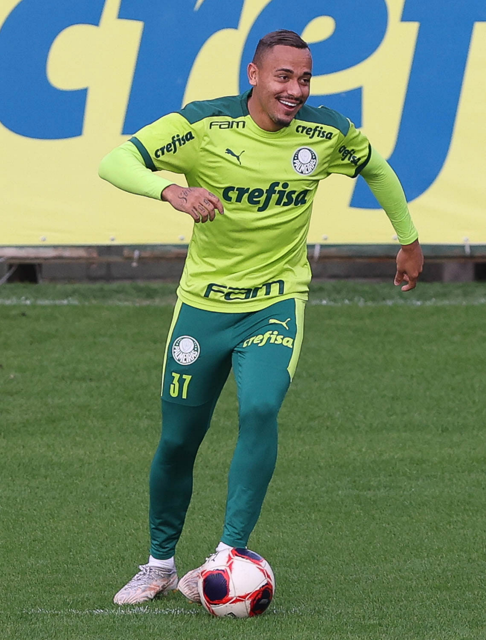 Os jogadores Raphael Veiga, Luan, Danilo Barbosa, Michel, Luiz Adriano e Mayke e o goleiro Weverton (E/D em pé) e Lucas Esteves, Danilo, Gabriel Menino, Lucas Lima e Rony (E/D agachados), da SE Palmeiras, durante treinamento, na Academia de Futebol. (Foto: Cesar Greco)