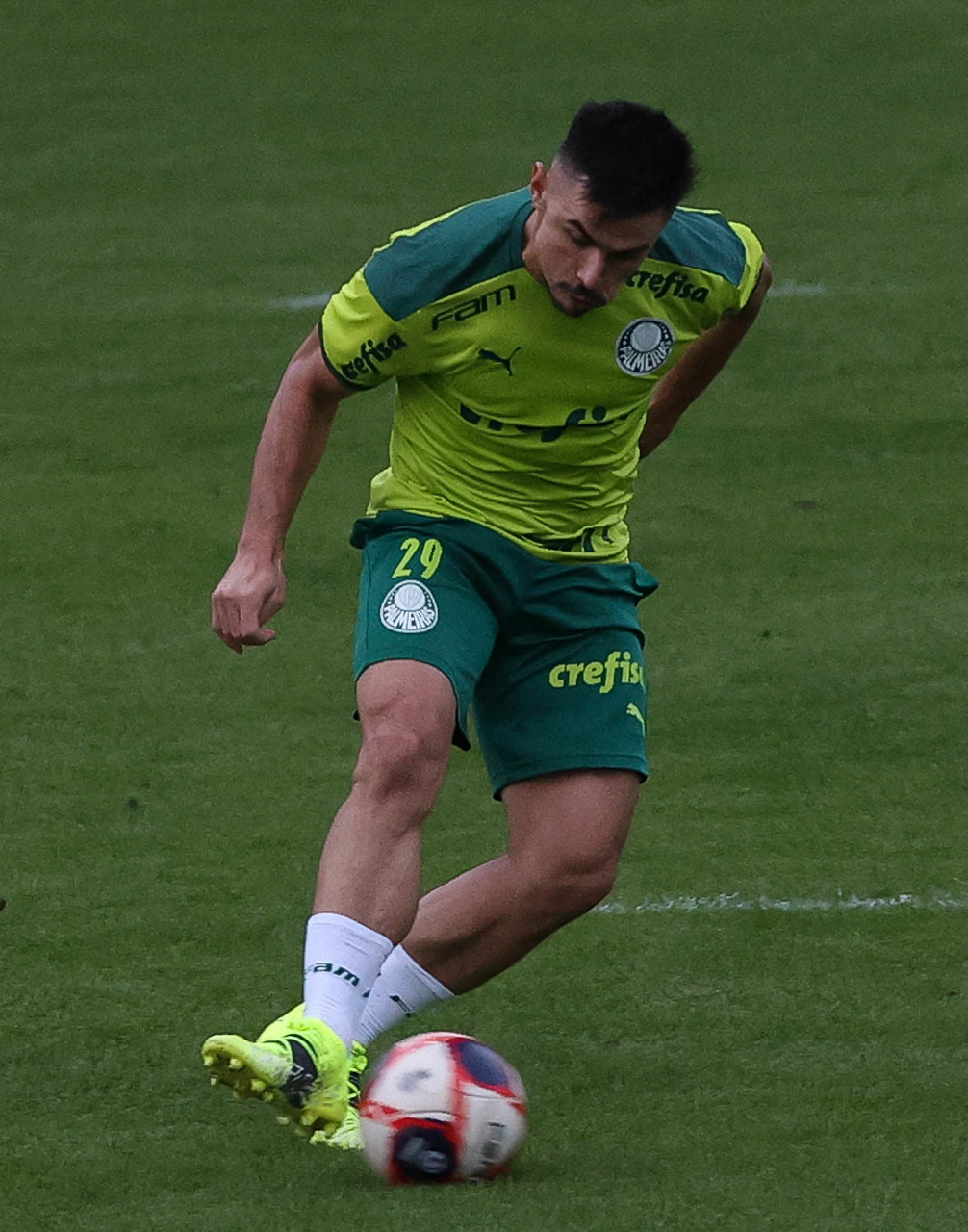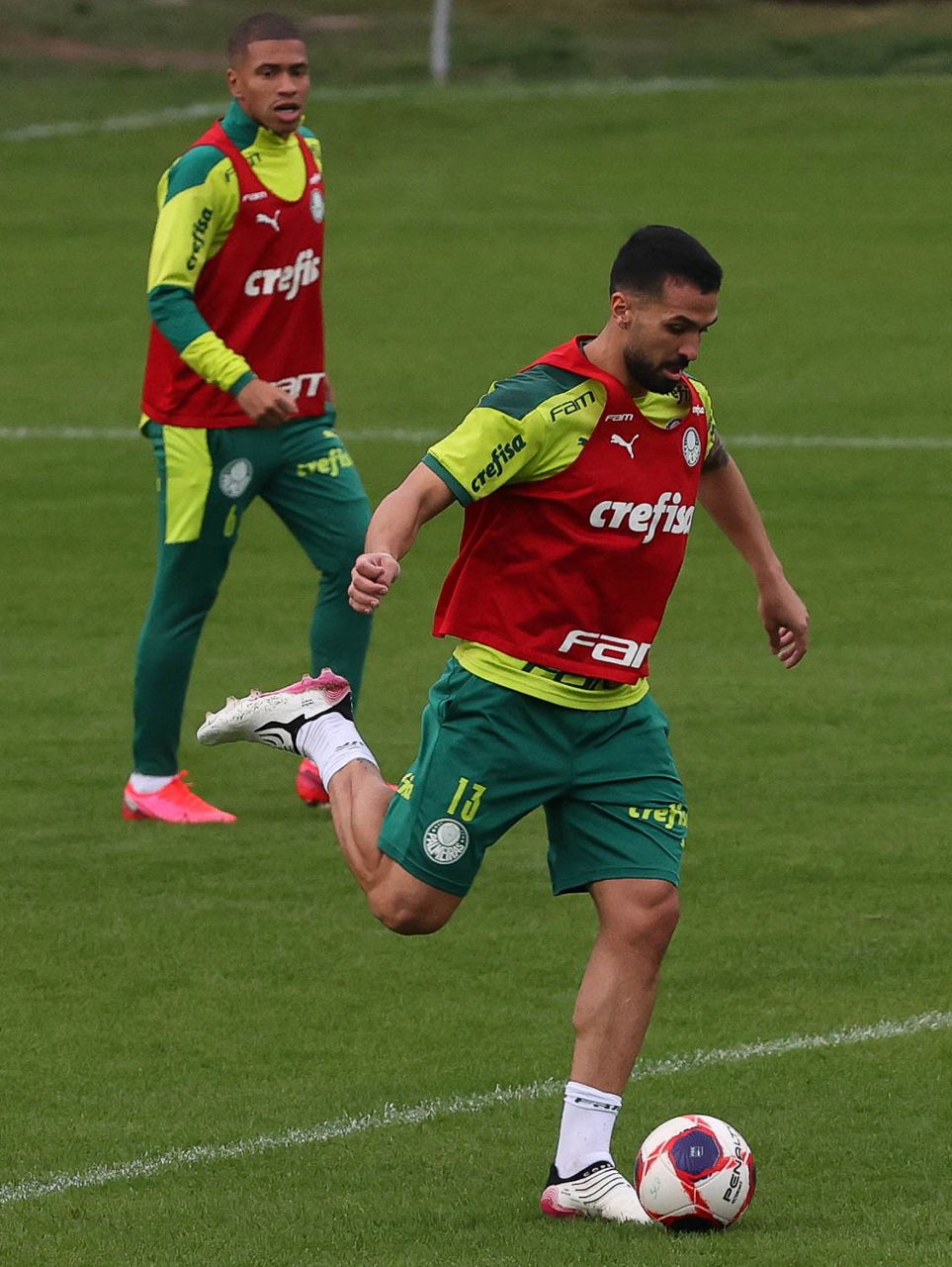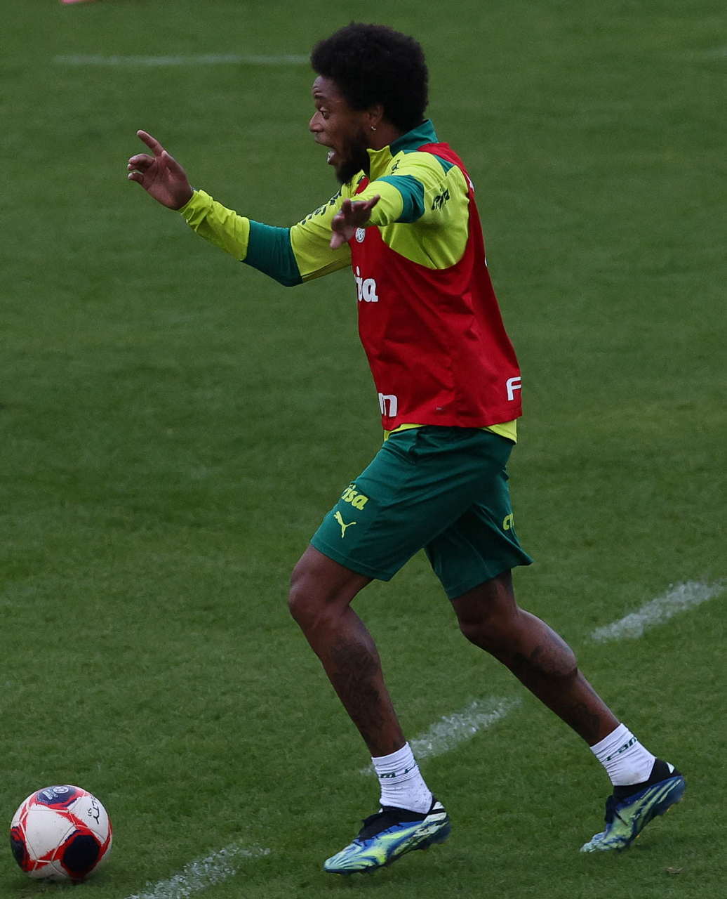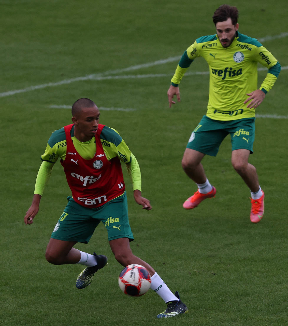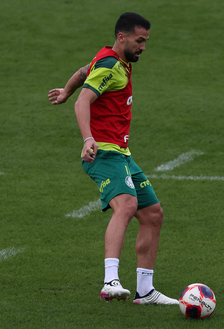 Os jogadores Raphael Veiga, Luan, Danilo Barbosa, Michel, Luiz Adriano e Mayke e o goleiro Weverton (E/D em pé) e Lucas Esteves, Danilo, Gabriel Menino, Lucas Lima e Rony (E/D agachados), da SE Palmeiras, durante treinamento, na Academia de Futebol. (Foto: Cesar Greco)