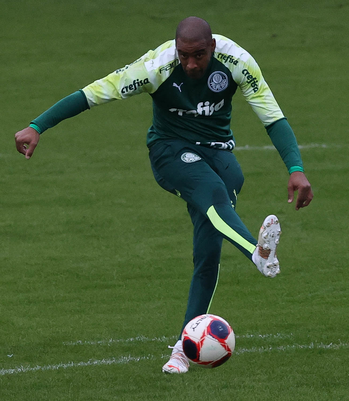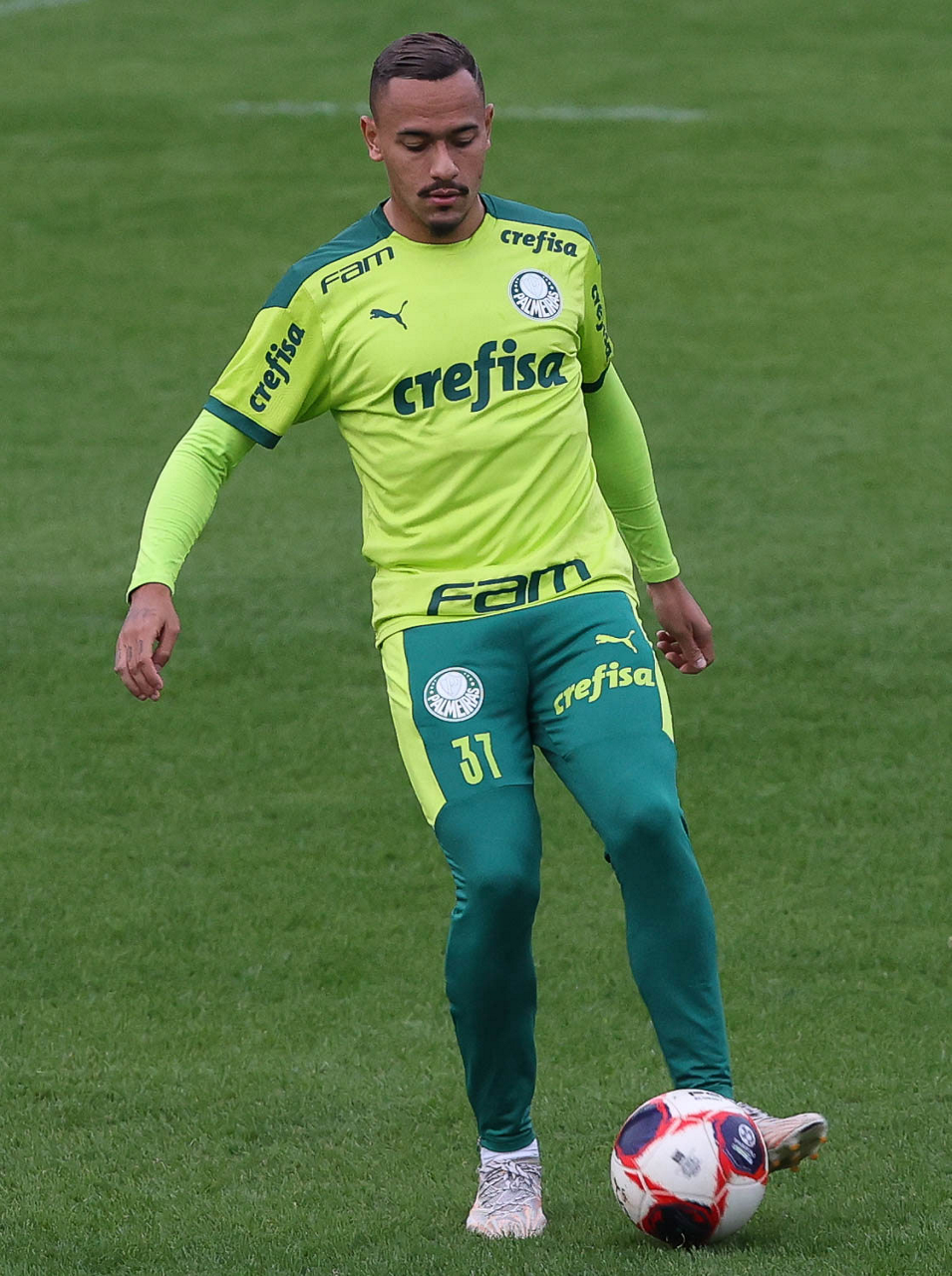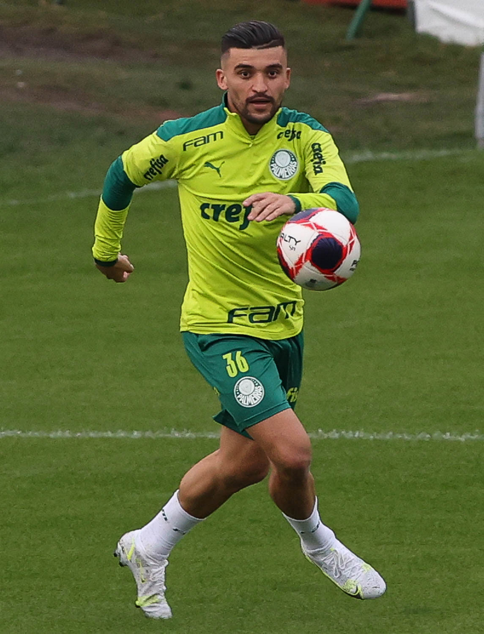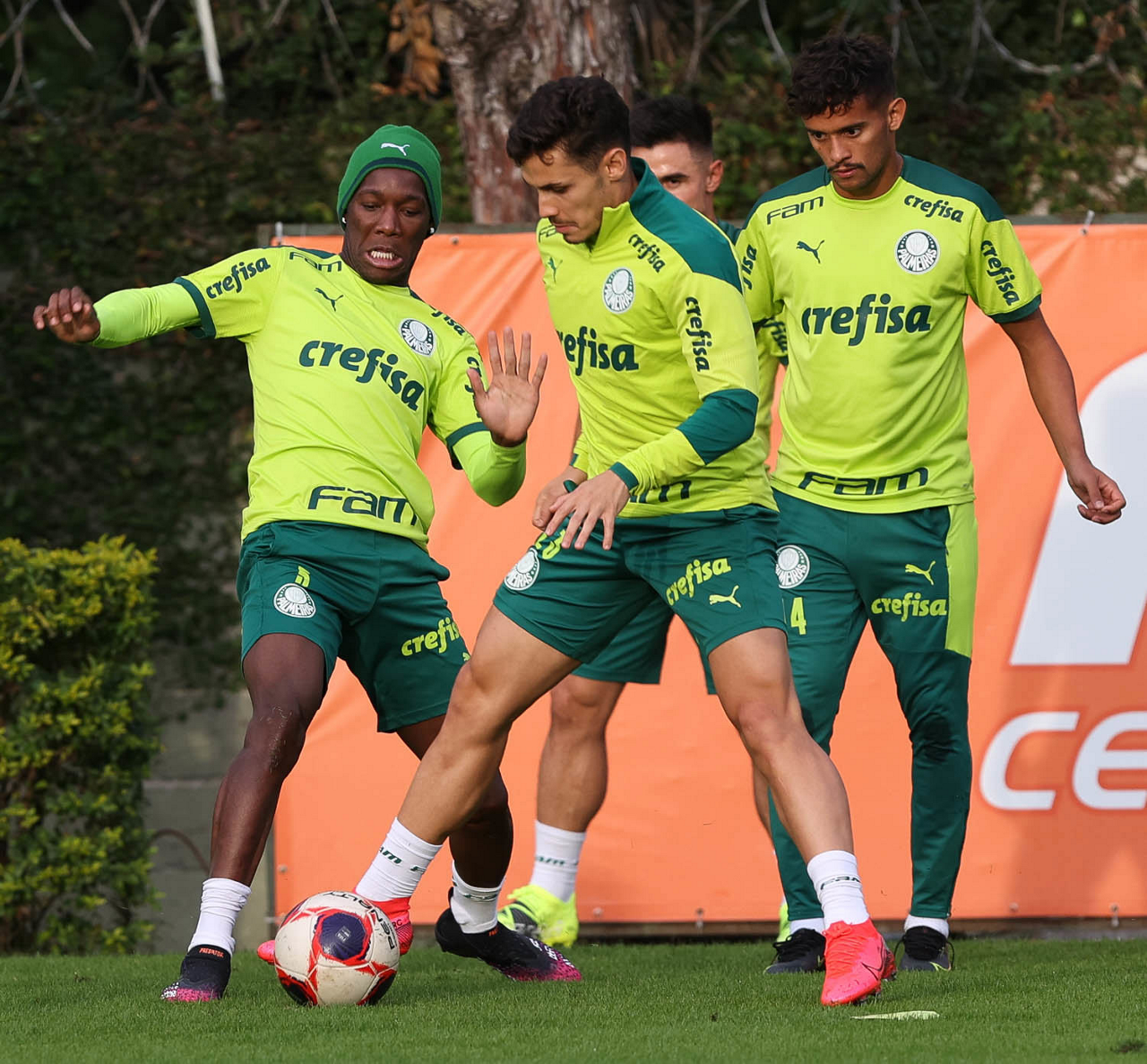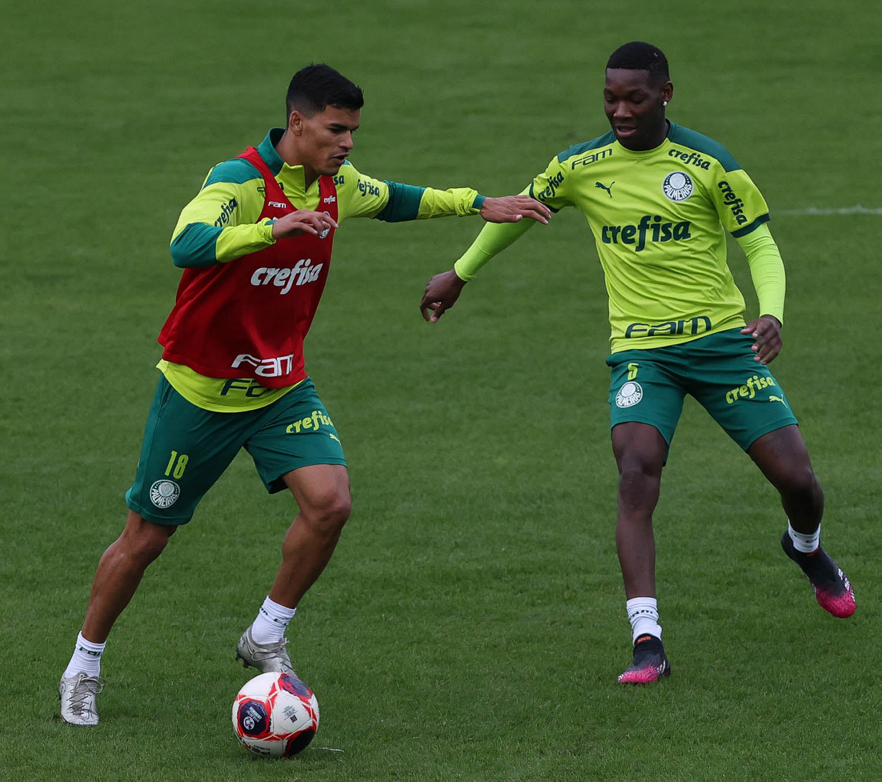 Os jogadores Raphael Veiga, Luan, Danilo Barbosa, Michel, Luiz Adriano e Mayke e o goleiro Weverton (E/D em pé) e Lucas Esteves, Danilo, Gabriel Menino, Lucas Lima e Rony (E/D agachados), da SE Palmeiras, durante treinamento, na Academia de Futebol. (Foto: Cesar Greco)