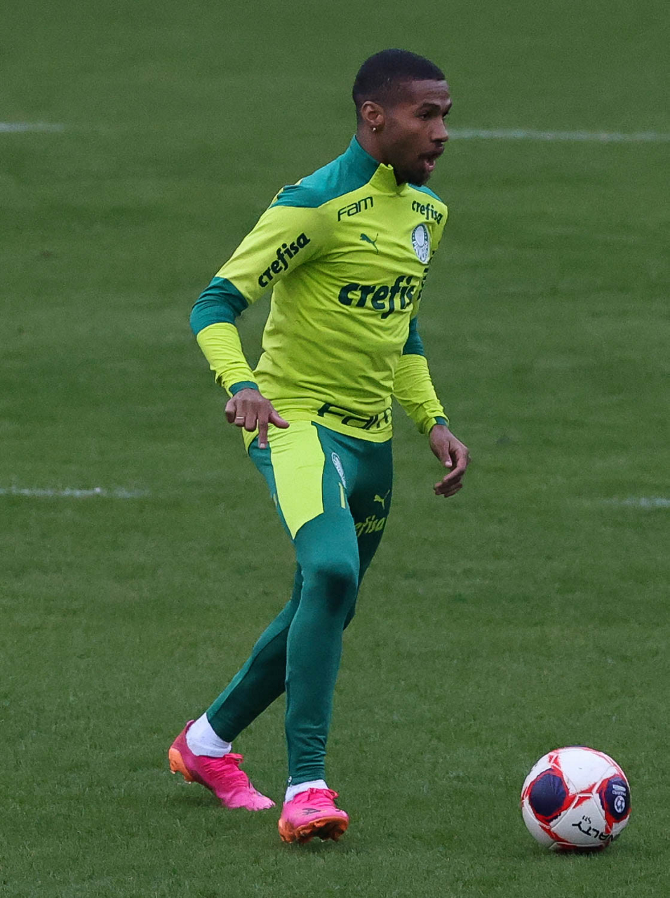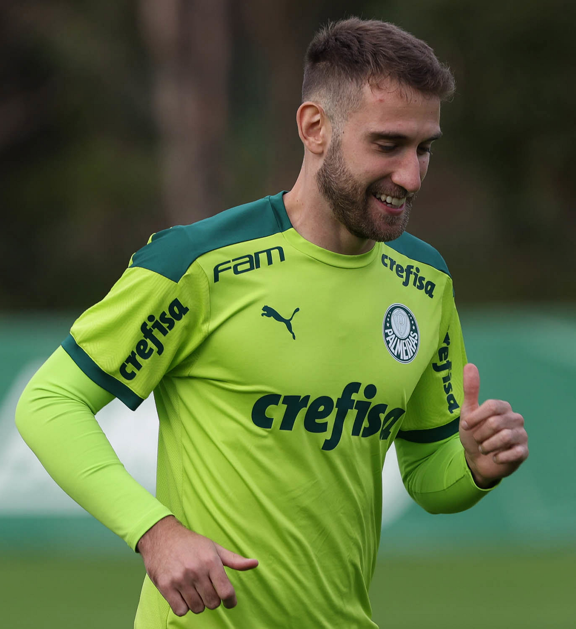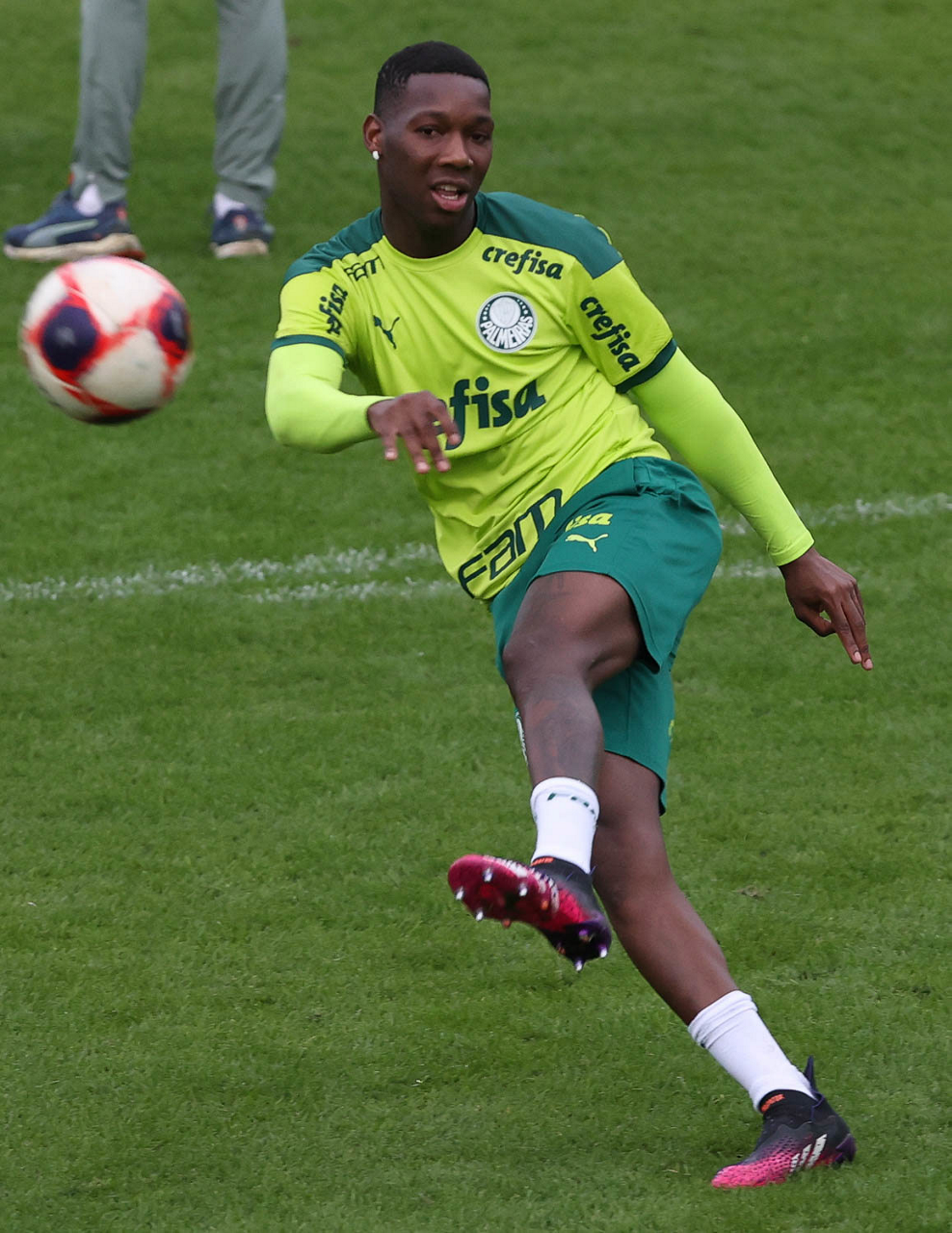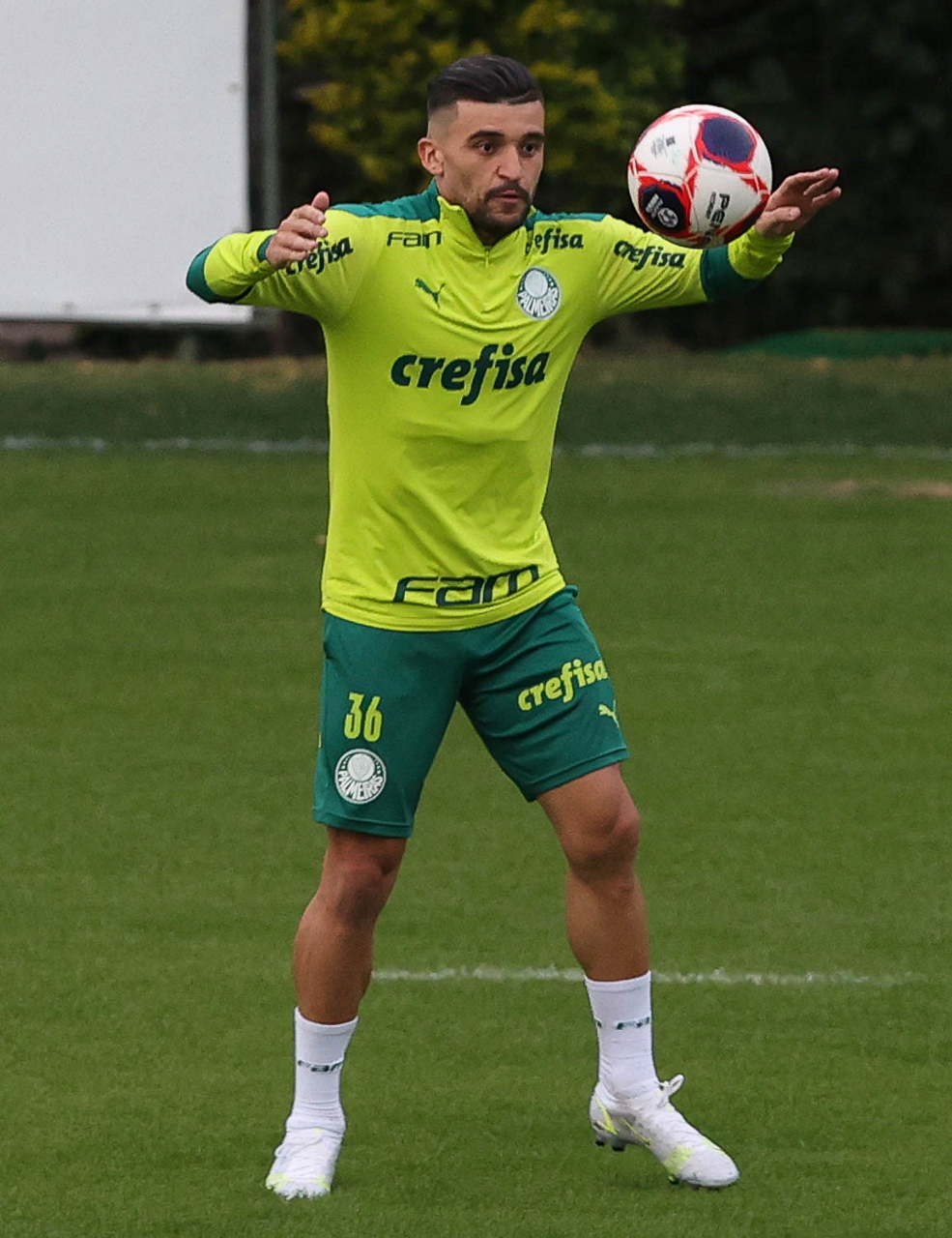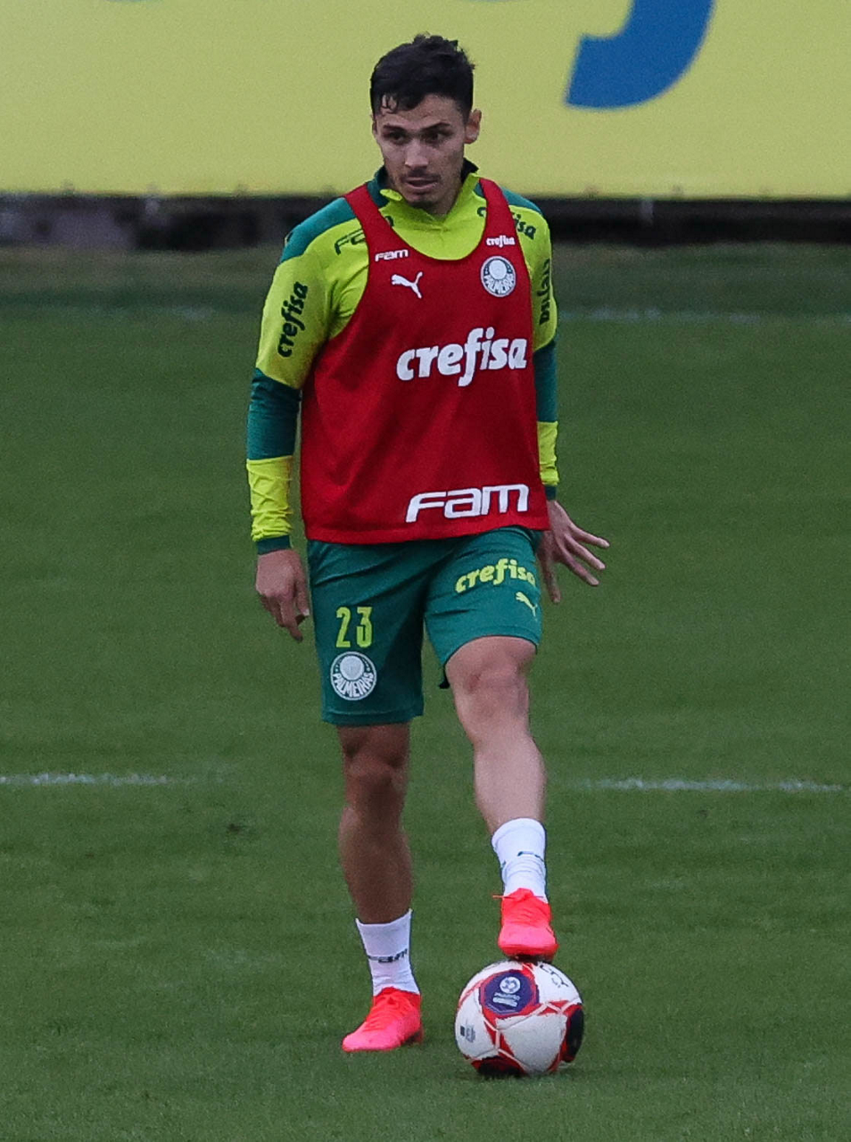Os jogadores Raphael Veiga, Luan, Danilo Barbosa, Michel, Luiz Adriano e Mayke e o goleiro Weverton (E/D em pé) e Lucas Esteves, Danilo, Gabriel Menino, Lucas Lima e Rony (E/D agachados), da SE Palmeiras, durante treinamento, na Academia de Futebol. (Foto: Cesar Greco)