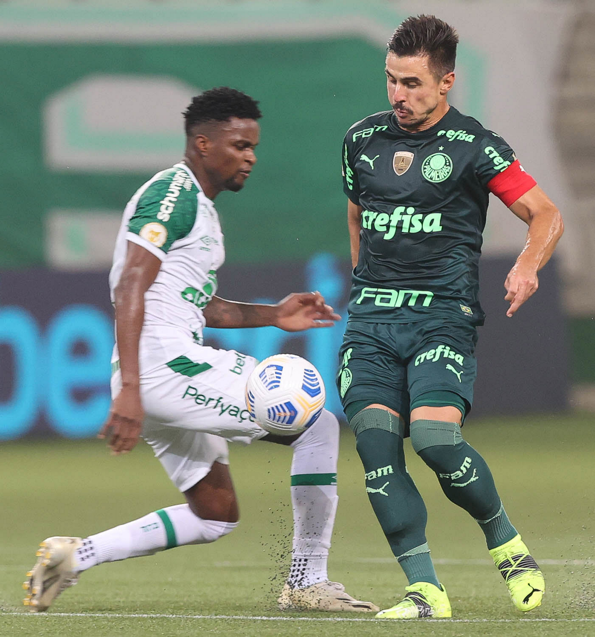 O jogador Wesley, da SE Palmeiras, disputa bola com o jogador, da A Chapecoense F, durante partida válida pela segunda rodada, do Campeonato Brasileiro, Série A, na arena Allainz Parque. (Foto: Cesar Greco)