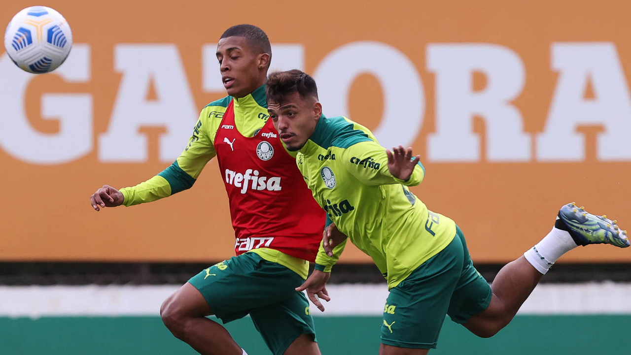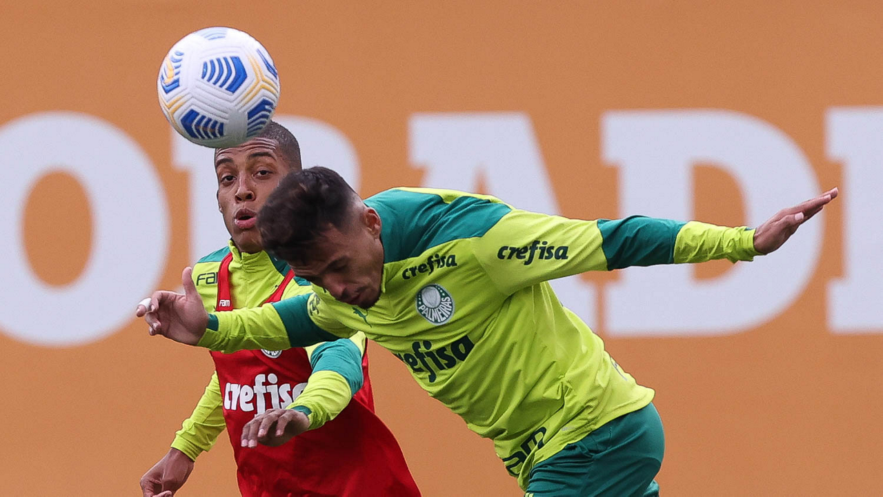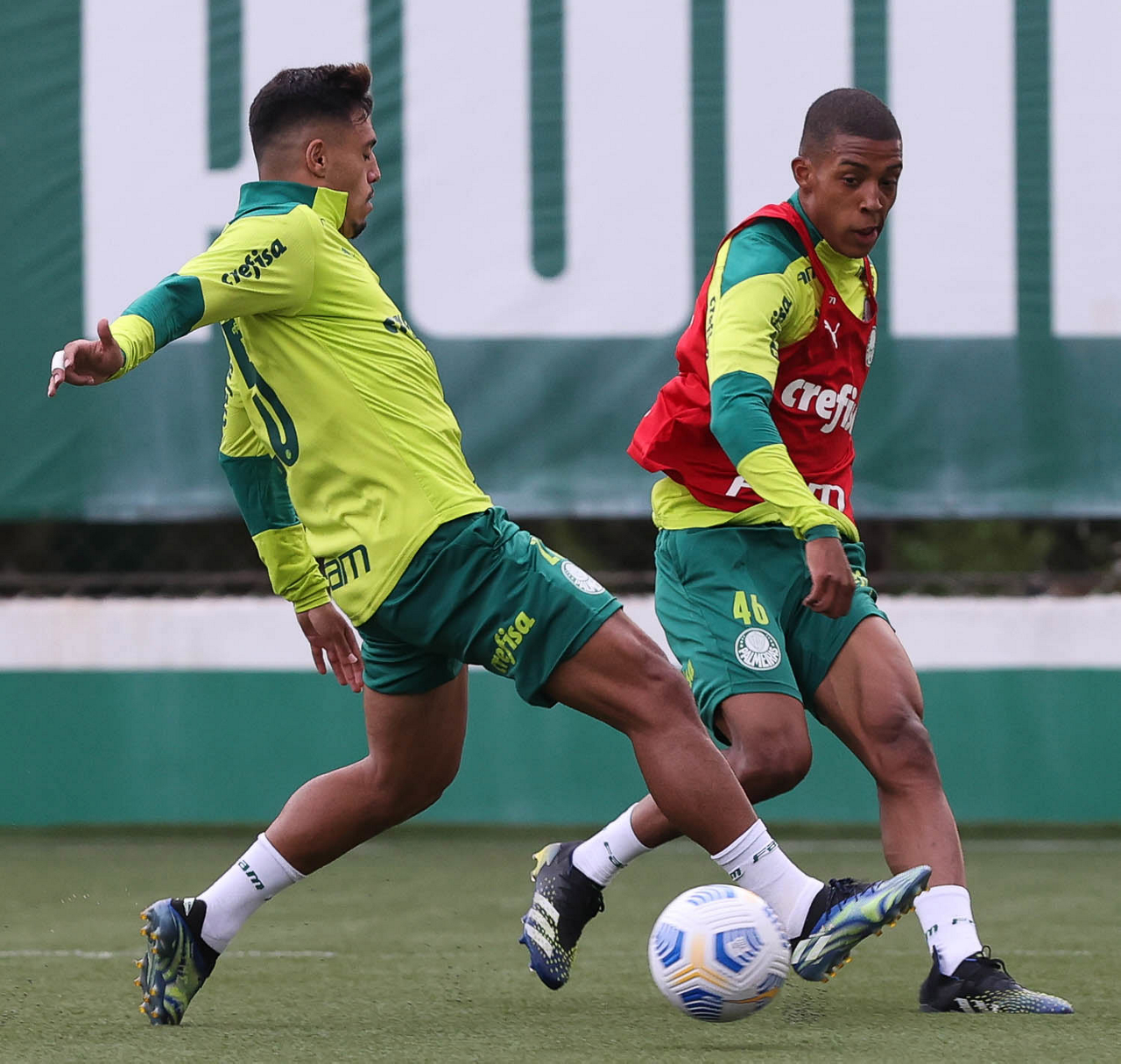 Os jogadores Gabriel Menino e Vanderlan (E), da SE Palmeiras, durante treinamento, na Academia de Futebol. (Foto: Cesar Greco)