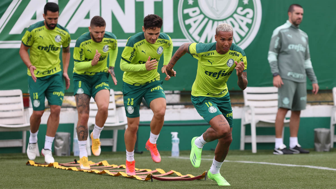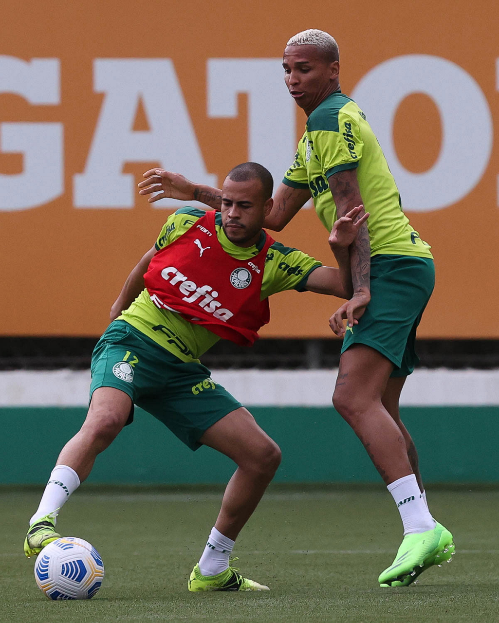 Os jogadores Mayke e Deyverson (D), da SE Palmeiras, durante treinamento, na Academia de Futebol. (Foto: Cesar Greco)