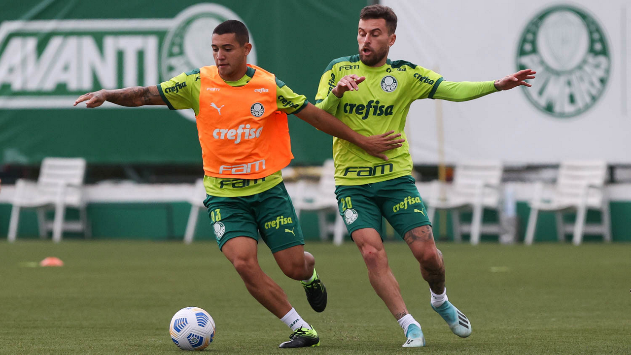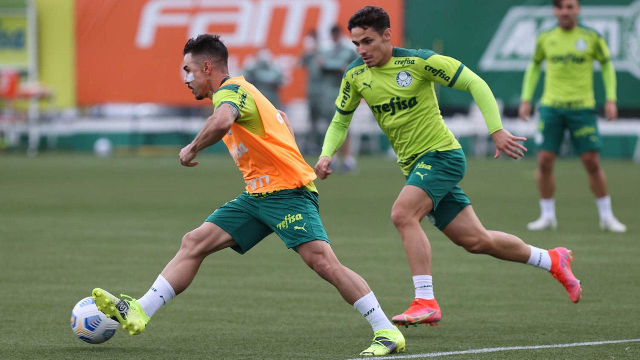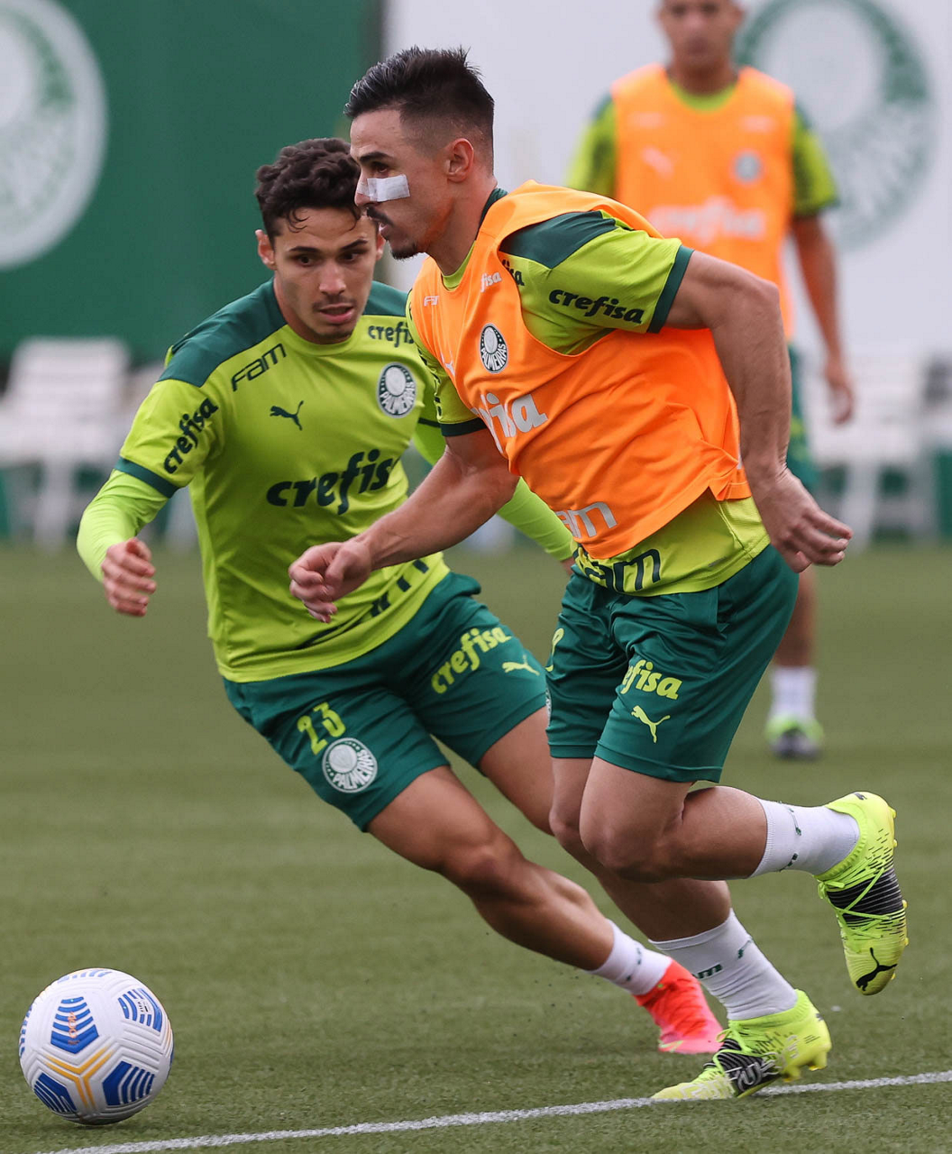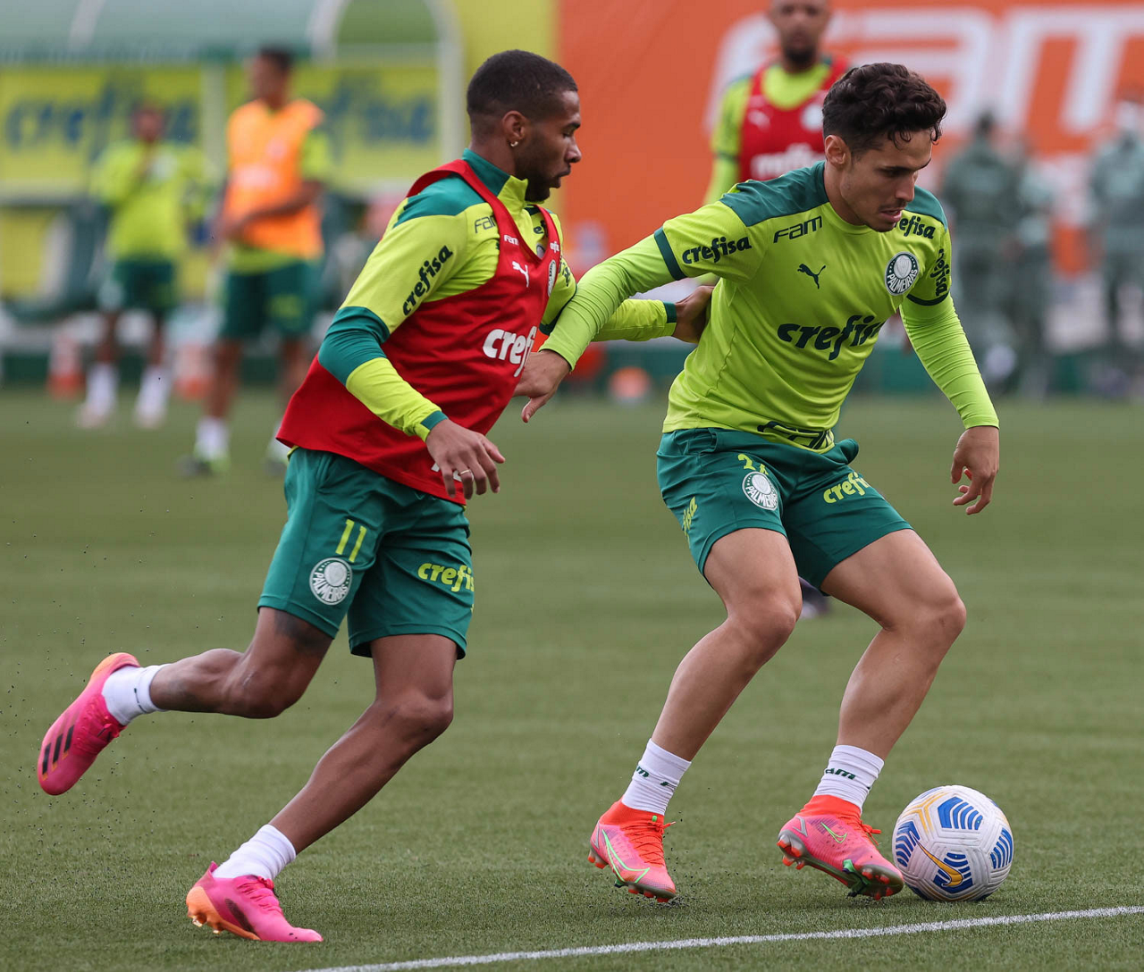 Os jogadores Wesley e Raphael Veiga (D), da SE Palmeiras, durante treinamento, na Academia de Futebol. (Foto: Cesar Greco)