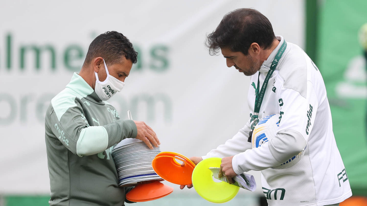 O técnico Abel Ferreira e o roupeiro Benildo (E), da SE Palmeiras, durante treinamento, na Academia de Futebol. (Foto: Cesar Greco)