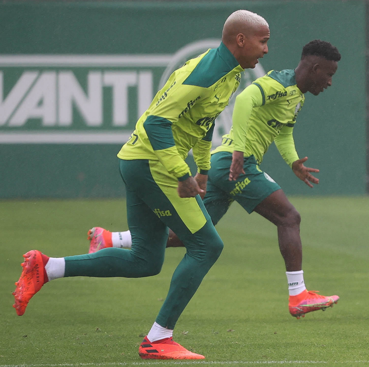 Os jogadores Deyverson e Raphael Veiga (D), da SE Palmeiras, durante treinamento, na Academia de Futebol. (Foto: Cesar Greco)
