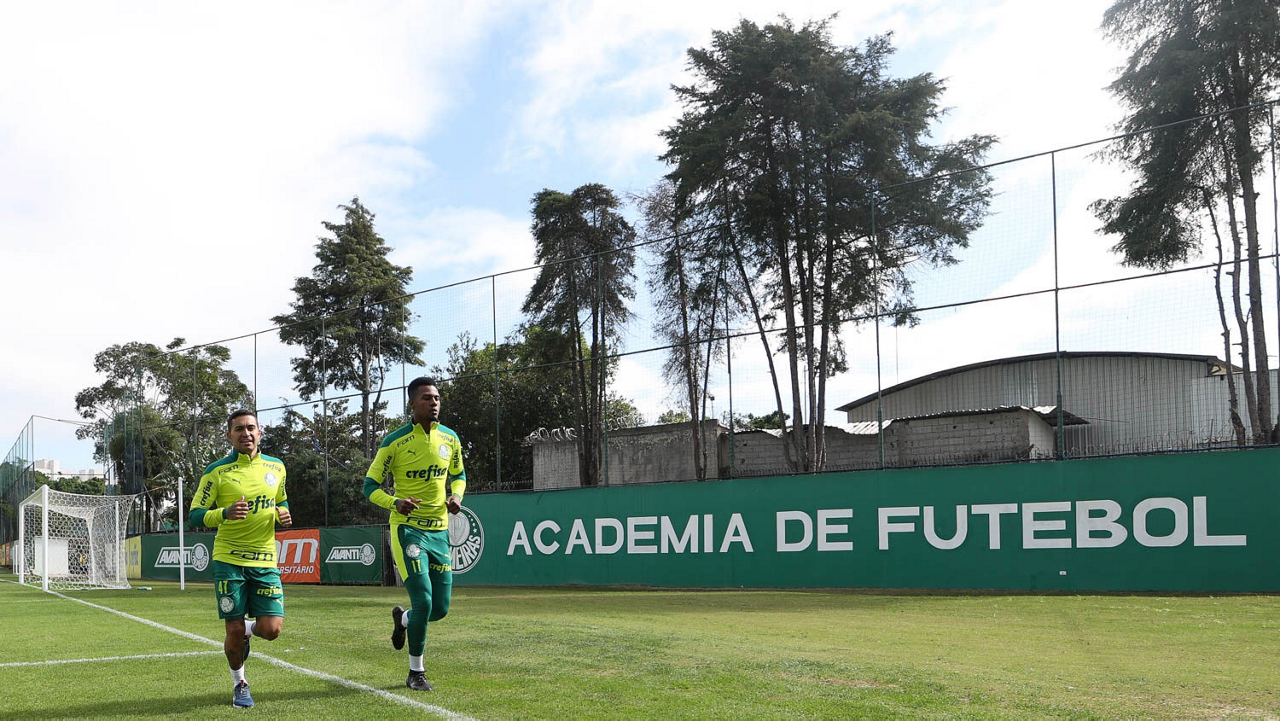 Os jogadores Luan Silva e Pedrão (D), da SE Palmeiras, durante treinamento, na Academia de Futebol. (Foto: Cesar Greco)